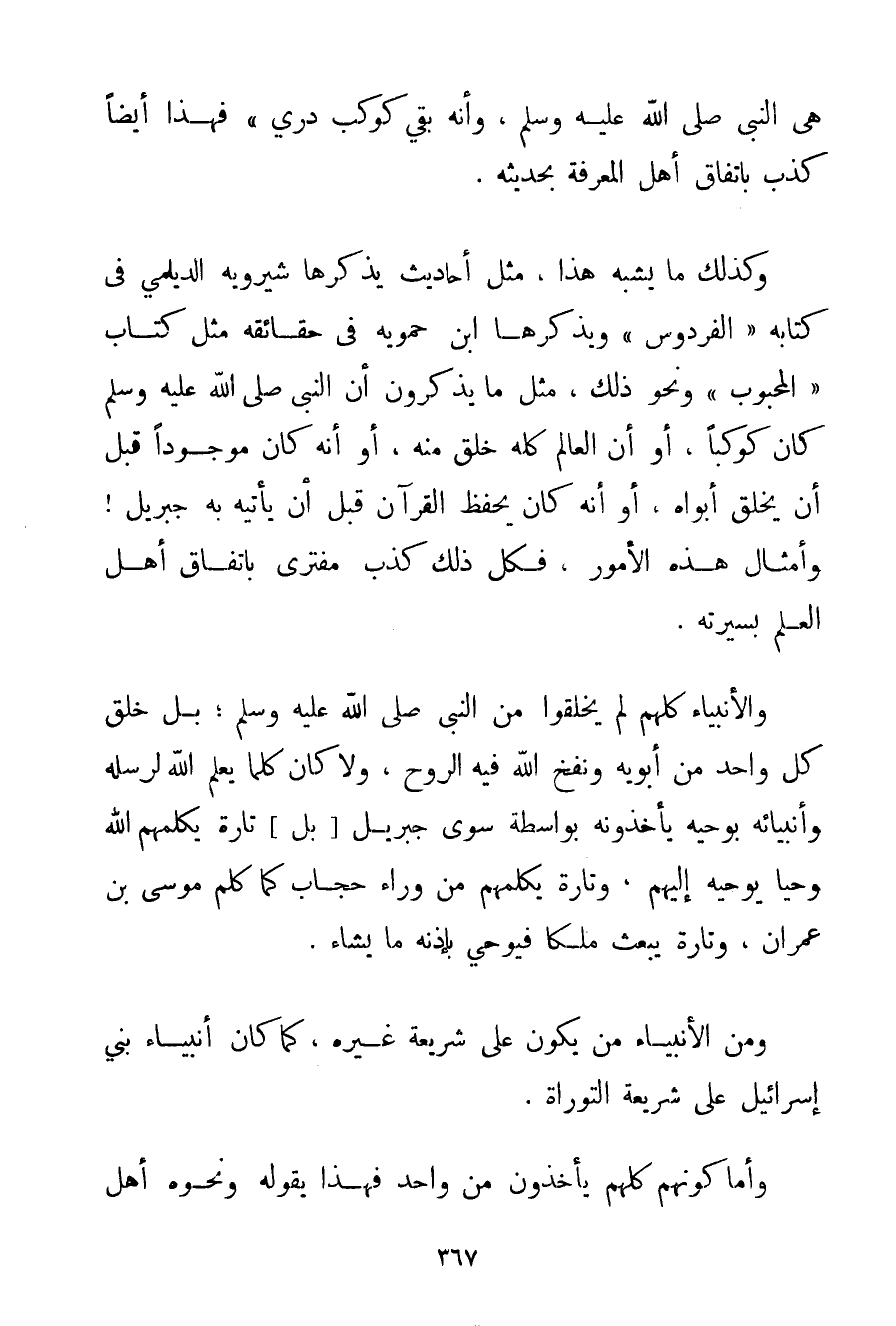هِيَ النَّبِيَّ صَلَّى اللَّهُ عَلَيْهِ وَسَلَّمَ وَأَنَّهُ بَقِيَ كَوْكَبٌ دُرِّيٌّ " فَهَذَا أَيْضًا كَذِبٌ بِاتِّفَاقِ أَهْلِ الْمَعْرِفَةِ. بِحَدِيثِهِ. وَكَذَلِكَ مَا يُشْبِهُ هَذَا مِثْلُ أَحَادِيثَ يَذْكُرُهَا شيرويه الديلمي فِي كِتَابِهِ " الْفِرْدَوْسُ " وَيَذْكُرُهَا ابْنُ حَمَوَيْهِ فِي حَقَائِقِهِ مِثْلَ كِتَابِ " الْمَحْبُوبُ " وَنَحْوَ ذَلِكَ مِثْلَ مَا يَذْكُرُونَ أَنَّ النَّبِيَّ صَلَّى اللَّهُ عَلَيْهِ وَسَلَّمَ كَانَ كَوْكَبًا أَوْ أَنَّ الْعَالَمَ كُلَّهُ خُلِقَ مِنْهُ أَوْ أَنَّهُ كَانَ مَوْجُودًا قَبْلَ أَنْ يَخْلُقَ أَبَوَاهُ أَوْ أَنَّهُ كَانَ يَحْفَظُ الْقُرْآنَ قَبْلَ أَنْ يَأْتِيَهُ بِهِ جِبْرِيلُ؛ وَأَمْثَالُ هَذِهِ الْأُمُورِ فَكُلُّ ذَلِكَ كَذِبٌ مُفْتَرًى بِاتِّفَاقِ أَهْلِ الْعِلْم بِسِيرَتِهِ. وَالْأَنْبِيَاءُ كُلُّهُمْ لَمْ يُخْلَقُوا مِنْ النَّبِيِّ صَلَّى اللَّهُ عَلَيْهِ وَسَلَّمَ بَلْ خُلِقَ كُلُّ وَاحِدٍ مِنْ أَبَوَيْهِ وَنَفَخَ اللَّهُ فِيهِ الرُّوحَ وَلَا كَانَ كُلَّمَا يُعَلِّمُ اللَّهُ لِرُسُلِهِ وَأَنْبِيَائِهِ بِوَحْيِهِ يَأْخُذُونَهُ بِوَاسِطَةِ سِوَى جِبْرِيلَ بَلْ تَارَةً يُكَلِّمُهُمْ اللَّهُ وَحْيًا يُوحِيه إلَيْهِمْ وَتَارَةً يُكَلِّمُهُمْ مِنْ وَرَاءِ حِجَابٍ كَمَا كَلَّمَ مُوسَى بْنَ عِمْرَانَ وَتَارَةً يَبْعَثُ مَلِكًا فَيُوحِي بِإِذْنِهِ مَا يَشَاءُ. . وَمِنْ الْأَنْبِيَاءِ مَنْ يَكُونُ عَلَى شَرِيعَةِ غَيْرِهِ كَمَا كَانَ أَنْبِيَاءُ بَنِي إسْرَائِيلَ عَلَى شَرِيعَةِ التَّوْرَاةِ. وَأَمَّا كَوْنُهُمْ كُلُّهُمْ يَأْخُذُونَ مِنْ وَاحِدٍ فَهَذَا يَقُولُهُ وَنَحْوَهُ أَهْلُ