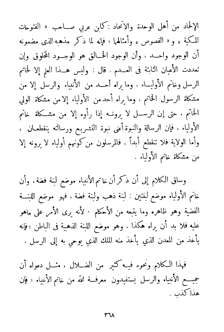 الْإِلْحَادِ مِنْ أَهْلِ الْوَحْدَةِ وَالِاتِّحَادِ: كَابْنِ عَرَبِيٍّ صَاحِبِ " الْفُتُوحَاتِ الْمَكِّيَّةِ " و " الْفُصُوصِ " وَأَمْثَالِهِمَا؛ فَإِنَّهُ لَمَّا ذُكِرَ مَذْهَبُهُ الَّذِي مَضْمُونُهُ أَنَّ الْوُجُودَ وَاحِدٌ وَأَنَّ الْوُجُودَ الْخَالِقَ هُوَ الْوُجُودُ الْمَخْلُوقُ وَإِنْ تَعَدَّدَتْ الْأَعْيَانُ الثَّابِتَةُ فِي الْعَدَمِ. قَالَ: وَلَيْسَ هَذَا الْعِلْمُ إلَّا لِخَاتَمِ الرُّسُلِ وَخَاتَمِ الْأَوْلِيَاءِ وَمَا يَرَاهُ أَحَدٌ مِنْ الْأَنْبِيَاءِ وَالرُّسُلِ إلَّا مِنْ مِشْكَاةِ الرَّسُولِ الْخَاتَمِ وَمَا يَرَاهُ أَحَدٌ مِنْ الْأَوْلِيَاءِ إلَّا مِنْ مِشْكَاةِ الْوَلِيِّ الْخَاتَمِ حَتَّى أَنَّ الرُّسُلَ لَا يَرَوْنَهُ إذَا رَأَوْهُ إلَّا مِنْ مِشْكَاةٍ خَاتَمِ الْأَوْلِيَاءِ فَإِنَّ الرِّسَالَةَ وَالنُّبُوَّةَ أَعْنِي نُبُوَّةَ التَّشْرِيعِ وَرِسَالَتِهِ يَنْقَطِعَانِ وَأَمَّا الْوِلَايَةُ فَلَا تَنْقَطِعُ أَبَدًا فَالْمُرْسَلُونَ مِنْ كَوْنِهِمْ أَوْلِيَاءَ لَا يَرَوْنَهُ إلَّا مِنْ مِشْكَاةِ خَاتَمِ الْأَوْلِيَاءِ. وَسَاقَ الْكَلَامَ إلَى أَنْ ذَكَرَ أَنَّ خَاتَمَ الْأَنْبِيَاءِ مَوْضِعُ لَبِنَةِ فِضَّةٍ وَأَنَّ خَاتَمَ الْأَوْلِيَاءِ مَوْضِعُ لِبِنْتَيْنِ: لَبِنَةِ ذَهَبٍ وَلَبِنَةِ فِضَّةٍ فَهُوَ مَوْضِعُ اللَّبِنَةِ الْفِضِّيَّةِ وَهُوَ ظَاهِرُهُ وَمَا يَتْبَعُهُ مِنْ الْأَحْكَامِ لِأَنَّهُ يَرَى الْأَمْرَ عَلَى مَا هُوَ عَلَيْهِ فَلَا بُدَّ أَنْ يَرَاهُ هَكَذَا وَهُوَ مَوْضِعُ اللَّبِنَةِ الذَّهَبِيَّةِ فِي الْبَاطِنِ؛ فَإِنَّهُ يَأْخُذُ مِنْ الْمَعْدِنِ الَّذِي يَأْخُذُ مِنْهُ الْمُلْكَ الَّذِي يُوحِي بِهِ إلَى الرُّسُلِ. فَهَذَا الْكَلَامُ وَنَحْوُهُ فِيهِ كَثِيرٌ مِنْ الضَّلَالِ مِثْلَ دَعْوَاهُ أَنَّ جَمِيعَ الْأَنْبِيَاءِ وَالرُّسُلِ يَسْتَفِيدُونَ مَعْرِفَةَ اللَّهِ مِنْ خَاتَمِ الْأَنْبِيَاءِ؛ فَإِنَّ هَذَا كَذِبٌ.