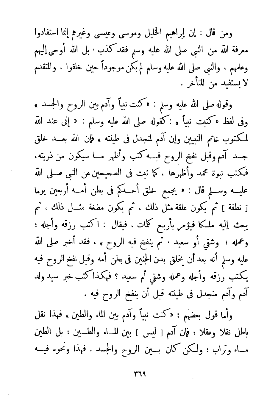 وَمَنْ قَالَ: إنَّ إبْرَاهِيمَ الْخَلِيلَ وَمُوسَى وَعِيسَى وَغَيْرَهُمْ إنَّمَا اسْتَفَادُوا مَعْرِفَةَ اللَّهِ مِنْ النَّبِيِّ صَلَّى اللَّهُ عَلَيْهِ وَسَلَّمَ فَقَدْ كَذَّبَ بَلْ اللَّهُ أَوْحَى إلَيْهِمْ وَعَلَّمَهُمْ وَالنَّبِيُّ صَلَّى اللَّهُ عَلَيْهِ وَسَلَّمَ لَمْ يَكُنْ مَوْجُودًا حِينَ خُلِقُوا وَالْمُتَقَدِّمُ لَا يَسْتَفِيدُ مِنْ الْمُتَأَخِّرِ. {وَقَوْلُهُ صَلَّى اللَّهُ عَلَيْهِ وَسَلَّمَ كُنْت نَبِيًّا وَآدَمُ بَيْنَ الرُّوحِ وَالْجَسَدِ} وَفِي لَفْظٍ {كُتِبْت نَبِيًّا} كَقَوْلِهِ صَلَّى اللَّهُ عَلَيْهِ وَسَلَّمَ {إنِّي عِنْدَ اللَّه لَمَكْتُوبٌ خَاتَمُ النَّبِيِّينَ وَإِنَّ آدَمَ لَمُنْجَدِلٌ فِي طِينَتِهِ} فَإِنَّ اللَّهَ خَلَقَ جَسَدَ آدَمَ وَقَبْلَ نَفْخِ الرُّوحِ فِيهِ كَتَبَ وَأَظْهَرَ مَا سَيَكُونُ مِنْ ذُرِّيَّتِهِ فَكَتَبَ نُبُوَّةَ مُحَمَّدٍ وَأَظْهَرَهَا كَمَا ثَبَتَ فِي الصَّحِيحَيْنِ عَنْ النَّبِيِّ صَلَّى اللَّهُ عَلَيْهِ وَسَلَّمَ قَالَ: {يُجْمَعُ خَلْقُ أَحَدِكُمْ فِي بَطْنِ أُمِّهِ أَرْبَعِينَ يَوْمًا نُطْفَةً ثُمَّ يَكُونُ عَلَقَةً مِثْلَ ذَلِكَ ثُمَّ يَكُونُ مُضْغَةً مِثْلَ ذَلِكَ ثُمَّ يُبْعَثُ إلَيْهِ مَلَكًا فَيُؤْمَرُ بِأَرْبَعِ كَلِمَاتٍ فَيُقَالُ: اُكْتُبْ رِزْقَهُ وَأَجَلَهُ؛ وَعَمَلَهُ؛ وَشَقِيٌّ أَوْ سَعِيدٌ ثُمَّ يُنْفَخُ فِيهِ الرُّوحُ} فَقَدْ أَخْبَرَ صَلَّى اللَّهُ عَلَيْهِ وَسَلَّمَ أَنَّهُ بَعْدَ أَنْ يَخْلُقَ بَدَنَ الْجَنِينِ فِي بَطْنِ أُمِّهِ وَقَبْلَ نَفْخِ الرُّوحِ فِيهِ يُكْتَبُ رِزْقُهُ وَأَجَلُهُ وَعَمَلُهُ وَشَقِيٌّ أَمْ سَعِيدٌ؟ فَهَكَذَا كُتِبَ خَبَرُ سَيِّدِ وَلَدِ آدَمَ وَآدَمُ مُنْجَدِلٌ فِي طِينَتِهِ قَبْل أَنْ يُنْفَخَ الرُّوحُ فِيهِ. وَأَمَّا قَوْلُ بَعْضِهِمْ: {كُنْت نَبِيًّا وَآدَمُ بَيْنَ الْمَاءِ وَالطِّينِ} فَهَذَا نَقْلٌ بَاطِلٌ نَقْلًا وَعَقْلًا؛ فَإِنَّ آدَمَ لَيْسَ بَيْنَ الْمَاءِ وَالطِّينِ؛ بَلْ الطِّينُ مَاءٌ وَتُرَابٌ؛ وَلَكِنْ كَانَ بَيْنَ الرُّوحِ وَالْجَسَدِ. فَهَذَا وَنَحْوُهُ فِيهِ