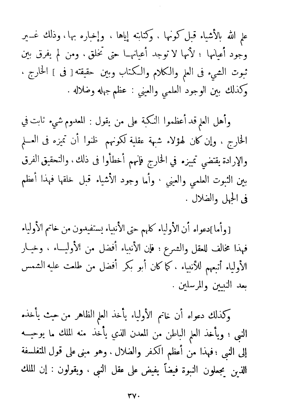 عِلْمُ اللَّهِ بِالْأَشْيَاءِ قَبْلَ كَوْنِهَا وَكِتَابَتِهِ إيَّاهَا وَإِخْبَارِهِ بِهَا وَذَلِكَ غَيْرُ وُجُودِ أَعْيَانِهَا؛ لِأَنَّهَا لَا تُوجَدُ أَعْيَانُهَا حَتَّى تُخْلَقَ وَمَنْ لَمْ يُفَرِّقْ بَيْنَ ثُبُوتِ الشَّيْءِ فِي الْعِلْمِ وَالْكَلَامِ وَالْكِتَابِ وَبَيْنَ حَقِيقَتِهِ فِي الْخَارِجِ وَكَذَلِكَ بَيْنَ الْوُجُودِ الْعِلْمِيِّ وَالْعَيْنِيِّ: عَظُمَ جَهْلُهُ وَضَلَالُهُ. وَأَهْلُ الْعِلْمِ قَدْ أَعْظَمُوا النَّكْبَةَ عَلَى مَنْ يَقُولُ: الْمَعْدُومُ شَيْءٌ ثَابِتٌ فِي الْخَارِجِ وَإِنْ كَانَ لِهَؤُلَاءِ شُبْهَةٌ عَقْلِيَّةٌ لِكَوْنِهِمْ ظَنُّوا أَنَّ تَمَيُّزَهُ فِي الْعِلْمِ وَالْإِرَادَةِ يَقْتَضِي تَمْيِيزَهُ فِي الْخَارِجِ فَإِنَّهُمْ أَخْطَئُوا فِي ذَلِكَ وَالتَّحْقِيقُ الْفَرْقُ بَيْنَ الثُّبُوتِ الْعِلْمِيِّ وَالْعَيْنِيِّ وَأَمَّا وُجُودُ الْأَشْيَاءِ قَبْلَ خَلْقِهَا فَهَذَا أَعْظَمُ فِي الْجَهْلِ وَالضَّلَالِ. وَأَمَّا دَعْوَاهُ أَنَّ الْأَوْلِيَاءَ كُلَّهُمْ حَتَّى الْأَنْبِيَاءُ يَسْتَفِيدُونَ مِنْ خَاتَمِ الْأَوْلِيَاءِ فَهَذَا مُخَالِفٌ لِلْعَقْلِ وَالشَّرْعِ؛ فَإِنَّ الْأَنْبِيَاءَ أَفْضَلُ مِنْ الْأَوْلِيَاءِ وَخِيَارُ الْأَوْلِيَاءِ أَتْبَعُهُمْ لِلْأَنْبِيَاءِ كَمَا كَانَ أَبُو بَكْرٍ أَفْضَلُ مَنْ طَلَعَتْ عَلَيْهِ الشَّمْسُ بَعْدَ النَّبِيِّينَ وَالْمُرْسَلِينَ. وَكَذَلِكَ دَعْوَاهُ أَنَّ خَاتَمَ الْأَوْلِيَاءِ يَأْخُذُ الْعِلْمَ الظَّاهِرَ مِنْ حَيْثُ يَأْخُذُهُ النَّبِيُّ؛ وَيَأْخُذُ الْعِلْمَ الْبَاطِنَ مِنْ الْمَعْدِنِ الَّذِي يَأْخُذُ مِنْهُ الْمُلْكَ مَا يُوحِيه إلَى النَّبِيِّ؛ فَهَذَا مِنْ أَعْظَمِ الْكُفْرِ وَالضَّلَالِ وَهُوَ مَبْنِيٌّ عَلَى قَوْلِ الْمُتَفَلْسِفَةِ الَّذِينَ يَجْعَلُونَ النُّبُوَّةَ فَيْضًا يَفِيضُ عَلَى عَقْلِ النَّبِيِّ وَيَقُولُونَ: إنَّ الْمُلْكَ