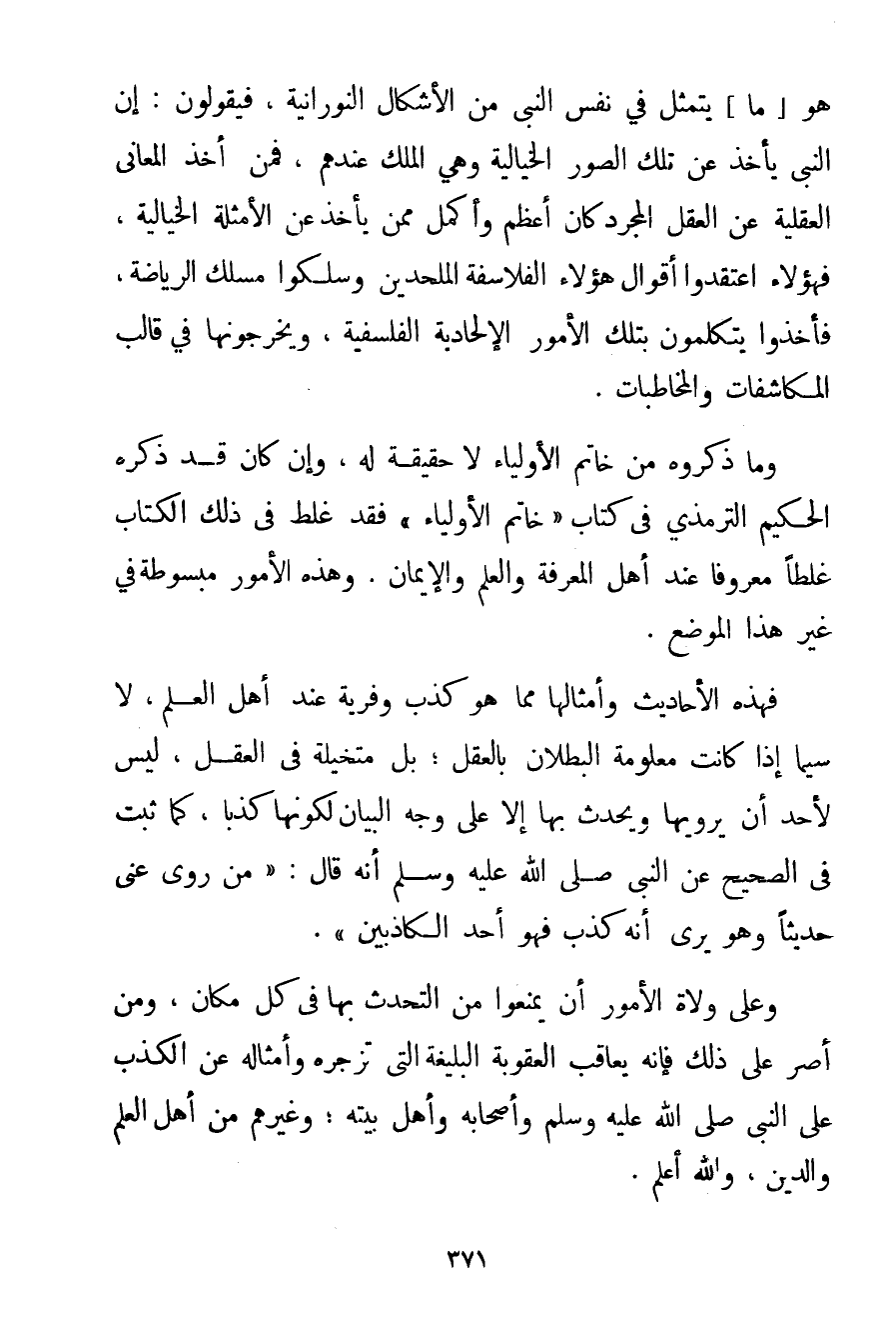 هُوَ مَا يَتَمَثَّلُ فِي نَفْسِ النَّبِيِّ مِنْ الْأَشْكَالِ النُّورَانِيَّةِ فَيَقُولُونَ: إنَّ النَّبِيَّ يَأْخُذُ عَنْ تِلْكَ الصُّوَرِ الْخَيَالِيَّةِ وَهِيَ الْمُلْكُ عِنْدَهُمْ فَمَنْ أَخَذَ الْمَعَانِيَ الْعَقْلِيَّةَ عَنْ الْعَقْلِ الْمُجَرَّدِ كَانَ أَعْظَمَ وَأَكْمَلَ مِمَّنْ يَأْخُذُ عَنْ الْأَمْثِلَةِ الْخَيَالِيَّةِ فَهَؤُلَاءِ اعْتَقَدُوا أَقْوَالَ هَؤُلَاءِ الْفَلَاسِفَةِ الْمُلْحِدِينَ وَسَلَكُوا مَسْلَكَ الرِّيَاضَةِ فَأَخَذُوا يَتَكَلَّمُونَ بِتِلْكَ الْأُمُورِ الْإِلْحَادِيَّةِ الْفَلْسَفِيَّةِ وَيُخْرِجُونَهَا فِي قَالَبِ الْمُكَاشَفَاتِ وَالْمُخَاطَبَاتِ. وَمَا ذَكَرُوهُ مِنْ خَاتَمِ الْأَوْلِيَاءِ لَا حَقِيقَةَ لَهُ وَإِنْ كَانَ قَدْ ذَكَرَهُ الْحَكِيمُ التِّرْمِذِيُّ فِي كِتَابِ " خَاتَمِ الْأَوْلِيَاءِ " فَقَدْ غَلِطَ فِي ذَلِكَ الْكِتَابِ غَلَطًا مَعْرُوفًا عِنْدَ أَهْلِ الْمَعْرِفَةِ وَالْعِلْمِ وَالْإِيمَانِ. وَهَذِهِ الْأُمُورُ مَبْسُوطَةٌ فِي غَيْرِ هَذَا الْمَوْضِعِ. فَهَذِهِ الْأَحَادِيثُ وَأَمْثَالُهَا مِمَّا هُوَ كَذِبٌ وَفِرْيَةٌ عِنْدَ أَهْلِ الْعِلْمِ لَا سِيَّمَا إذَا كَانَتْ مَعْلُومَةَ الْبُطْلَانِ بِالْعَقْلِ؛ بَلْ مُتَخَيَّلَةٌ فِي الْعَقْلِ لَيْسَ لِأَحَدِ أَنْ يَرْوِيَهَا وَيُحَدِّثَ بِهَا إلَّا عَلَى وَجْهِ الْبَيَانِ لِكَوْنِهَا كَذِبًا كَمَا ثَبَتَ فِي الصَّحِيحِ عَنْ النَّبِيِّ صَلَّى اللَّهُ عَلَيْهِ وَسَلَّمَ أَنَّهُ قَالَ: {مَنْ رَوَى عَنِّي حَدِيثًا وَهُوَ يَرَى أَنَّهُ كَذِبٌ فَهُوَ أَحَدُ الْكَاذِبِينَ} . وَعَلَى وُلَاةِ الْأُمُورِ أَنْ يَمْنَعُوا مِنْ التَّحَدُّثِ بِهَا فِي كُلِّ مَكَانٍ وَمَنْ أَصَرَّ عَلَى ذَلِكَ فَإِنَّهُ يُعَاقَبُ الْعُقُوبَةَ الْبَلِيغَةَ الَّتِي تَزْجُرُهُ وَأَمْثَالَهُ عَنْ الْكَذِبِ عَلَى النَّبِيِّ صَلَّى اللَّهُ عَلَيْهِ وَسَلَّمَ وَأَصْحَابِهِ وَأَهْلِ بَيْتِهِ؛ وَغَيْرِهِمْ مِنْ أَهْلِ الْعِلْمِ وَالدِّينِ وَاَللَّهُ أَعْلَمُ.
