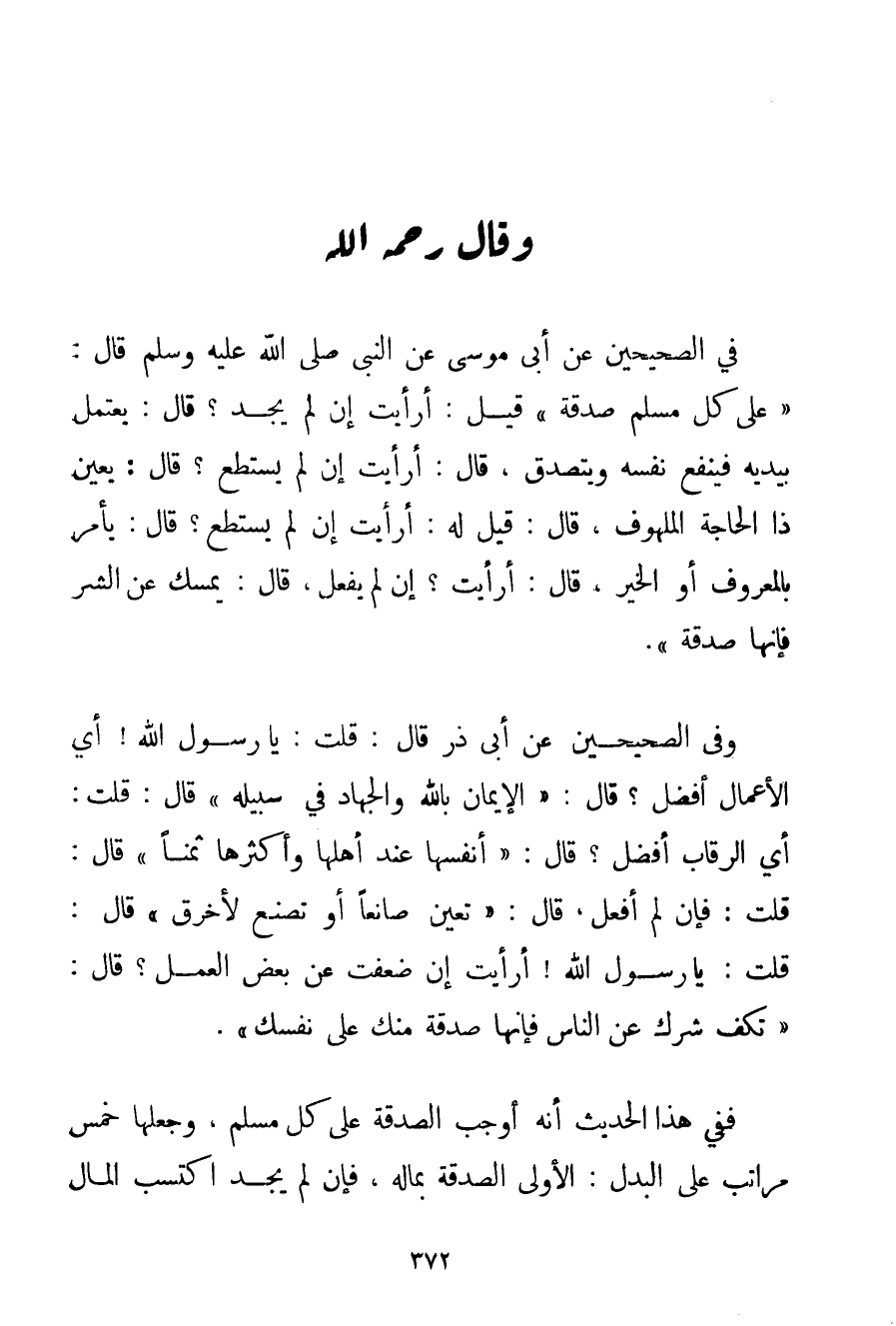 فِي الصَّحِيحَيْنِ عَنْ أَبِي مُوسَى عَنْ النَّبِيِّ صَلَّى اللَّهُ عَلَيْهِ وَسَلَّمَ قَالَ: {عَلَى كُلِّ مُسْلِمٍ صَدَقَةٌ قِيلَ: أَرَأَيْت إنْ لَمْ يَجِدْ؟ قَالَ: يَعْتَمِلُ بِيَدَيْهِ فَيَنْفَعُ نَفْسَهُ وَيَتَصَدَّقُ قَالَ: أَرَأَيْت إنْ لَمْ يَسْتَطِعْ؟ قَالَ: يُعِينُ ذَا الْحَاجَةِ الْمَلْهُوفِ قَالَ: قِيلَ لَهُ: أَرَأَيْت إنْ لَمْ يَسْتَطِعْ؟ قَالَ: يَأْمُرُ بِالْمَعْرُوفِ أَوْ الْخَيْرِ قَالَ: أَرَأَيْت؟ إنْ لَمْ يَفْعَلْ قَالَ: يُمْسِكُ عَنْ الشَّرِّ فَإِنَّهَا صَدَقَةٌ} . وَفِي الصَّحِيحَيْنِ {عَنْ أَبِي ذَرٍّ قَالَ: قُلْت: يَا رَسُولَ اللَّهِ أَيُّ الْأَعْمَالِ أَفْضَلُ؟ قَالَ: الْإِيمَانُ بِاَللَّهِ وَالْجِهَادُ فِي سَبِيلِهِ قَالَ: قُلْت: أَيُّ الرِّقَابِ أَفْضَلُ؟ قَالَ: أَنْفَسُهَا عِنْدَ أَهْلِهَا وَأَكْثَرُهَا ثَمَنًا قَالَ: قُلْت: فَإِنْ لَمْ أَفْعَلْ قَالَ: تُعِينُ صَانِعًا أَوْ تَصْنَعُ لِأَخْرِقَ قَالَ: قُلْت: يَا رَسُولَ اللَّهِ أَرَأَيْت إنْ ضَعُفْت عَنْ بَعْضِ الْعَمَلِ؟ قَالَ: تَكُفُّ شَرَّك عَنْ النَّاسِ فَإِنَّهَا صَدَقَةٌ مِنْك عَلَى نَفْسِك} . فَفِي هَذَا الْحَدِيثِ أَنَّهُ أَوْجَبَ الصَّدَقَةَ عَلَى كُلِّ مُسْلِمٍ وَجَعَلَهَا خَمْسَ مَرَاتِبَ عَلَى الْبَدَلِ: الْأُولَى الصَّدَقَةُ بِمَالِهِ فَإِنْ لَمْ يَجِدْ اكْتَسَبَ الْمَالَ