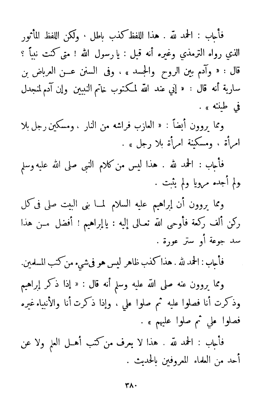 وَمِمَّا يَرْوُونَ عَنْهُ صَلَّى اللَّهُ عَلَيْهِ وَسَلَّمَ {كُنْت نَبِيًّا وَآدَمُ بَيْنَ الْمَاءِ وَالطِّينِ وَكُنْت نَبِيًّا وَآدَمُ لَا مَاءَ وَلَا طِينَ} . فَأَجَابَ: الْحَمْدُ لِلَّهِ. هَذَا اللَّفْظُ كَذِبٌ بَاطِلٌ وَلَكِنَّ اللَّفْظَ الْمَأْثُورَ الَّذِي رَوَاهُ التِّرْمِذِيُّ وَغَيْرُهُ أَنَّهُ {قِيلَ: يَا رَسُولَ اللَّهِ متى كَنْت نَبِيًّا؟ قَالَ: وَآدَمُ بَيْنَ الرُّوحِ وَالْجَسَدِ} وَفِي السُّنَنِ عَنْ العرباض بْنِ سَارِيَةَ أَنَّهُ قَالَ: {إنِّي عِنْدَ اللَّهِ لَمَكْتُوبٌ خَاتَمُ النَّبِيِّينَ وَإِنَّ آدَمَ لَمُنْجَدِلٌ فِي طِينَتِهِ} .