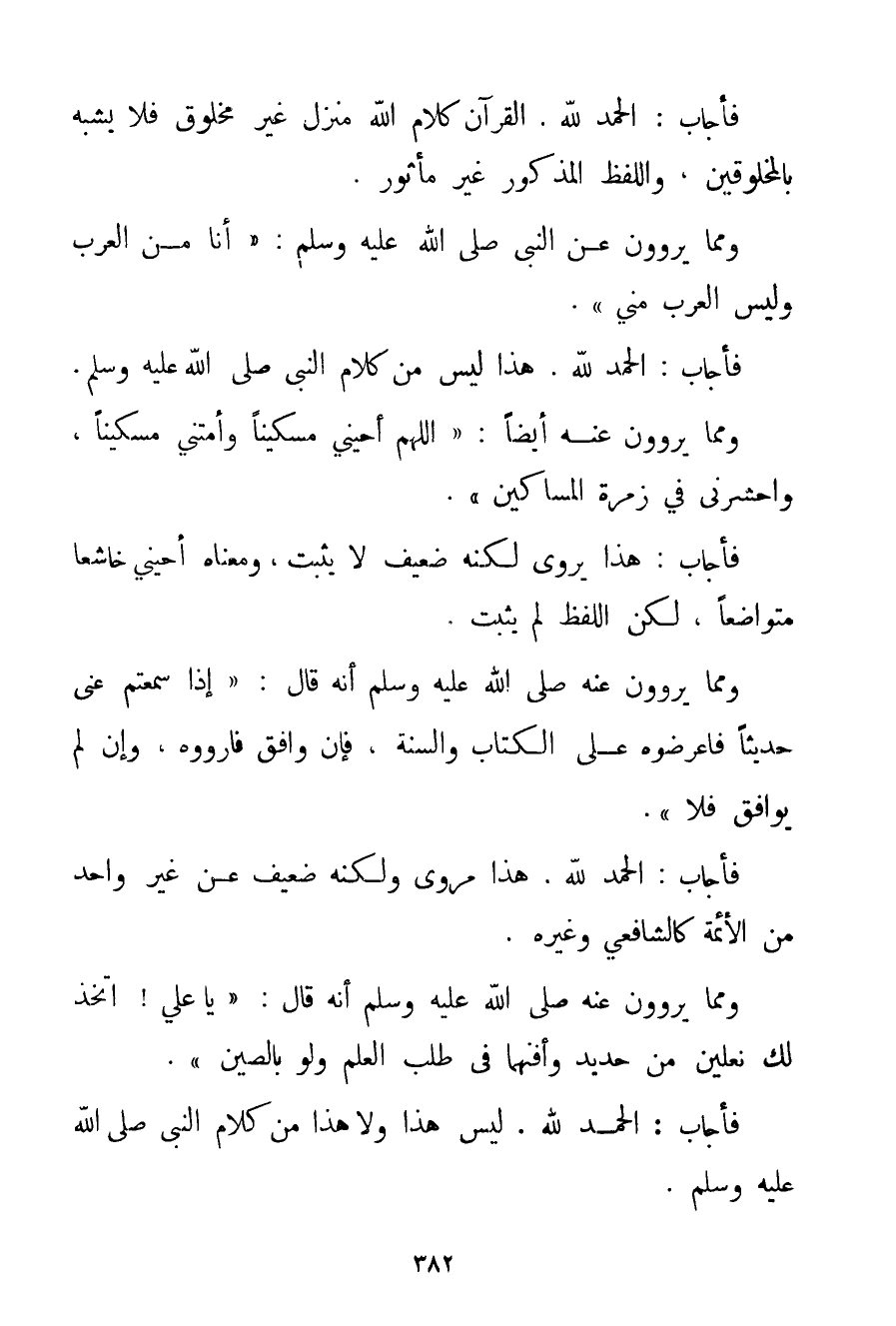 الْحَمْدُ لِلَّهِ، الْقُرْآنُ كَلَامُ اللَّهِ مُنَزَّلٌ غَيْرُ مَخْلُوقٍ فَلَا يُشَبَّهُ بِالْمَخْلُوقِينَ وَاللَّفْظُ الْمَذْكُورُ غَيْرُ مَأْثُورٍ.