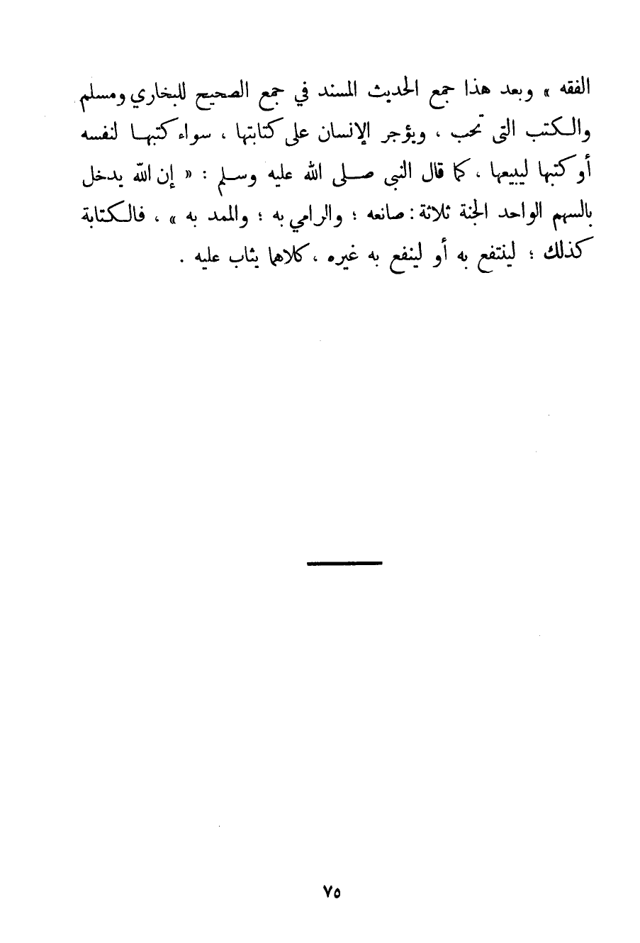 الْفِقْهِ " وَبَعْدَ هَذَا جُمِعَ الْحَدِيثُ الْمُسْنَدُ فِي جَمْعِ الصَّحِيحِ لِلْبُخَارِيِّ وَمُسْلِمٍ وَالْكُتُب الَّتِي تُحَبُّ وَيُؤْجَرُ الْإِنْسَانُ عَلَى كِتَابَتِهَا سَوَاءٌ كَتَبَهَا لِنَفْسِهِ أَوْ كَتَبَهَا لِيَبِيعَهَا كَمَا قَالَ النَّبِيُّ صَلَّى اللَّهُ عَلَيْهِ وَسَلَّمَ {إنَّ اللَّه يُدْخِلُ بِالسَّهْمِ الْوَاحِدِ الْجَنَّةَ ثَلَاثَةً: صَانِعَهُ؛ وَالرَّامِيَ بِهِ؛ وَالْمُمِدَّ بِهِ} فَالْكِتَابَةُ كَذَلِكَ؛ لِيَنْتَفِعَ بِهِ أَوْ لِيَنْفَعَ بِهِ غَيْرَهُ. كِلَاهُمَا يُثَابُ عَلَيْهِ.