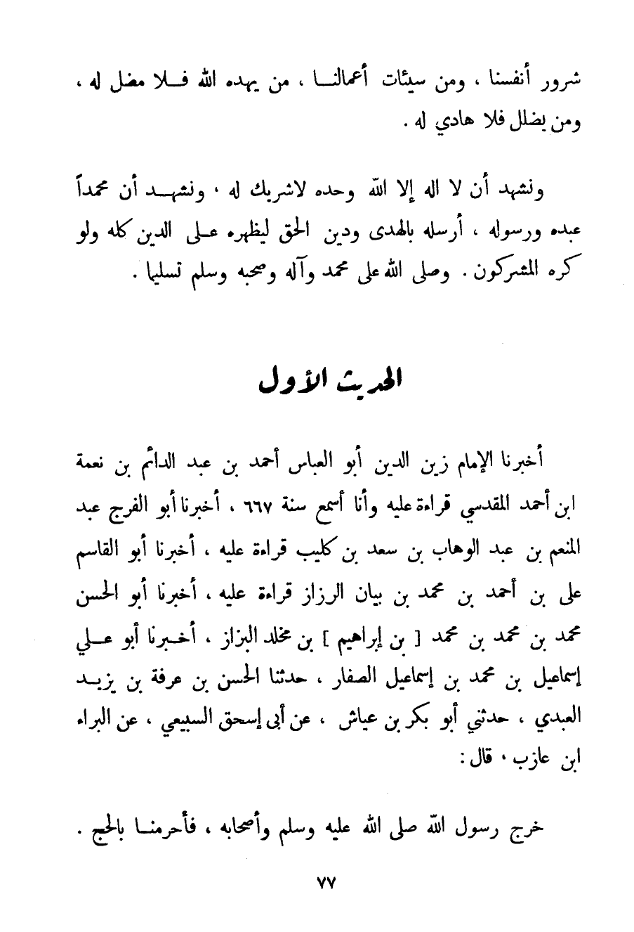 أَخْبَرَنَا الْإِمَامُ زَيْنُ الدِّينِ أَبُو الْعَبَّاسِ أَحْمَد بْنُ عَبْدِ الدَّائِمِ بْنِ نِعْمَةَ ابْنِ أَحْمَد المقدسي قِرَاءَةً عَلَيْهِ وَأَنَا أَسْمَعُ سَنَةَ 667 أَخْبَرَنَا أَبُو الْفَرَجِ عَبْدُ الْمُنْعِمِ بْنُ عَبْدِ الْوَهَّابِ بْنِ سَعْدِ بْنِ كُلَيْبٍ قِرَاءَةً عَلَيْهِ أَخْبَرَنَا أَبُو الْقَاسِمِ عَلِيُّ بْنُ أَحْمَد بْنِ مُحَمَّدِ بْنِ بَيَانٍ الرَّزَّازُ قِرَاءَةً عَلَيْهِ أَخْبَرَنَا أَبُو الْحَسَنِ مُحَمَّدُ بْنُ مُحَمَّدِ بْنِ مُحَمَّدِ بْنِ إبْرَاهِيمَ بْنِ مخلد الْبَزَّازُ أَخْبَرَنَا أَبُو عَلِيٍّ إسْمَاعِيلُ بْنُ مُحَمَّدِ بْنِ إسْمَاعِيلَ الصَّفَّارُ حَدَّثَنَا الْحَسَنُ بْنُ عَرَفَةَ بْنِ يَزِيدَ العبدي حَدَّثَنِي أَبُو بَكْرِ بْنُ عَيَّاشٍ عَنْ أَبِي إسْحَاقَ السبيعي عَنْ الْبَرَاءِ ابْنِ عَازِبٍ قَالَ: {خَرَجَ رَسُولُ اللَّهِ صَلَّى اللَّهُ عَلَيْهِ وَسَلَّمَ وَأَصْحَابُهُ فَأَحْرَمْنَا بِالْحَجِّ.