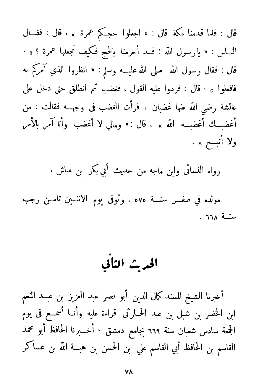 قَالَ: فَلَمَّا قَدِمْنَا مَكَّةَ قَالَ: اجْعَلُوا حَجَّكُمْ عُمْرَةً قَالَ: فَقَالَ النَّاسُ: يَا رَسُولَ اللَّهِ قَدْ أَحْرَمْنَا بِالْحَجِّ فَكَيْفَ نَجْعَلُهَا عُمْرَةً؟ . قَالَ: فَقَالَ رَسُولُ اللَّهِ صَلَّى اللَّهُ عَلَيْهِ وَسَلَّمَ اُنْظُرُوا الَّذِي آمُرُكُمْ بِهِ فَافْعَلُوا قَالَ: فَرَدُّوا عَلَيْهِ الْقَوْلَ فَغَضِبَ ثُمَّ انْطَلَقَ حَتَّى دَخَلَ عَلَى عَائِشَةَ رَضِيَ اللَّهُ عَنْهَا غَضْبَانَ فَرَأَتْ الْغَضَبَ فِي وَجْهِهِ فَقَالَتْ: مَنْ أَغْضَبَك أَغْضَبَهُ اللَّهُ قَالَ: وَمَالِي لَا أَغْضَبُ وَأَنَا آمِرٌ بِالْأَمْرِ وَلَا أُتْبَعُ} . رَوَاهُ النَّسَائِي وَابْنُ مَاجَه مِنْ حَدِيث أَبِي بَكْرِ ابْنِ عَيَّاشٍ مَوْلِدُهُ فِي صَفَرَ سَنَةَ 575. وَتُوُفِّيَ يَوْمَ الِاثْنَيْنِ ثَامِنَ رَجَبٍ سَنَةَ 668.