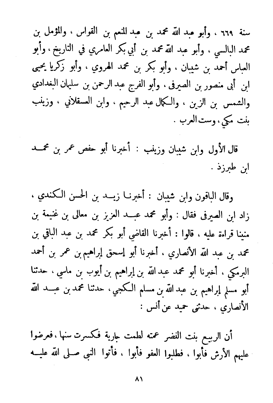 أَسْمَعُ فِي يَوْمِ الْجُمُعَةِ عَاشِرَ شَوَّالٍ سَنَةَ 669 وَأَبُو عَبْدِ اللَّهِ مُحَمَّدُ بْنُ عَبْدِ الْمُنْعِمِ بْنِ الْقَوَّاسِ وَالْمُؤَمِّلُ بْنُ مُحَمَّدٍ البالسي وَأَبُو عَبْدِ اللَّهِ مُحَمَّدُ بْنُ أَبِي بَكْرٍ الْعَامِرِيُّ فِي التَّارِيخِ وَأَبُو الْعَبَّاسِ أَحْمَد بْنُ شيبان وَأَبُو بَكْرِ بْنُ مُحَمَّدِ الهروي وَأَبُو زَكَرِيَّا يَحْيَى ابْنُ أَبِي مَنْصُورِ بْنِ الصَّيْرَفِيِّ وَأَبُو الْفَرَجِ عَبْدُ الرَّحْمَنِ بْنُ سُلَيْمَانَ الْبَغْدَادِيُّ وَالشَّمْسُ بْنُ الزَّيْنِ وَالْكَمَالُ عَبْدُ الرَّحِيمِ وَابْنُ الْعَسْقَلَانِيِّ وَزَيْنَبُ بِنْتُ مَكِّيٍّ وَسِتُّ الْعَرَبِ. قَالَ الْأَوَّلُ وَابْنُ شيبان وَزَيْنَبُ: أَخْبَرَنَا أَبُو حَفْصٍ عُمَرُ بْنُ مُحَمَّدِ ابْنِ طبرزذ. وَقَالَ الْبَاقُونَ وَابْنُ شيبان: أَخْبَرَنَا زَيْدُ بْنُ الْحَسَنِ الْكِنْدِيُّ زَادَ ابْنُ الصَّيْرَفِيِّ فَقَالَ: وَأَبُو مُحَمَّدٍ عَبْدُ الْعَزِيزِ بْنُ مَعَالِي بْنِ غُنَيْمَةَ بْنِ مَنِيّنَا قِرَاءَةً عَلَيْهِ قَالُوا: أَخْبَرَنَا الْقَاضِي أَبُو بَكْرِ مُحَمَّدُ بْنُ عَبْدِ الْبَاقِي بْنِ مُحَمَّدِ بْنِ عَبْدِ اللَّهِ الْأَنْصَارِيُّ أَخْبَرَنَا أَبُو إسْحَاقَ إبْرَاهِيمُ بْنُ عُمَرَ بْنِ أَحْمَد الْبَرْمَكِيُّ أَخْبَرَنَا أَبُو مُحَمَّدٍ عَبْدُ اللَّهِ بْنُ إبْرَاهِيمَ بْنِ أَيُّوبَ بْنِ مَاسِيّ حَدَّثَنَا أَبُو مُسْلِمٍ إبْرَاهِيمُ بْنُ عَبْدِ اللَّهِ بْنِ مُسْلِمٍ الكجي حَدَّثَنَا مُحَمَّدُ بْنُ عَبْدِ اللَّهِ الْأَنْصَارِيُّ حَدَّثَنِي حميد عَنْ {أَنَسٍ: أَنَّ الربيع بِنْتَ النَّضِرِ عَمَّتَهُ لَطَمَتْ جَارِيَةً فَكَسَرَتْ سِنَّهَا
