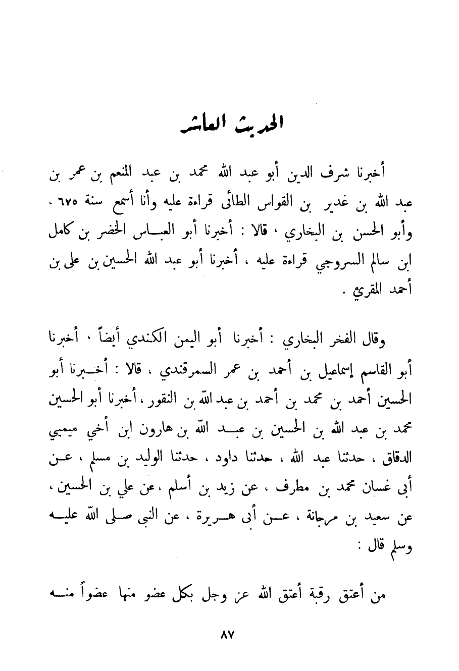 أَخْبَرَنَا شَرَفُ الدِّينِ أَبُو عَبْدِ اللَّهِ مُحَمَّدُ بْنُ عَبْدِ الْمُنْعِمِ بْنِ عُمَرَ بْنِ عَبْدِ اللَّهِ بْنِ غدير بْنِ الْقَوَّاسِ الطَّائِيُّ قِرَاءَةً عَلَيْهِ وَأَنَا أَسْمَعُ سَنَةَ 675 وَأَبُو الْحَسَنِ ابْنُ الْبُخَارِيِّ قَالَا: أَخْبَرَنَا أَبُو الْعَبَّاسِ الْخَضِرُ بْنُ كَامِلِ ابْنِ سَالِمٍ السروجي قِرَاءَةً عَلَيْهِ أَخْبَرَنَا أَبُو عَبْدِ اللَّهِ الْحُسَيْنُ بْنُ عَلِيٍّ بْنِ أَحْمَد الْمُقْرِي. وَقَالَ الْفَخْرُ الْبُخَارِيُّ: أَخْبَرَنَا أَبُو الْيَمَنِ الْكِنْدِيُّ أَيْضًا أَخْبَرَنَا أَبُو الْقَاسِمِ إسْمَاعِيلُ بْنُ أَحْمَد بْنِ عُمَرَ السَّمَرْقَنْدِيُّ قَالَا: أَخْبَرَنَا أَبُو الْحُسَيْنِ أَحْمَد بْنُ مُحَمَّدِ بْنِ أَحْمَد بْنِ عَبْدِ اللَّهِ بْنِ النقور أَخْبَرَنَا أَبُو الْحُسَيْنِ مُحَمَّدُ بْنُ عَبْدِ اللَّهِ بْنِ الْحُسَيْنِ بْنِ عَبْدِ اللَّهِ بْنِ هَارُونَ ابْنِ أَخِي مِيمِيِّي الدَّقَّاقُ حَدَّثَنَا عَبْدُ اللَّهِ حَدَّثَنَا دَاوُد حَدَّثَنَا الْوَلِيدُ بْنُ مُسْلِمٍ عَنْ أَبِي غَسَّانَ مُحَمَّدِ بْنِ مُطَرِّفٍ عَنْ زَيْدِ بْنِ أَسْلَمَ عَنْ عَلِيِّ بْنِ الْحُسَيْنِ عَنْ سَعِيدِ بْنِ مرجانة عَنْ أَبِي هُرَيْرَةَ عَنْ النَّبِيِّ صَلَّى اللَّهُ عَلَيْهِ وَسَلَّمَ قَالَ: {مَنْ أَعْتَقَ رَقَبَةً أَعْتَقَ اللَّهُ عَزَّ وَجَلَّ بِكُلِّ عُضْوٍ مِنْهَا عُضْوًا مِنْهُ