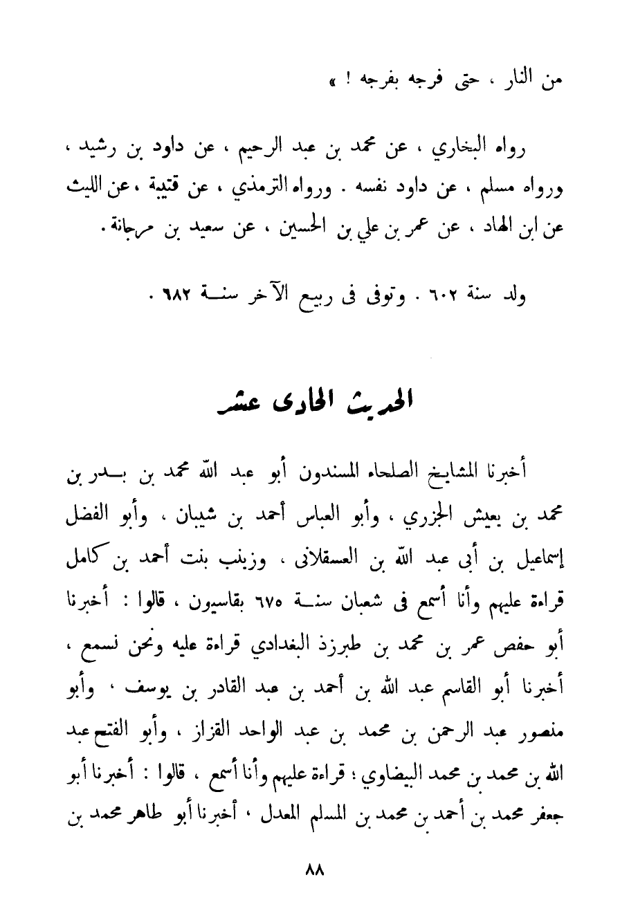 مِنْ النَّارِ حَتَّى فَرْجَهُ بِفَرْجِهِ} رَوَاهُ الْبُخَارِيُّ عَنْ مُحَمَّدِ بْنِ عَبْدِ الرَّحِيمِ عَنْ دَاوُد بْنِ رَشِيدٍ وَرَوَاهُ مُسْلِمٌ عَنْ دَاوُد نَفْسِهِ. وَرَوَاهُ التِّرْمِذِيُّ عَنْ قُتَيْبَةَ عَنْ اللَّيْثِ عَنْ ابْنِ الْهَادِّ عَنْ عُمَرَ بْنِ عَلِيِّ بْنِ الْحُسَيْنِ عَنْ سَعِيدِ بْنِ مرجانة. وُلِدَ سَنَةَ 602 وَتُوُفِّيَ فِي رَبِيعٍ الْآخَرِ سَنَةَ 682.