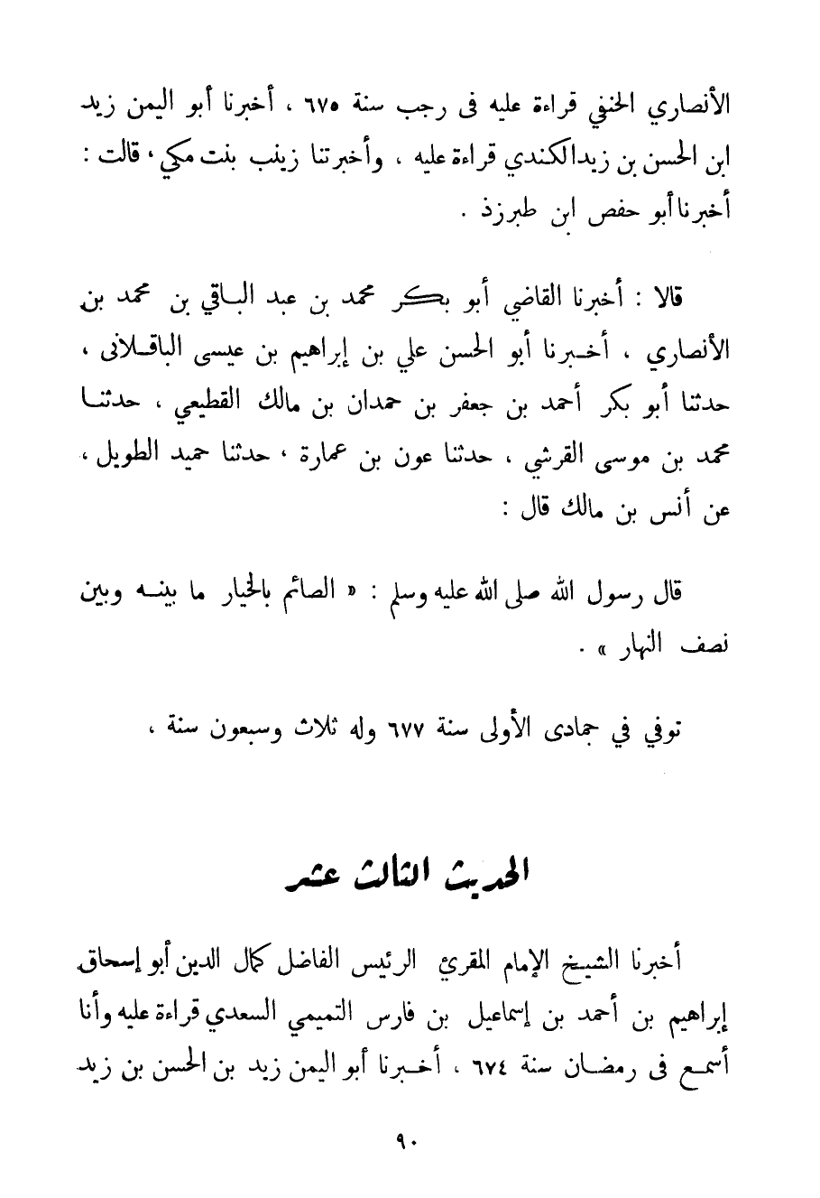 الْأَنْصَارِيِّ الْحَنَفِيِّ قِرَاءَةً عَلَيْهِ فِي رَجَبٍ سَنَةَ 675 أَخْبَرَنَا أَبُو الْيَمَنِ زَيْدُ ابْنُ الْحَسَنِ بْنِ زَيْدٍ الْكِنْدِيُّ قِرَاءَةً عَلَيْهِ وَأَخْبَرَتْنَا زَيْنَبُ بِنْتُ مَكِّيٍّ قَالَتْ: أَخْبَرَنَا أَبُو حَفْصِ ابْنُ طبرزذ. قَالَا: أَخْبَرَنَا الْقَاضِي أَبُو بَكْرِ مُحَمَّدُ بْنُ عَبْدِ الْبَاقِي بْنِ مُحَمَّدِ بْنِ الْأَنْصَارِيِّ أَخْبَرَنَا أَبُو الْحَسَنِ عَلِيُّ بْنُ إبْرَاهِيمَ بْنِ عِيسَى الْبَاقِلَانِي حَدَّثَنَا أَبُو بَكْرٍ أَحْمَد بْنُ جَعْفَرِ بْنِ حَمْدَانَ بْنِ مَالِكٍ القطيعي حَدَّثَنَا مُحَمَّدُ بْنُ مُوسَى الْقُرَشِيُّ حَدَّثَنَا عَوْنُ بْنُ عِمَارَةَ حَدَّثَنَا حميد الطَّوِيلُ عَنْ أَنَسِ بْنِ مَالِكٍ قَالَ: قَالَ رَسُولُ اللَّهِ صَلَّى اللَّهُ عَلَيْهِ وَسَلَّمَ {الصَّائِمُ بِالْخِيَارِ مَا بَيْنَهُ وَبَيْنَ نِصْفِ النَّهَارِ} . تُوُفِّيَ فِي جُمَادَى الْأُولَى سَنَةَ 677 وَلَهُ ثَلَاثٌ وَسَبْعُونَ سَنَةً