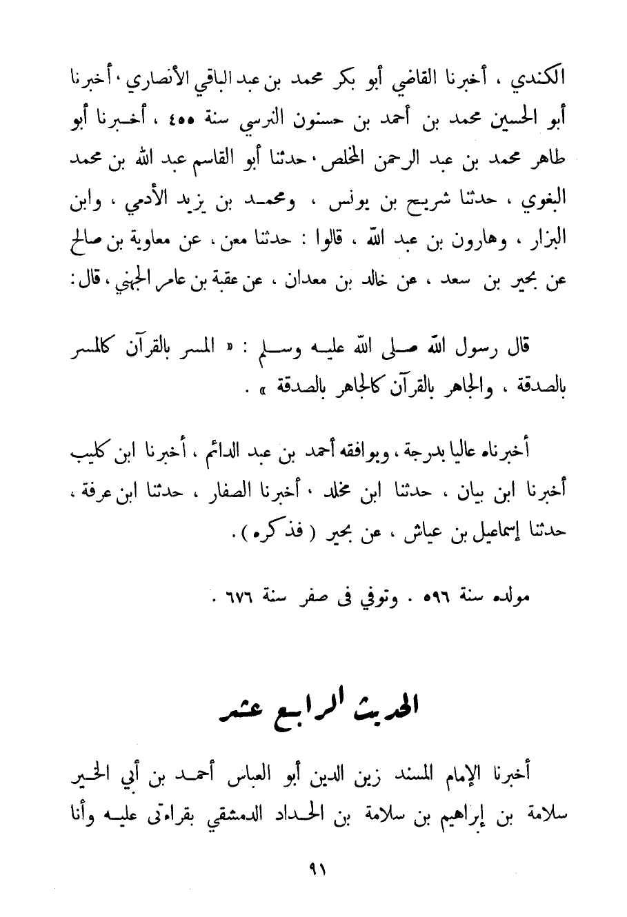 الْكِنْدِيُّ أَخْبَرَنَا الْقَاضِي أَبُو بَكْرٍ مُحَمَّدُ بْنُ عَبْدِ الْبَاقِي الْأَنْصَارِيُّ أَخْبَرَنَا أَبُو الْحُسَيْنِ مُحَمَّدُ بْنُ أَحْمَد بْنِ حَسَنُونَ النرسي سَنَةَ 455 أَخْبَرَنَا أَبُو طَاهِرٍ مُحَمَّدُ بْنُ عَبْدِ الرَّحْمَنِ الْمُخْلِصُ حَدَّثَنَا أَبُو الْقَاسِمِ عَبْدُ اللَّهِ بْنُ مُحَمَّدٍ البغوي حَدَّثَنَا شريح بْنُ يُونُسَ وَمُحَمَّدُ بْنُ يَزِيدَ الْآدَمِيُّ وَابْنُ الْبَزَّارِ وَهَارُونُ بْنُ عَبْدِ اللَّهِ قَالُوا: حَدَّثَنَا مَعْنٌ عَنْ مُعَاوِيَةَ بْنِ صَالِحٍ عَنْ بَحِيرِ بْنِ سَعْدٍ عَنْ خَالِدِ بْنِ معدان عَنْ عُقْبَةَ بْنِ عَامِرٍ الجهني قَالَ: قَالَ رَسُولُ اللَّهِ صَلَّى اللَّهُ عَلَيْهِ وَسَلَّمَ {الْمُسِرُّ بِالْقُرْآنِ كَالْمُسِرِّ بِالصَّدَقَةِ وَالْجَاهِرُ بِالْقُرْآنِ كَالْجَاهِرِ بِالصَّدَقَةِ} . أَخْبَرَنَاهُ عَالِيًا بِدَرَجَةِ وَيُوَافِقُهُ أَحْمَد بْنُ عَبْدِ الدَّائِمِ أَخْبَرَنَا ابْنُ كُلَيْبٍ أَخْبَرَنَا ابْنُ بَيَانٍ حَدَّثَنَا ابْنُ مخلد أَخْبَرَنَا الصَّفَّارُ حَدَّثَنَا ابْنُ عَرَفَةَ حَدَّثَنَا إسْمَاعِيلُ بْنُ عَيَّاشٍ عَنْ بَحِيرٍ (فَذَكَرَهُ. مَوْلِدُهُ سَنَةَ 596. وَتُوُفِّيَ فِي صَفَرَ سَنَةَ 676.
