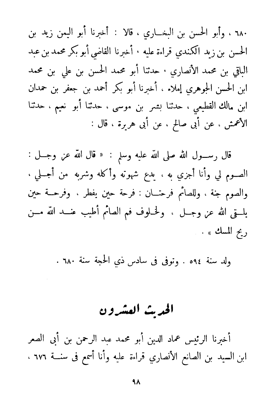 680، وَأَبُو الْحَسَنِ بْنُ الْبُخَارِيِّ قَالَا: أَخْبَرَنَا أَبُو الْيَمَنِ زَيْدُ بْنُ الْحَسَنِ بْنِ زَيْدٍ الْكِنْدِيُّ قِرَاءَةً عَلَيْهِ أَخْبَرَنَا الْقَاضِي أَبُو بَكْرٍ مُحَمَّدُ بْنُ عَبْدِ الْبَاقِي بْنِ مُحَمَّدٍ الْأَنْصَارِيُّ حَدَّثَنَا أَبُو مُحَمَّدٍ الْحَسَنُ بْنُ عَلِيِّ بْنِ مُحَمَّدِ بْنِ الْحَسَنِ الْجَوْهَرِيُّ إمْلَاءً أَخْبَرَنَا أَبُو بَكْرٍ أَحْمَد بْنُ جَعْفَرِ بْنِ حَمْدَانَ بْنِ مَالِكٍ القطيعي حَدَّثَنَا بِشْرُ بْنُ مُوسَى حَدَّثَنَا أَبُو نُعَيْمٍ حَدَّثَنَا الْأَعْمَشُ عَنْ أَبِي صَالِحٍ عَنْ أَبِي هُرَيْرَةَ قَالَ: قَالَ رَسُولُ اللَّهِ صَلَّى اللَّهُ عَلَيْهِ وَسَلَّمَ {قَالَ اللَّهُ عَزَّ وَجَلَّ: الصَّوْمُ لِي وَأَنَا أَجْزِي بِهِ يَدَعُ شَهْوَتَهُ وَأَكْلَهُ وَشُرْبَهُ مِنْ أَجْلِي وَالصَّوْمُ جُنَّةٌ وَلِلصَّائِمِ فرحتان: فَرْحَةٌ حِينَ يُفْطِرُ وَفَرْحَةٌ حِينَ يَلْقَى اللَّهَ عَزَّ وَجَلَّ وَلَخُلُوفُ فَمِ الصَّائِمِ أَطْيَبُ عِنْدَ اللَّهِ مِنْ رِيحِ الْمِسْكِ} . وُلِدَ سَنَةَ 594. وَتُوُفِّيَ فِي سَادِسِ ذِي الْحِجَّةِ سَنَةَ 680.