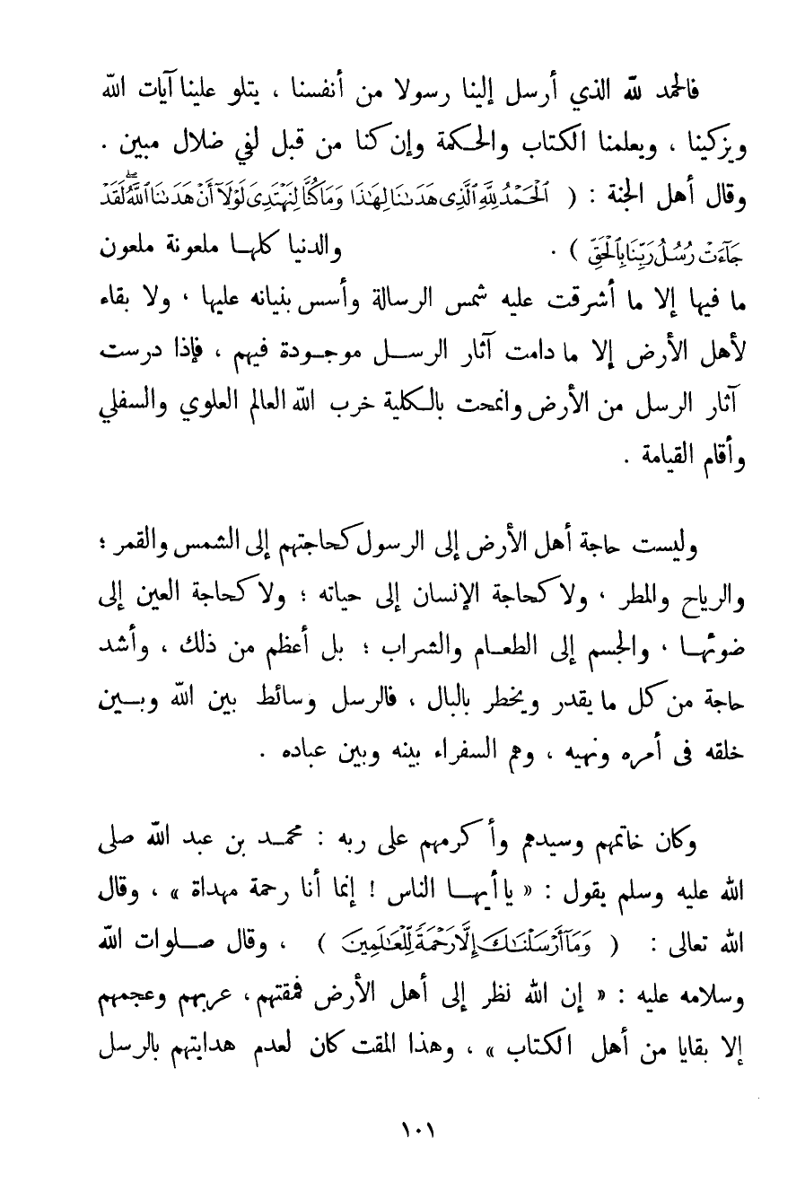 فَالْحَمْدُ لِلَّهِ الَّذِي أَرْسَلَ إلَيْنَا رَسُولًا مِنْ أَنْفُسِنَا يَتْلُو عَلَيْنَا آيَاتِ اللَّهِ وَيُزَكِّينَا وَيُعَلِّمُنَا الْكِتَابَ وَالْحِكْمَةَ وَإِنْ كُنَّا مِنْ قَبْلُ لَفِي ضَلَالٍ مُبِينٍ وَقَالَ أَهْلُ الْجَنَّةِ: {الْحَمْدُ لِلَّهِ الَّذِي هَدَانَا لِهَذَا وَمَا كُنَّا لِنَهْتَدِيَ لَوْلَا أَنْ هَدَانَا اللَّهُ لَقَدْ جَاءَتْ رُسُلُ رَبِّنَا بِالْحَقِّ} . وَالدُّنْيَا كُلُّهَا مَلْعُونَةٌ مَلْعُونٌ مَا فِيهَا إلَّا مَا أَشْرَقَتْ عَلَيْهِ شَمْسُ الرِّسَالَةِ وَأُسِّسَ بُنْيَانُهُ عَلَيْهَا وَلَا بَقَاءَ لِأَهْلِ الْأَرْضِ إلَّا مَا دَامَتْ آثَارُ الرُّسُلِ مَوْجُودَةً فِيهِمْ فَإِذَا دَرَسَتْ آثَارُ الرُّسُلِ مِنْ الْأَرْضِ وانمحت بِالْكُلِّيَّةِ خَرَّبَ اللَّهُ الْعَالَمَ الْعُلْوِيَّ وَالسُّفْلِيَّ وَأَقَامَ الْقِيَامَةَ. وَلَيْسَتْ حَاجَةُ أَهْلِ الْأَرْضِ إلَى الرَّسُولِ كَحَاجَتِهِمْ إلَى الشَّمْسِ وَالْقَمَرِ؛ وَالرِّيَاحِ وَالْمَطَرِ وَلَا كَحَاجَةِ الْإِنْسَانِ إلَى حَيَاتِهِ؛ وَلَا كَحَاجَةِ الْعَيْنِ إلَى ضَوْئِهَا وَالْجِسْمِ إلَى الطَّعَامِ وَالشَّرَابِ؛ بَلْ أَعْظَمُ مِنْ ذَلِكَ؛ وَأَشَدُّ حَاجَةً مِنْ كُلِّ مَا يُقَدَّرُ وَيَخْطُرُ بِالْبَالِ فَالرُّسُلُ وَسَائِطُ بَيْنَ اللَّهِ وَبَيْنَ خَلْقِهِ فِي أَمْرِهِ وَنَهْيِهِ وَهُمْ السُّفَرَاءُ بَيْنَهُ وَبَيْنَ عِبَادِهِ. وكان خَاتَمُهُمْ وَسَيِّدُهُمْ وَأَكْرَمُهُمْ عَلَى رَبِّهِ: مُحَمَّدَ بْنَ عَبْدِ اللَّهِ صَلَّى اللَّهُ عَلَيْهِ وَسَلَّمَ يَقُولُ: {يَا أَيُّهَا النَّاسُ إنَّمَا أَنَا رَحْمَةٌ مُهْدَاةٌ} وَقَالَ اللَّهُ تَعَالَى: {وَمَا أَرْسَلْنَاكَ إلَّا رَحْمَةً لِلْعَالَمِينَ} وَقَالَ صَلَوَاتُ اللَّهِ وَسَلَامُهُ عَلَيْهِ {إنَّ اللَّهَ نَظَرَ إلَى أَهْلِ الْأَرْضِ فَمَقَتَهُمْ عَرَبَهُمْ وَعَجَمَهُمْ إلَّا بَقَايَا مِنْ أَهْلِ الْكِتَاب} وَهَذَا الْمَقْتُ كَانَ لِعَدَمِ هِدَايَتِهِمْ بِالرُّسُلِ
