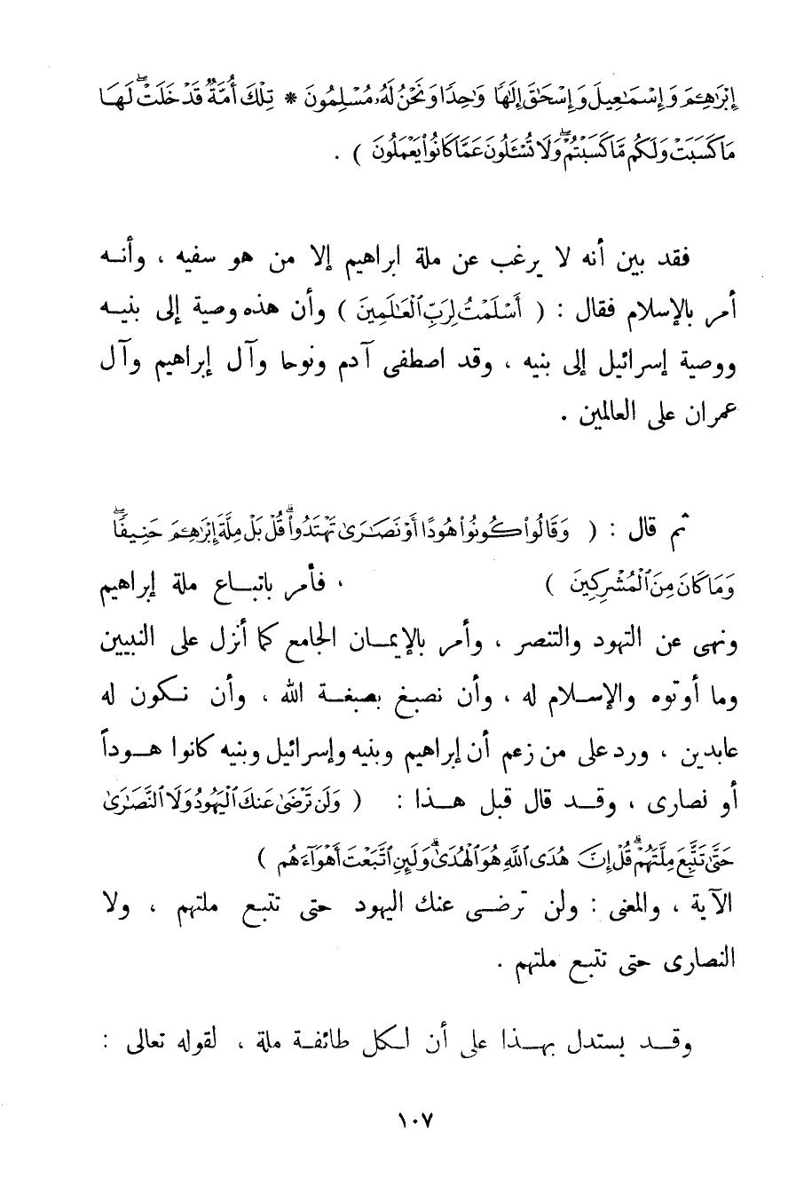 إبْرَاهِيمَ وَإِسْمَاعِيلَ وَإِسْحَاقَ إلَهًا وَاحِدًا وَنَحْنُ لَهُ مُسْلِمُونَ} {تِلْكَ أُمَّةٌ قَدْ خَلَتْ لَهَا مَا كَسَبَتْ وَلَكُمْ مَا كَسَبْتُمْ وَلَا تُسْأَلُونَ عَمَّا كَانُوا يَعْمَلُونَ} . فَقَدْ بَيَّنَ أَنَّهُ لَا يَرْغَبُ عَنْ مِلَّةِ إبْرَاهِيمَ إلَّا مَنْ هُوَ سَفِيهٌ وَأَنَّهُ أَمَرَ بِالْإِسْلَامِ فَقَالَ: {أَسْلَمْتُ لِرَبِّ الْعَالَمِينَ} وَأَنَّ هَذِهِ وَصِيَّةٌ إلَى بَنِيهِ وَوَصِيَّةُ إسْرَائِيلَ إلَى بَنِيهِ وَقَدْ اصْطَفَى آدَمَ وَنُوحًا وَآلَ إبْرَاهِيمَ وَآلَ عِمْرَانَ عَلَى الْعَالَمِينَ. ثُمَّ قَالَ: {وَقَالُوا كُونُوا هُودًا أَوْ نَصَارَى تَهْتَدُوا قُلْ بَلْ مِلَّةَ إبْرَاهِيمَ حَنِيفًا وَمَا كَانَ مِنَ الْمُشْرِكِينَ} فَأَمَرَ بِاتِّبَاعِ مِلَّةِ إبْرَاهِيمَ وَنَهَى عَنْ التَّهَوُّدِ وَالتَّنَصُّرِ وَأَمَرَ بِالْإِيمَانِ الْجَامِعِ كَمَا أَنْزَلَ عَلَى النَّبِيِّينَ وَمَا أُوتُوهُ وَالْإِسْلَامِ لَهُ وَأَنْ نُصْبَغَ بِصِبْغَةِ اللَّهِ وَأَنْ نَكُونَ لَهُ عَابِدِينَ وَرَدَّ عَلَى مَنْ زَعَمَ أَنَّ إبْرَاهِيمَ وَبَنِيهِ وَإِسْرَائِيلَ وَبَنِيهِ كَانُوا هُودًا أَوْ نَصَارَى وَقَدْ قَالَ قَبْلَ هَذَا: {وَلَنْ تَرْضَى عَنْكَ الْيَهُودُ وَلَا النَّصَارَى حَتَّى تَتَّبِعَ مِلَّتَهُمْ قُلْ إنَّ هُدَى اللَّهِ هُوَ الْهُدَى وَلَئِنِ اتَّبَعْتَ أَهْوَاءَهُمْ} الْآيَةَ وَالْمَعْنَى: وَلَنْ تَرْضَى عَنْك الْيَهُودُ حَتَّى تَتَّبِعَ مِلَّتَهُمْ وَلَا النَّصَارَى حَتَّى تَتَّبِعَ مِلَّتَهُمْ. وَقَدْ يُسْتَدَلُّ بِهَذَا عَلَى أَنَّ لِكُلِّ طَائِفَةٍ مِلَّةٌ لِقَوْلِهِ تَعَالَى