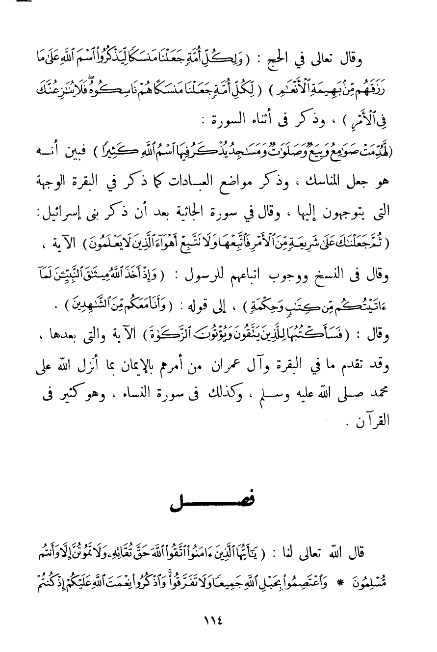 وَقَالَ تَعَالَى فِي الْحَجِّ: {وَلِكُلِّ أُمَّةٍ جَعَلْنَا مَنْسَكًا لِيَذْكُرُوا اسْمَ اللَّهِ عَلَى مَا رَزَقَهُمْ مِنْ بَهِيمَةِ الْأَنْعَامِ} و {لِكُلِّ أُمَّةٍ جَعَلْنَا مَنْسَكًا هُمْ نَاسِكُوهُ فَلَا يُنَازِعُنَّكَ فِي الْأَمْرِ} وَذَكَرَ فِي أَثْنَاءِ السُّورَةِ: {لَهُدِّمَتْ صَوَامِعُ وَبِيَعٌ وَصَلَوَاتٌ وَمَسَاجِدُ يُذْكَرُ فِيهَا اسْمُ اللَّهِ كَثِيرًا} فَبَيَّنَ أَنَّهُ هُوَ جَعَلَ الْمَنَاسِكَ وَذَكَرَ مَوَاضِعَ الْعِبَادَاتِ كَمَا ذَكَرَ فِي الْبَقَرَةِ الوجهة الَّتِي يَتَوَجَّهُونَ إلَيْهَا وَقَالَ فِي سُورَةِ الْجَاثِيَةِ بَعْدَ أَنْ ذَكَرَ بَنِي إسْرَائِيلَ: {ثُمَّ جَعَلْنَاكَ عَلَى شَرِيعَةٍ مِنَ الْأَمْرِ فَاتَّبِعْهَا وَلَا تَتَّبِعْ أَهْوَاءَ الَّذِينَ لَا يَعْلَمُونَ} الْآيَةَ وَقَالَ فِي النُّسَخِ وَوُجُوبِ اتِّبَاعِهِمْ لِلرَّسُولِ: {وَإِذْ أَخَذَ اللَّهُ مِيثَاقَ النَّبِيِّينَ لَمَا آتَيْتُكُمْ مِنْ كِتَابٍ وَحِكْمَةٍ} إلَى قَوْلِهِ: {وَأَنَا مَعَكُمْ مِنَ الشَّاهِدِينَ} . وَقَالَ: {فَسَأَكْتُبُهَا لِلَّذِينَ يَتَّقُونَ وَيُؤْتُونَ الزَّكَاةَ} الْآيَةَ وَاَلَّتِي بَعْدَهَا وَقَدْ تَقَدَّمَ مَا فِي الْبَقَرَةِ وَآلِ عِمْرَانَ مِنْ أَمْرِهِمْ بِالْإِيمَانِ بِمَا أَنْزَلَ اللَّهُ عَلَى مُحَمَّدٍ صَلَّى اللَّهُ عَلَيْهِ وَسَلَّمَ وَكَذَلِكَ فِي سُورَةِ النِّسَاءِ وَهُوَ كَثِيرٌ فِي الْقُرْآنِ.