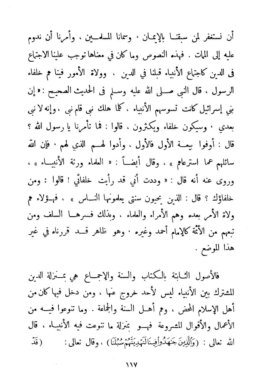 أَنْ نَسْتَغْفِرَ لِمَنْ سَبَقَنَا بِالْإِيمَانِ وَسَمَّانَا الْمُسْلِمِينَ وَأَمَرَنَا أَنْ نَدُومَ عَلَيْهِ إلَى الْمَمَاتِ. فَهَذِهِ النُّصُوصُ وَمَا كَانَ فِي مَعْنَاهَا تُوجِبُ عَلَيْنَا الِاجْتِمَاعَ فِي الدِّينِ كَاجْتِمَاعِ الْأَنْبِيَاءِ قَبْلَنَا فِي الدِّينِ وَوُلَاةِ الْأُمُورِ فِينَا هُمْ خُلَفَاءُ الرَّسُولِ قَالَ النَّبِيُّ صَلَّى اللَّهُ عَلَيْهِ وَسَلَّمَ فِي الْحَدِيثِ الصَّحِيحِ: {إنَّ بَنِي إسْرَائِيلَ كَانَتْ تَسُوسُهُمْ الْأَنْبِيَاءُ كُلَّمَا هَلَكَ نَبِيٌّ قَامَ نَبِيٌّ وَإِنَّهُ لَا نَبِيَّ بَعْدِي وَسَيَكُونُ خُلَفَاءُ وَيَكْثُرُونَ قَالُوا: فَمَا تَأْمُرُنَا يَا رَسُولَ اللَّهِ؟ قَالَ: أَوْفُوا بَيْعَةَ الْأَوَّلِ فَالْأَوَّلِ وَأَدُّوا لَهُمْ الَّذِي لَهُمْ فَإِنَّ اللَّهَ سَائِلُهُمْ عَمَّا اسْتَرْعَاهُمْ} وَقَالَ أَيْضًا: {الْعُلَمَاءُ وَرَثَةُ الْأَنْبِيَاءِ} وَرُوِيَ عَنْهُ أَنَّهُ قَالَ: {وَدِدْت أَنِّي قَدْ رَأَيْت خُلَفَائِي قَالُوا: وَمَنْ خُلَفَاؤُك؟ قَالَ: الَّذِينَ يُحْيُونَ سُنَّتِي يُعَلِّمُونَهَا النَّاسَ} فَهَؤُلَاءِ هُمْ وُلَاةُ الْأَمْرِ بَعْدَهُ وَهُمْ الْأُمَرَاءُ وَالْعُلَمَاءُ وَبِذَلِكَ فَسَّرَهَا السَّلَفُ وَمَنْ تَبِعَهُمْ مِنْ الْأَئِمَّةِ كَالْإِمَامِ أَحْمَد وَغَيْرِهِ وَهُوَ ظَاهِرٌ قَدْ قَرَّرْنَاهُ فِي غَيْرِ هَذَا الْمَوْضِعِ. فَالْأُصُولُ الثَّابِتَةُ بِالْكِتَابِ وَالسُّنَّةِ وَالْإِجْمَاعِ هِيَ بِمَنْزِلَةِ الدِّينِ الْمُشْتَرِكِ بَيْنَ الْأَنْبِيَاءِ لَيْسَ لِأَحَدِ خُرُوجٌ عَنْهَا وَمَنْ دَخَلَ فِيهَا كَانَ مِنْ أَهْلِ الْإِسْلَامِ الْمَحْضِ وَهُمْ أَهْلُ السُّنَّةِ وَالْجَمَاعَةِ. وَمَا تَنَوَّعُوا فِيهِ مِنْ الْأَعْمَالِ وَالْأَقْوَالِ الْمَشْرُوعَةِ فَهُوَ بِمَنْزِلَةِ مَا تَنَوَّعَتْ فِيهِ الْأَنْبِيَاءُ قَالَ اللَّهُ تَعَالَى: {وَالَّذِينَ جَاهَدُوا فِينَا لَنَهْدِيَنَّهُمْ سُبُلَنَا} وَقَالَ تَعَالَى: {قَدْ