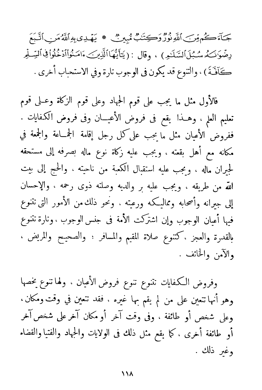 جَاءَكُمْ مِنَ اللَّهِ نُورٌ وَكِتَابٌ مُبِينٌ} {يَهْدِي بِهِ اللَّهُ مَنِ اتَّبَعَ رِضْوَانَهُ سُبُلَ السَّلَامِ} وَقَالَ: {يَا أَيُّهَا الَّذِينَ آمَنُوا ادْخُلُوا فِي السِّلْمِ كَافَّةً} وَالتَّنَوُّعُ قَدْ يَكُونُ فِي الْوُجُوبِ تَارَةً وَفِي الِاسْتِحْبَابِ أُخْرَى. فَالْأَوَّلُ مِثْلَ مَا يَجِبُ عَلَى قَوْمٍ الْجِهَادُ وَعَلَى قَوْمٍ الزَّكَاةُ وَعَلَى قَوْمٍ تَعْلِيمُ الْعِلْمِ وَهَذَا يَقَعُ فِي فُرُوضِ الْأَعْيَانِ وَفِي فُرُوضِ الْكِفَايَاتِ. فَفُرُوضُ الْأَعْيَانِ مِثْلُ مَا يَجِبُ عَلَى كُلِّ رَجُلٍ إقَامَةُ الْجَمَاعَةِ وَالْجُمُعَةِ فِي مَكَانِهِ مَعَ أَهْلِ بُقْعَتِهِ وَيَجِبُ عَلَيْهِ زَكَاةُ نَوْعِ مَالِهِ بِصَرْفِهِ إلَى مُسْتَحَقِّهِ لِجِيرَانِ مَالِهِ وَيَجِبُ عَلَيْهِ اسْتِقْبَالُ الْكَعْبَةِ مِنْ نَاحِيَتِهِ وَالْحَجُّ إلَى بَيْتِ اللَّهِ مِنْ طَرِيقِهِ وَيَجِبُ عَلَيْهِ بِرُّ وَالِدَيْهِ وَصِلَتِهِ ذَوِي رَحِمِهِ وَالْإِحْسَانُ إلَى جِيرَانِهِ وَأَصْحَابِهِ وَمَمَالِيكِهِ وَرَعِيَّتِهِ وَنَحْوَ ذَلِكَ مِنْ الْأُمُورِ الَّتِي تَتَنَوَّعُ فِيهَا أَعْيَانُ الْوُجُوبِ وَإِنْ اشْتَرَكَتْ الْأُمَّةُ فِي جِنْسِ الْوُجُوبِ وَتَارَةً تَتَنَوَّعُ بِالْقُدْرَةِ وَالْعَجْزِ كَتَنَوُّعِ صَلَاةِ الْمُقِيمِ وَالْمُسَافِرِ؛ وَالصَّحِيحِ وَالْمَرِيضِ وَالْآمِنِ وَالْخَائِفِ. وَفُرُوضُ الْكِفَايَاتِ تَتَنَوَّعُ تَنَوُّعَ فُرُوضِ الْأَعْيَانِ وَلَهَا تَنَوُّعٌ يَخُصُّهَا وَهُوَ أَنَّهَا تَتَعَيَّنُ عَلَى مَنْ لَمْ يَقُمْ بِهَا غَيْرُهُ فَقَدْ تَتَعَيَّنُ فِي وَقْتٍ وَمَكَانٍ وَعَلَى شَخْصٍ أَوْ طَائِفَةٍ وَفِي وَقْتٍ آخَرَ أَوْ مَكَانٍ آخَرَ عَلَى شَخْصٍ آخَرَ أَوْ طَائِفَةٍ أُخْرَى كَمَا يَقَعُ مِثْلُ ذَلِكَ فِي الْوِلَايَاتِ وَالْجِهَادِ وَالْفُتْيَا وَالْقَضَاءِ وَغَيْرِ ذَلِكَ.