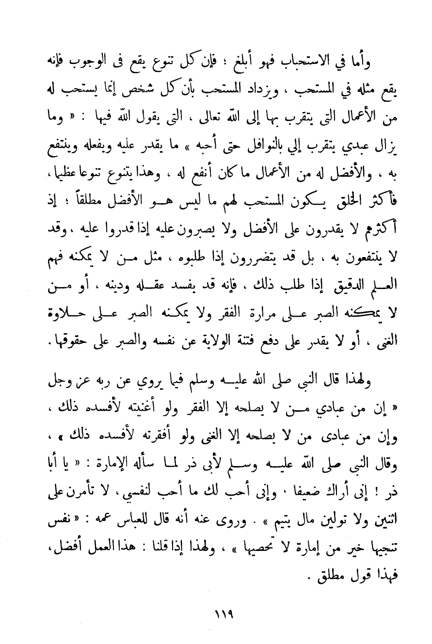 وَأَمَّا فِي الِاسْتِحْبَابِ فَهُوَ أَبْلَغُ؛ فَإِنَّ كُلَّ تَنَوُّعٍ يَقَعُ فِي الْوُجُوبِ فَإِنَّهُ يَقَعُ مِثْلُهُ فِي الْمُسْتَحَبِّ وَيَزْدَادُ الْمُسْتَحَبُّ بِأَنَّ كُلَّ شَخْصٍ إنَّمَا يَسْتَحِبُّ لَهُ مِنْ الْأَعْمَالِ الَّتِي يَتَقَرَّبُ بِهَا إلَى اللَّهِ تَعَالَى الَّتِي يَقُولُ اللَّهُ فِيهَا: {وَمَا يَزَالُ عَبْدِي يَتَقَرَّبُ إلَيَّ بِالنَّوَافِلِ حَتَّى أُحِبَّهُ} مَا يَقْدِرُ عَلَيْهِ وَيَفْعَلُهُ وَيَنْتَفِعُ بِهِ وَالْأَفْضَلُ لَهُ مِنْ الْأَعْمَالِ مَا كَانَ أَنْفَعَ لَهُ وَهَذَا يَتَنَوَّعُ تَنَوُّعًا عَظِيمًا فَأَكْثَرُ الْخَلْقِ يَكُونُ الْمُسْتَحَبُّ لَهُمْ مَا لَيْسَ هُوَ الْأَفْضَلَ مُطْلَقًا؛ إذْ أَكْثَرُهُمْ لَا يَقْدِرُونَ عَلَى الْأَفْضَلِ وَلَا يَصْبِرُونَ عَلَيْهِ إذَا قَدَرُوا عَلَيْهِ وَقَدْ لَا يَنْتَفِعُونَ بِهِ بَلْ قَدْ يَتَضَرَّرُونَ إذَا طَلَبُوهُ مِثْلَ مَنْ لَا يُمْكِنُهُ فَهْمُ الْعِلْمِ الدَّقِيقِ إذَا طَلَبَ ذَلِكَ فَإِنَّهُ قَدْ يُفْسِدُ عَقْلَهُ وَدِينَهُ أَوْ مَنْ لَا يُمْكِنُهُ الصَّبْرُ عَلَى مَرَارَةِ الْفَقْرِ وَلَا يُمْكِنُهُ الصَّبْرُ عَلَى حَلَاوَةِ الْغِنَى أَوْ لَا يَقْدِرُ عَلَى دَفْعِ فِتْنَةِ الْوِلَايَةِ عَنْ نَفْسِهِ وَالصَّبْرِ عَلَى حُقُوقِهَا. وَلِهَذَا قَالَ النَّبِيُّ صَلَّى اللَّهُ عَلَيْهِ وَسَلَّمَ فِيمَا يَرْوِي عَنْ رَبِّهِ عَزَّ وَجَلَّ {إنَّ مِنْ عِبَادِي مَنْ لَا يُصْلِحُهُ إلَّا الْفَقْرُ وَلَوْ أَغْنَيْته لَأَفْسَدَهُ ذَلِكَ وَإِنَّ مِنْ عِبَادِي مَنْ لَا يُصْلِحُهُ إلَّا الْغِنَى وَلَوْ أَفْقَرْته لَأَفْسَدَهُ ذَلِكَ} {وَقَالَ النَّبِيُّ صَلَّى اللَّهُ عَلَيْهِ وَسَلَّمَ لِأَبِي ذَرٍّ لَمَّا سَأَلَهُ الْإِمَارَةَ: يَا أَبَا ذَرٍّ إنِّي أَرَاك ضَعِيفًا وَإِنِّي أُحِبُّ لَك مَا أُحِبُّ لِنَفْسِي لَا تَأَمَّرَن عَلَى اثْنَيْنِ وَلَا تَوَلَّيَن مَالَ يَتِيمٍ} . وَرُوِيَ عَنْهُ أَنَّهُ {قَالَ لِلْعَبَّاسِ عَمِّهِ: نَفْسٌ تُنْجِيهَا خَيْرٌ مِنْ إمَارَةٍ لَا تُحْصِيهَا} وَلِهَذَا إذَا قُلْنَا: هَذَا الْعَمَلُ أَفْضَلُ فَهَذَا قَوْلٌ مُطْلَقٌ.