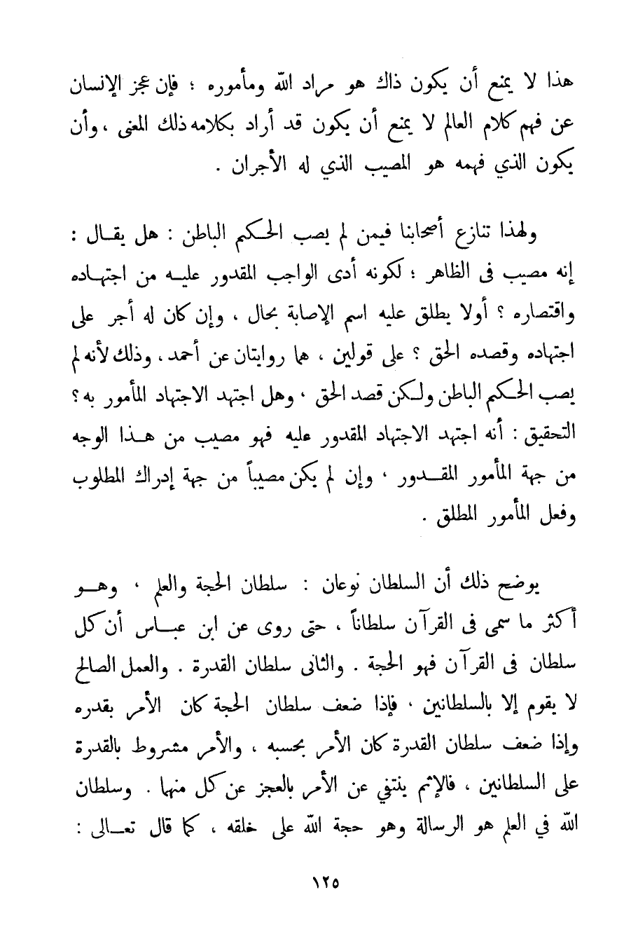 هَذَا لَا يَمْنَعُ أَنْ يَكُونَ ذَاكَ هُوَ مُرَادُ اللَّهِ وَمَأْمُورُهُ؛ فَإِنَّ عَجْزَ الْإِنْسَانِ عَنْ فَهْمِ كَلَامِ الْعَالِمِ لَا يَمْنَعُ أَنْ يَكُونَ قَدْ أَرَادَ بِكَلَامِهِ ذَلِكَ الْمَعْنَى وَأَنْ يَكُونَ الَّذِي فَهِمَهُ هُوَ الْمُصِيبُ الَّذِي لَهُ الْأَجْرَانِ. وَلِهَذَا تَنَازَعَ أَصْحَابُنَا فِيمَنْ لَمْ يُصِبْ الْحُكْمَ الْبَاطِنَ: هَلْ يُقَالُ: إنَّهُ مُصِيبٌ فِي الظَّاهِرِ؛ لِكَوْنِهِ أَدَّى الْوَاجِبَ الْمَقْدُورَ عَلَيْهِ مِنْ اجْتِهَادِهِ وَاقْتِصَارِهِ؟ أَوْ لَا يُطْلَقُ عَلَيْهِ اسْمُ الْإِصَابَةِ بِحَالِ وَإِنْ كَانَ لَهُ أَجْرٌ عَلَى اجْتِهَادِهِ وَقَصْدِهِ الْحَقَّ؟ عَلَى قَوْلَيْنِ هُمَا رِوَايَتَانِ عَنْ أَحْمَد وَذَلِكَ لِأَنَّهُ لَمْ يُصِبْ الْحُكْمَ الْبَاطِنَ وَلَكِنْ قَصَدَ الْحَقَّ وَهَلْ اجْتَهَدَ الِاجْتِهَادَ الْمَأْمُورَ بِهِ؟ التَّحْقِيقُ: أَنَّهُ اجْتَهَدَ الِاجْتِهَادَ الْمَقْدُورَ عَلَيْهِ فَهُوَ مُصِيبٌ مِنْ هَذَا الْوَجْهِ مِنْ جِهَةِ الْمَأْمُورِ الْمَقْدُورِ وَإِنْ لَمْ يَكُنْ مُصِيبًا مِنْ جِهَةِ إدْرَاكِ الْمَطْلُوبِ وَفِعْلُ الْمَأْمُورِ الْمُطْلَقِ. يُوَضِّحُ ذَلِكَ أَنَّ السُّلْطَانَ نَوْعَانِ: سُلْطَانُ الْحُجَّةِ وَالْعِلْمِ وَهُوَ أَكْثَرُ مَا سُمِّيَ فِي الْقُرْآنِ سُلْطَانًا حَتَّى رُوِيَ عَنْ ابْنِ عَبَّاسٍ أَنَّ كُلَّ سُلْطَانٍ فِي الْقُرْآنِ فَهُوَ الْحُجَّةُ. وَالثَّانِي سُلْطَانُ الْقُدْرَةِ. وَالْعَمَلُ الصَّالِحُ لَا يَقُومُ إلَّا بِالسُّلْطَانَيْنِ فَإِذَا ضَعُفَ سُلْطَانُ الْحُجَّةِ كَانَ الْأَمْرُ بِقَدْرِهِ وَإِذَا ضَعُفَ سُلْطَانُ الْقُدْرَةِ كَانَ الْأَمْرُ بِحَسَبِهِ وَالْأَمْرُ مَشْرُوطٌ بِالْقُدْرَةِ عَلَى السُّلْطَانَيْنِ فَالْإِثْمُ يَنْتَفِي عَنْ الْأَمْرِ بِالْعَجْزِ عَنْ كُلٍّ مِنْهُمَا. وَسُلْطَانُ اللَّهِ فِي الْعِلْمِ هُوَ الرِّسَالَةُ وَهُوَ حُجَّةُ اللَّهِ عَلَى خَلْقِهِ كَمَا قَالَ تَعَالَى: