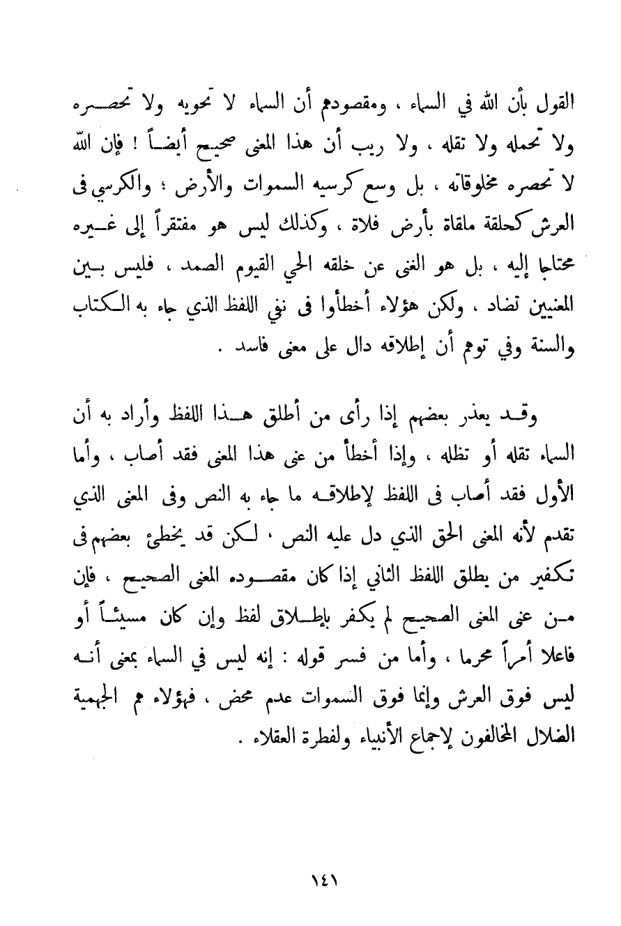 الْقَوْلَ بِأَنَّ اللَّهَ فِي السَّمَاءِ وَمَقْصُودُهُمْ أَنَّ السَّمَاءَ لَا تَحْوِيه وَلَا تَحْصُرُهُ وَلَا تَحْمِلُهُ وَلَا تُقِلُّهُ وَلَا رَيْبَ أَنَّ هَذَا الْمَعْنَى صَحِيحٌ أَيْضًا فَإِنَّ اللَّهَ لَا تَحْصُرُهُ مَخْلُوقَاتُهُ بَلْ وَسِعَ كُرْسِيُّهُ السَّمَوَاتِ وَالْأَرْضَ؛ وَالْكُرْسِيُّ فِي الْعَرْشِ كَحَلْقَةِ مُلْقَاةٍ بِأَرْضِ فَلَاةٍ وَكَذَلِكَ لَيْسَ هُوَ مُفْتَقِرًا إلَى غَيْرِهِ مُحْتَاجًا إلَيْهِ بَلْ هُوَ الْغَنِيُّ عَنْ خَلْقِهِ الْحَيُّ الْقَيُّومُ الصَّمَدُ فَلَيْسَ بَيْنَ الْمَعْنَيَيْنِ تَضَادٌّ وَلَكِنَّ هَؤُلَاءِ أَخْطَئُوا فِي نَفْيِ اللَّفْظِ الَّذِي جَاءَ بِهِ الْكِتَاب وَالسُّنَّةُ وَفِي تَوَهُّمِ أَنَّ إطْلَاقَهُ دَالٌّ عَلَى مَعْنًى فَاسِدٍ. وَقَدْ يُعْذَرُ بَعْضُهُمْ إذَا رَأَى مَنْ أَطْلَقَ هَذَا اللَّفْظَ وَأَرَادَ بِهِ أَنَّ السَّمَاءَ تُقِلُّهُ أَوْ تُظِلُّهُ وَإِذَا أَخْطَأَ مَنْ عَنَى هَذَا الْمَعْنَى فَقَدْ أَصَابَ وَأَمَّا الْأَوَّلُ فَقَدْ أَصَابَ فِي اللَّفْظِ لِإِطْلَاقِهِ مَا جَاءَ بِهِ النَّصُّ وَفِي الْمَعْنَى الَّذِي تَقَدَّمَ لِأَنَّهُ الْمَعْنَى الْحَقُّ الَّذِي دَلَّ عَلَيْهِ النَّصُّ لَكِنْ قَدْ يُخْطِئُ بَعْضُهُمْ فِي تَكْفِيرِ مَنْ يُطْلِقُ اللَّفْظَ الثَّانِيَ إذَا كَانَ مَقْصُودُهُ الْمَعْنَى الصَّحِيحَ فَإِنَّ مَنْ عَنَى الْمَعْنَى الصَّحِيحَ لَمْ يَكْفُرْ بِإِطْلَاقِ لَفْظٍ وَإِنْ كَانَ مُسِيئًا أَوْ فَاعِلًا أَمْرًا مُحَرَّمًا وَأَمَّا مَنْ فَسَّرَ قَوْلَهُ: إنَّهُ لَيْسَ فِي السَّمَاءِ بِمَعْنَى أَنَّهُ لَيْسَ فَوْقَ الْعَرْشِ وَإِنَّمَا فَوْقَ السَّمَوَاتِ عَدَمٌ مَحْضٌ فَهَؤُلَاءِ هُمْ الْجَهْمِيَّة الضُّلَّالُ الْمُخَالِفُونَ لِإِجْمَاعِ الْأَنْبِيَاءِ وَلِفِطْرَةِ الْعُقَلَاءِ.