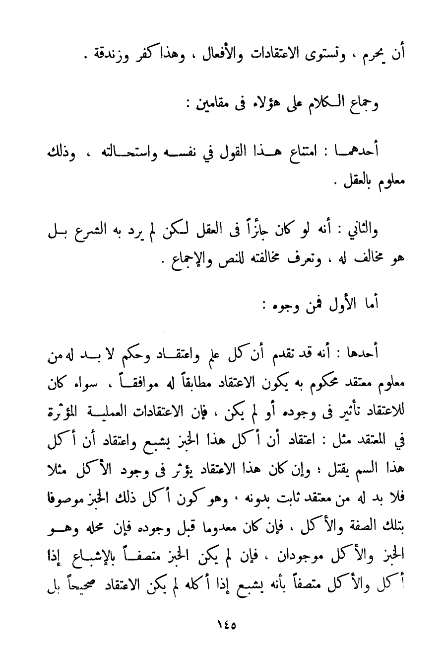 أَنْ يُحَرِّمَ وَتَسْتَوِي الِاعْتِقَادَاتُ وَالْأَفْعَالُ وَهَذَا كُفْرٌ وَزَنْدَقَةٌ. وَجِمَاعُ الْكَلَامِ عَلَى هَؤُلَاءِ فِي مَقَامَيْنِ: أَحَدُهُمَا: امْتِنَاعُ هَذَا الْقَوْلِ فِي نَفْسِهِ وَاسْتِحَالَتُهُ وَذَلِكَ مَعْلُومٌ بِالْعَقْلِ. وَالثَّانِي: أَنَّهُ لَوْ كَانَ جَائِزًا فِي الْعَقْلِ لَكِنْ لَمْ يَرِدْ بِهِ الشَّرْعُ بَلْ هُوَ مُخَالِفٌ لَهُ وَتُعْرَفُ مُخَالَفَتُهُ لِلنَّصِّ وَالْإِجْمَاعِ. أَمَّا الْأَوَّلُ فَمِنْ وُجُوهٍ: أَحَدُهَا: أَنَّهُ قَدْ تَقَدَّمَ أَنَّ كُلَّ عِلْمٍ وَاعْتِقَادٍ وَحُكْمٍ لَا بُدَّ لَهُ مِنْ مَعْلُومٍ مُعْتَقَدٍ مَحْكُومٍ بِهِ يَكُونُ الِاعْتِقَادُ مُطَابِقًا لَهُ مُوَافِقًا سَوَاءٌ كَانَ لِلِاعْتِقَادِ تَأْثِيرٌ فِي وُجُودِهِ أَوْ لَمْ يَكُنْ فَإِنَّ الِاعْتِقَادَاتِ الْعَمَلِيَّةَ الْمُؤَثِّرَةَ فِي الْمُعْتَقَدِ مِثْلَ: اعْتِقَادِ أَنَّ أَكْلَ هَذَا الْخُبْزِ يُشْبِعُ وَاعْتِقَادِ أَنَّ أَكْلَ هَذَا السُّمِّ يَقْتُلُ؛ وَإِنْ كَانَ هَذَا الِاعْتِقَادُ يُؤَثِّرُ فِي وُجُودِ الْأَكْلِ مَثَلًا فَلَا بُدَّ لَهُ مِنْ مُعْتَقَدٍ ثَابِتٍ بِدُونِهِ وَهُوَ كَوْنُ أَكْلِ ذَلِكَ الْخُبْزِ مَوْصُوفًا بِتِلْكَ الصِّفَةِ وَالْأَكْلِ فَإِنْ كَانَ مَعْدُومًا قَبْلَ وُجُودِهِ فَإِنَّ مَحَلَّهُ وَهُوَ الْخُبْزُ وَالْأَكْلُ مَوْجُودَانِ فَإِنْ لَمْ يَكُنْ الْخُبْزُ مُتَّصِفًا بِالْإِشْبَاعِ إذَا أُكِلَ وَالْأَكْلُ مُتَّصِفًا بِأَنَّهُ يُشْبِعُ إذَا أَكَلَهُ لَمْ يَكُنْ الِاعْتِقَادُ صَحِيحًا بَلْ