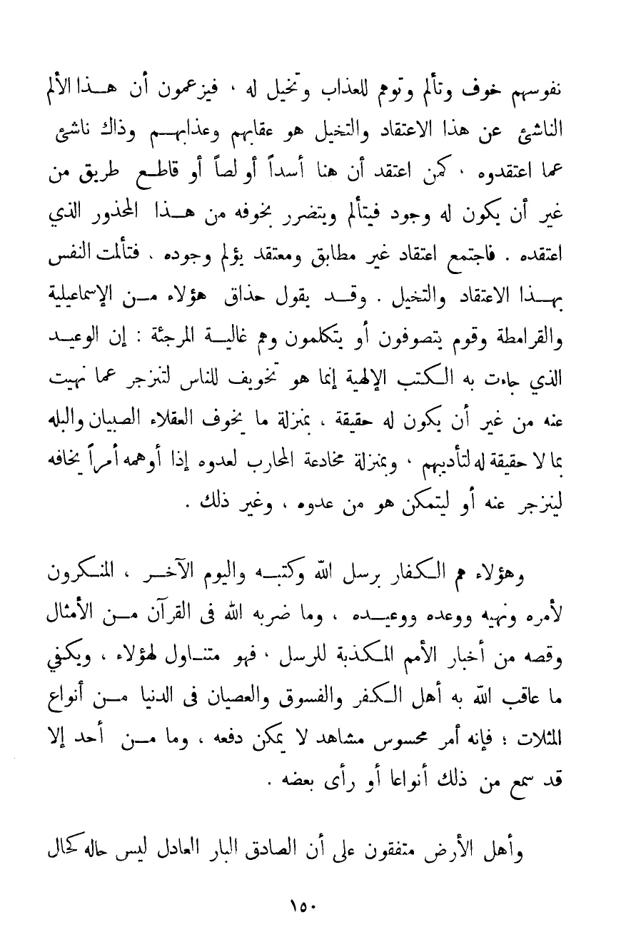 نُفُوسِهِمْ خَوْفٌ وَتَأَلُّمٌ وَتَوَهُّمٌ لِلْعَذَابِ وَتَخَيُّلٌ لَهُ فَيَزْعُمُونَ أَنَّ هَذَا الْأَلَمَ النَّاشِئَ عَنْ هَذَا الِاعْتِقَادِ وَالتَّخَيُّلِ هُوَ عِقَابُهُمْ وَعَذَابُهُمْ وَذَاكَ نَاشِئٌ عَمَّا اعْتَقَدُوهُ كَمَنْ اعْتَقَدَ أَنَّ هُنَا أَسَدًا أَوْ لِصًّا أَوْ قَاطِعَ طَرِيقٍ مِنْ غَيْرِ أَنْ يَكُونَ لَهُ وُجُودٌ فَيَتَأَلَّمُ وَيَتَضَرَّرُ بِخَوْفِهِ مِنْ هَذَا الْمَحْذُورِ الَّذِي اعْتَقَدَهُ. فَاجْتَمَعَ اعْتِقَادٌ غَيْرُ مُطَابِقٍ وَمُعْتَقَدٌ يُؤْلِمُ وُجُودُهُ فَتَأَلَّمَتْ النَّفْسُ بِهَذَا الِاعْتِقَادِ وَالتَّخَيُّلِ. وَقَدْ يَقُولُ حُذَّاقُ هَؤُلَاءِ مِنْ الْإِسْمَاعِيلِيَّة وَالْقَرَامِطَةِ وَقَوْمٍ يَتَصَوَّفُونَ أَوْ يَتَكَلَّمُونَ وَهُمْ غَالِيَةُ الْمُرْجِئَةِ: إنَّ الْوَعِيدَ الَّذِي جَاءَتْ بِهِ الْكُتُبُ الْإِلَهِيَّةُ إنَّمَا هُوَ تَخْوِيفٌ لِلنَّاسِ لِتَنْزَجِرَ عَمَّا نُهِيَتْ عَنْهُ مِنْ غَيْرِ أَنْ يَكُونَ لَهُ حَقِيقَةٌ بِمَنْزِلَةِ مَا يُخَوِّفُ الْعُقَلَاءُ الصِّبْيَانَ وَالْبُلْهَ بِمَا لَا حَقِيقَةَ لَهُ لِتَأْدِيبِهِمْ وَبِمَنْزِلَةِ مُخَادَعَةِ الْمُحَارِبِ لِعَدُوِّهِ إذَا أَوْهَمَهُ أَمْرًا يَخَافُهُ لِيَنْزَجِرَ عَنْهُ أَوْ لِيَتَمَكَّنَ هُوَ مِنْ عَدُوِّهِ وَغَيْرِ ذَلِكَ. وَهَؤُلَاءِ هُمْ الْكُفَّارُ بِرُسُلِ اللَّهِ وَكُتُبِهِ وَالْيَوْمِ الْآخِرِ الْمُنْكِرُونَ لِأَمْرِهِ وَنَهْيِهِ وَوَعْدِهِ وَوَعِيدِهِ وَمَا ضَرَبَهُ اللَّهُ فِي الْقُرْآنِ مِنْ الْأَمْثَالِ وَقَصَّهُ مِنْ أَخْبَارِ الْأُمَمِ الْمُكَذِّبَةِ لِلرُّسُلِ فَهُوَ مُتَنَاوِلٌ لِهَؤُلَاءِ وَيَكْفِي مَا عَاقَبَ اللَّهُ بِهِ أَهْلَ الْكُفْرِ وَالْفُسُوقِ وَالْعِصْيَانِ فِي الدُّنْيَا مِنْ أَنْوَاعِ الْمَثُلَاتِ؛ فَإِنَّهُ أَمْرٌ مَحْسُوسٌ مُشَاهَدٌ لَا يُمْكِنُ دَفْعُهُ وَمَا مِنْ أَحَدٍ إلَّا قَدْ سَمِعَ مِنْ ذَلِكَ أَنْوَاعًا أَوْ رَأَى بَعْضَهُ. وَأَهْلُ الْأَرْضِ مُتَّفِقُونَ عَلَى أَنَّ الصَّادِقَ الْبَارَّ الْعَادِلَ لَيْسَ حَالُهُ كَحَالِ