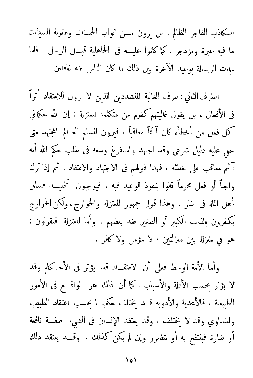 وَأَمَّا الْأُمَّةُ الْوَسَطُ فَعَلَى أَنَّ الِاعْتِقَادَ قَدْ يُؤَثِّرُ فِي الْأَحْكَامِ وَقَدْ لَا يُؤَثِّرُ بِحَسَبِ الْأَدِلَّةِ وَالْأَسْبَابِ كَمَا أَنَّ ذَلِكَ هُوَ الْوَاقِعُ فِي الْأُمُورِ الطَّبِيعِيَّةِ فَالْأَغْذِيَةُ وَالْأَدْوِيَةُ قَدْ يَخْتَلِفُ حُكْمُهَا بِحَسَبِ اعْتِقَادِ الطَّبِيبِ وَالْمُتَدَاوِي وَقَدْ لَا يَخْتَلِفُ وَقَدْ يَعْتَقِدُ الْإِنْسَانُ فِي الشَّيْءِ صِفَةً نَافِعَةً أَوْ ضَارَّةً فَيَنْتَفِعُ بِهِ أَوْ يَتَضَرَّرُ وَإِنْ لَمْ يَكُنْ كَذَلِكَ وَقَدْ يَعْتَقِدُ ذَلِكَ