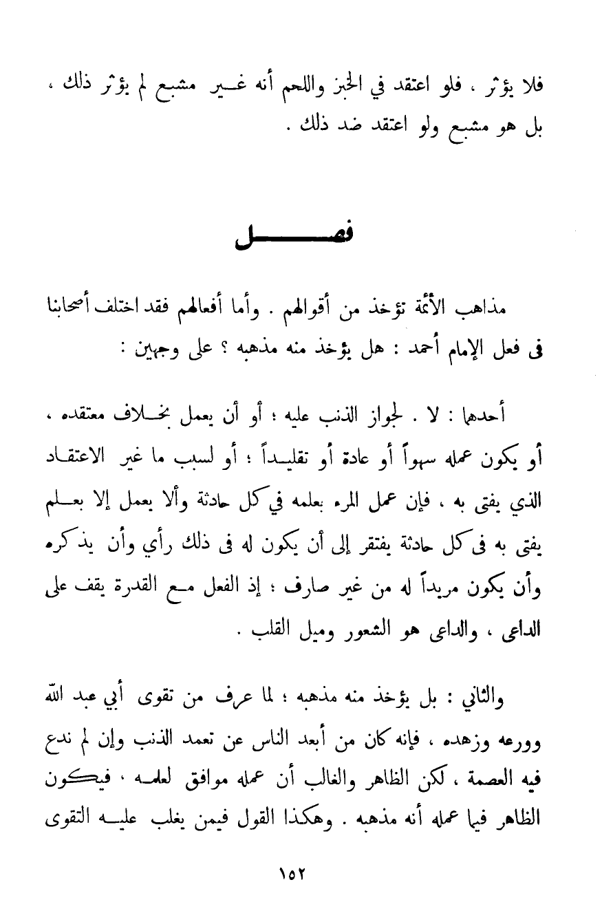 مَذَاهِبُ الْأَئِمَّةِ تُؤْخَذُ مِنْ أَقْوَالِهِمْ. وَأَمَّا أَفْعَالُهُمْ فَقَدْ اخْتَلَفَ أَصْحَابُنَا فِي فِعْلِ الْإِمَامِ أَحْمَد: هَلْ يُؤْخَذُ مِنْهُ مَذْهَبُهُ؟ عَلَى وَجْهَيْنِ: أَحَدُهُمَا: لَا. لِجَوَازِ الذَّنْبِ عَلَيْهِ؛ أَوْ أَنْ يَعْمَلَ بِخِلَافِ مُعْتَقَدِهِ أَوْ يَكُونُ عَمَلُهُ سَهْوًا أَوْ عَادَةً أَوْ تَقْلِيدًا؛ أَوْ لِسَبَبٍ مَا غَيْرَ الِاعْتِقَادِ الَّذِي يُفْتَى بِهِ فَإِنَّ عَمَلَ الْمَرْءِ بِعِلْمِهِ فِي كُلِّ حَادِثَةٍ وَأَلَّا يَعْمَلَ إلَّا بِعِلْمٍ يُفْتَى بِهِ فِي كُلِّ حَادِثَةٍ يَفْتَقِرُ إلَى أَنْ يَكُونَ لَهُ فِي ذَلِكَ رَأْيٌ وَأَنْ يَذْكُرَهُ وَأَنْ يَكُونَ مُرِيدًا لَهُ مِنْ غَيْرِ صَارِفٍ؛ إذْ الْفِعْلُ مَعَ الْقُدْرَةِ يَقِفُ عَلَى الدَّاعِي وَالدَّاعِي هُوَ الشُّعُورُ وَمَيْلُ الْقَلْبِ. وَالثَّانِي: بَلْ يُؤْخَذُ مِنْهُ مَذْهَبُهُ؛ لِمَا عُرِفَ مِنْ تَقْوَى أَبِي عَبْدِ اللَّهِ وَوَرَعِهِ وَزُهْدِهِ فَإِنَّهُ كَانَ مِنْ أَبْعَدِ النَّاسِ عَنْ تَعَمُّدِ الذَّنْبِ وَإِنْ لَمْ نَدَّعِ فِيهِ الْعِصْمَةَ لَكِنَّ الظَّاهِرَ وَالْغَالِبَ أَنَّ عَمَلَهُ مُوَافِقٌ لِعِلْمِهِ فَيَكُونُ الظَّاهِرُ فِيمَا عَمِلَهُ أَنَّهُ مَذْهَبُهُ. وَهَكَذَا الْقَوْلُ فِيمَنْ يَغْلِبُ عَلَيْهِ التَّقْوَى