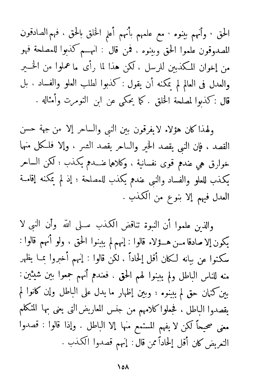 الْحَقَّ وَأَنَّهُمْ بَيَّنُوهُ مَعَ عِلْمِهِمْ بِأَنَّهُمْ أَعْلَمُ الْخَلْقِ بِالْحَقِّ فَهُمْ الصَّادِقُونَ الْمَصْدُوقُونَ عَلِمُوا الْحَقَّ وَبَيَّنُوهُ فَمَنْ قَالَ: إنَّهُمْ كَذَبُوا لِلْمَصْلَحَةِ فَهُوَ مِنْ إخْوَانِ الْمُكَذِّبِينَ لِلرُّسُلِ لَكِنَّ هَذَا لَمَّا رَأَى مَا عَمِلُوا مِنْ الْخَيْرِ وَالْعَدْلِ فِي الْعَالَمِ لَمْ يُمْكِنْهُ أَنْ يَقُولَ: كَذَبُوا لِطَلَبِ الْعُلُوِّ وَالْفَسَادِ بَلْ قَالَ: كَذَبُوا لِمَصْلَحَةِ الْخَلْقِ. كَمَا يُحْكَى عَنْ ابْنِ التومرت وَأَمْثَالِهِ. وَلِهَذَا كَانَ هَؤُلَاءِ لَا يُفَرِّقُونَ بَيْنَ النَّبِيِّ وَالسَّاحِرِ إلَّا مِنْ جِهَةِ حُسْنِ الْقَصْدِ فَإِنَّ النَّبِيَّ يَقْصِدُ الْخَيْرَ وَالسَّاحِرَ يَقْصِدُ الشَّرَّ وَإِلَّا فَلِكُلٍّ مِنْهُمَا خَوَارِقُ هِيَ عِنْدَهُمْ قُوَى نَفْسَانِيَّةٌ وَكِلَاهُمَا عِنْدَهُمْ يَكْذِبُ؛ لَكِنَّ السَّاحِرَ يَكْذِبُ لِلْعُلُوِّ وَالْفَسَادِ وَالنَّبِيُّ عِنْدَهُمْ يَكْذِبُ لِلْمَصْلَحَةِ؛ إذْ لَمْ يُمْكِنْهُ إقَامَةُ الْعَدْلِ فِيهِمْ إلَّا بِنَوْعٍ مِنْ الْكَذِبِ. وَاَلَّذِينَ عَلِمُوا أَنَّ النُّبُوَّةَ تُنَاقِضُ الْكَذِبَ عَلَى اللَّهِ وَأَنَّ النَّبِيَّ لَا يَكُونُ إلَّا صَادِقًا مِنْ هَؤُلَاءِ قَالُوا: إنَّهُمْ لَمْ يُبَيِّنُوا الْحَقَّ وَلَوْ أَنَّهُمْ قَالُوا: سَكَتُوا عَنْ بَيَانِهِ لَكَانَ أَقَلَّ إلْحَادًا لَكِنْ قَالُوا: إنَّهُمْ أَخْبَرُوا بِمَا يَظْهَرُ مِنْهُ لِلنَّاسِ الْبَاطِلُ وَلَمْ يُبَيِّنُوا لَهُمْ الْحَقَّ فَعِنْدَهُمْ أَنَّهُمْ جَمَعُوا بَيْنَ شَيْئَيْنِ: بَيْنَ كِتْمَانِ حَقٍّ لَمْ يُبَيِّنُوهُ؛ وَبَيْنَ إظْهَارِ مَا يَدُلُّ عَلَى الْبَاطِلِ وَإِنْ كَانُوا لَمْ يَقْصِدُوا الْبَاطِلَ فَجَعَلُوا كَلَامَهُمْ مِنْ جِنْسِ الْمَعَارِيضِ الَّتِي يَعْنِي بِهَا الْمُتَكَلِّمُ مَعْنًى صَحِيحًا لَكِنْ لَا يَفْهَمُ الْمُسْتَمِعُ مِنْهَا إلَّا الْبَاطِلَ. وَإِذَا قَالُوا: قَصَدُوا التَّعْرِيضَ كَانَ أَقَلَّ إلْحَادًا مِمَّنْ قَالَ: إنَّهُمْ قَصَدُوا الْكَذِبَ.