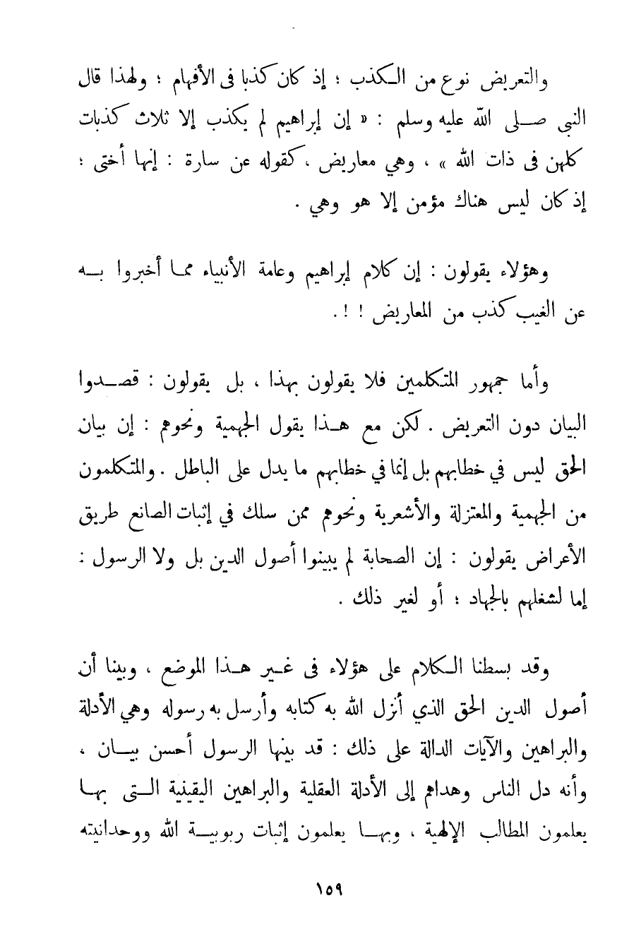 وَالتَّعْرِيضُ نَوْعٌ مِنْ الْكَذِبِ؛ إذْ كَانَ كَذِبًا فِي الْأَفْهَامِ؛ وَلِهَذَا قَالَ النَّبِيُّ صَلَّى اللَّهُ عَلَيْهِ وَسَلَّمَ {إنَّ إبْرَاهِيمَ لَمْ يَكْذِبْ إلَّا ثَلَاثَ كِذْبَاتٍ كُلُّهُنَّ فِي ذَاتِ اللَّهِ} وَهِيَ مَعَارِيضُ كَقَوْلِهِ عَنْ سَارَّةَ: إنَّهَا أُخْتِي؛ إذْ كَانَ لَيْسَ هُنَاكَ مُؤْمِنٌ إلَّا هُوَ وَهِيَ. وَهَؤُلَاءِ يَقُولُونَ: إنَّ كَلَامَ إبْرَاهِيمَ وَعَامَّةِ الْأَنْبِيَاءِ مِمَّا أَخْبَرُوا بِهِ عَنْ الْغَيْبِ كَذِبٌ مِنْ الْمَعَارِيضِ. وَأَمَّا جُمْهُورُ الْمُتَكَلِّمِينَ فَلَا يَقُولُونَ بِهَذَا بَلْ يَقُولُونَ: قَصَدُوا الْبَيَانَ دُونَ التَّعْرِيضِ. لَكِنْ مَعَ هَذَا يَقُولُ الْجَهْمِيَّة وَنَحْوُهُمْ: إنَّ بَيَانَ الْحَقِّ لَيْسَ فِي خِطَابِهِمْ بَلْ إنَّمَا فِي خِطَابِهِمْ مَا يَدُلُّ عَلَى الْبَاطِلِ. والمتكلمون مِنْ الْجَهْمِيَّة وَالْمُعْتَزِلَةِ وَالْأَشْعَرِيَّةِ وَنَحْوِهِمْ مِمَّنْ سَلَكَ فِي إثْبَاتِ الصَّانِعِ طَرِيقَ الْأَعْرَاضِ يَقُولُونَ: إنَّ الصَّحَابَةَ لَمْ يُبَيِّنُوا أُصُولَ الدِّينِ بَلْ وَلَا الرَّسُولُ: إمَّا لِشَغْلِهِمْ بِالْجِهَادِ؛ أَوْ لِغَيْرِ ذَلِكَ. وَقَدْ بَسَطْنَا الْكَلَامَ عَلَى هَؤُلَاءِ فِي غَيْرِ هَذَا الْمَوْضِعِ وَبَيَّنَّا أَنَّ أُصُولَ الدِّينِ الْحَقِّ الَّذِي أَنْزَلَ اللَّهُ بِهِ كِتَابَهُ وَأَرْسَلَ بِهِ رَسُولَهُ وَهِيَ الْأَدِلَّةُ وَالْبَرَاهِينُ وَالْآيَاتُ الدَّالَّةُ عَلَى ذَلِكَ: قَدْ بَيَّنَهَا الرَّسُولُ أَحْسَنَ بَيَانٍ وَأَنَّهُ دَلَّ النَّاسَ وَهَدَاهُمْ إلَى الْأَدِلَّةِ الْعَقْلِيَّةِ وَالْبَرَاهِينِ الْيَقِينِيَّةِ الَّتِي بِهَا يَعْلَمُونَ الْمَطَالِبَ الْإِلَهِيَّةَ وَبِهَا يَعْلَمُونَ إثْبَاتَ رُبُوبِيَّةِ اللَّهِ وَوَحْدَانِيِّتِهِ