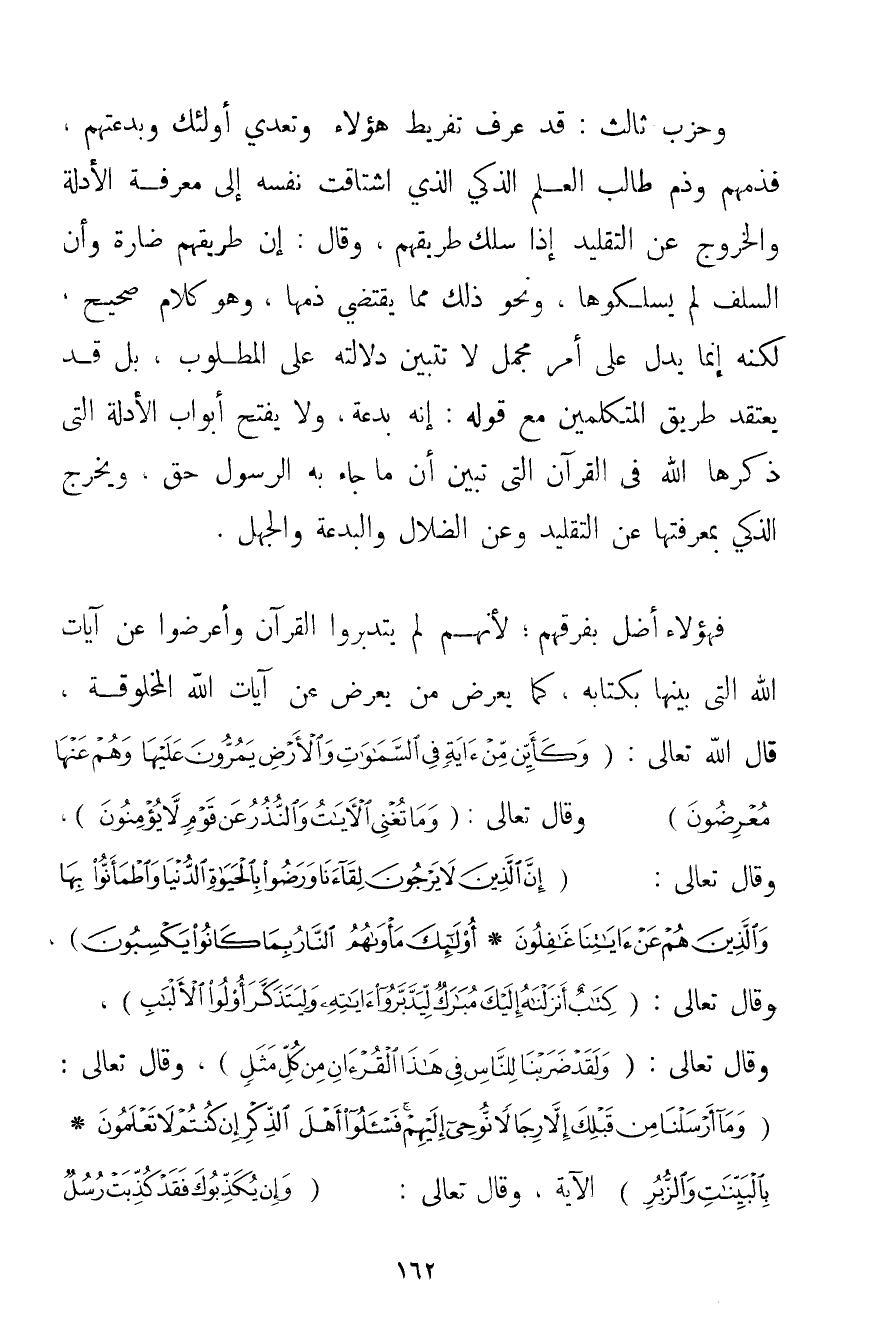 وَحِزْبٌ ثَالِثٌ: قَدْ عَرَفَ تَفْرِيطَ هَؤُلَاءِ وَتَعَدِّيَ أُولَئِكَ وَبِدْعَتَهُمْ فَذَمَّهُمْ وَذَمَّ طَالِبَ الْعِلْمِ الذَّكِيَّ الَّذِي اشْتَاقَتْ نَفْسُهُ إلَى مَعْرِفَةِ الْأَدِلَّةِ وَالْخُرُوجِ عَنْ التَّقْلِيدِ إذَا سَلَكَ طَرِيقَهُمْ وَقَالَ: إنَّ طَرِيقَهُمْ ضَارَّةٌ وَأَنَّ السَّلَفَ لَمْ يَسْلُكُوهَا وَنَحْوَ ذَلِكَ مِمَّا يَقْتَضِي ذَمَّهَا وَهُوَ كَلَامٌ صَحِيحٌ لَكِنَّهُ إنَّمَا يَدُلُّ عَلَى أَمْرٍ مُجْمَلٍ لَا تَتَبَيَّنُ دَلَالَتُهُ عَلَى الْمَطْلُوبِ بَلْ قَدْ يَعْتَقِدُ طَرِيقَ الْمُتَكَلِّمِينَ مَعَ قَوْلِهِ: إنَّهُ بِدْعَةٌ وَلَا يَفْتَحُ أَبْوَابَ الْأَدِلَّةِ الَّتِي ذَكَرَهَا اللَّهُ فِي الْقُرْآنِ الَّتِي تُبَيِّنُ أَنَّ مَا جَاءَ بِهِ الرَّسُولُ حَقٌّ وَيَخْرُجُ الذَّكِيُّ بِمَعْرِفَتِهَا عَنْ التَّقْلِيدِ وَعَنْ الضَّلَالِ وَالْبِدْعَةِ وَالْجَهْلِ. فَهَؤُلَاءِ أَضَلُّ بِفِرَقِهِمْ؛ لِأَنَّهُمْ لَمْ يَتَدَبَّرُوا الْقُرْآنَ وَأَعْرَضُوا عَنْ آيَاتِ اللَّهِ الَّتِي بَيَّنَهَا بِكِتَابِهِ كَمَا يُعْرِضُ مَنْ يُعْرِضُ عَنْ آيَاتِ اللَّهِ الْمَخْلُوقَةِ قَالَ اللَّهُ تَعَالَى: {وَكَأَيِّنْ مِنْ آيَةٍ فِي السَّمَاوَاتِ وَالْأَرْضِ يَمُرُّونَ عَلَيْهَا وَهُمْ عَنْهَا مُعْرِضُونَ} وَقَالَ تَعَالَى: {وَمَا تُغْنِي الْآيَاتُ وَالنُّذُرُ عَنْ قَوْمٍ لَا يُؤْمِنُونَ} وَقَالَ تَعَالَى: {إنَّ الَّذِينَ لَا يَرْجُونَ لِقَاءَنَا وَرَضُوا بِالْحَيَاةِ الدُّنْيَا وَاطْمَأَنُّوا بِهَا وَالَّذِينَ هُمْ عَنْ آيَاتِنَا غَافِلُونَ} {أُولَئِكَ مَأْوَاهُمُ النَّارُ بِمَا كَانُوا يَكْسِبُونَ} وَقَالَ تَعَالَى: {كِتَابٌ أَنْزَلْنَاهُ إلَيْكَ مُبَارَكٌ لِيَدَّبَّرُوا آيَاتِهِ وَلِيَتَذَكَّرَ أُولُو الْأَلْبَابِ} وَقَالَ تَعَالَى: {وَلَقَدْ ضَرَبْنَا لِلنَّاسِ فِي هَذَا الْقُرْآنِ مِنْ كُلِّ مَثَلٍ} وَقَالَ تَعَالَى: {وَمَا أَرْسَلْنَا مِنْ قَبْلِكَ إلَّا رِجَالًا نُوحِي إلَيْهِمْ فَاسْأَلُوا أَهْلَ الذِّكْرِ إنْ كُنْتُمْ لَا تَعْلَمُونَ} {بِالْبَيِّنَاتِ وَالزُّبُرِ} الْآيَةَ وَقَالَ