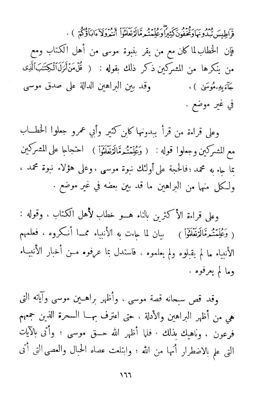 جَاءَ بِهِ مُوسَى نُورًا وَهُدًى لِلنَّاسِ تَجْعَلُونَهُ قَرَاطِيسَ تُبْدُونَهَا وَتُخْفُونَ كَثِيرًا وَعُلِّمْتُمْ مَا لَمْ تَعْلَمُوا أَنْتُمْ وَلَا آبَاؤُكُمْ} فَإِنَّ الْخِطَابَ لَمَّا كَانَ مَعَ مَنْ يُقِرُّ بِنُبُوَّةِ مُوسَى مِنْ أَهْلِ الْكِتَابِ وَمَعَ مَنْ يُنْكِرُهَا مِنْ الْمُشْرِكِينَ ذَكَرَ ذَلِكَ بِقَوْلِهِ: {قُلْ مَنْ أَنْزَلَ الْكِتَابَ الَّذِي جَاءَ بِهِ مُوسَى} وَقَدْ بَيَّنَ الْبَرَاهِينَ الدَّالَّةَ عَلَى صِدْقِ مُوسَى فِي غَيْرِ مَوْضِعٍ. وَعَلَى قِرَاءَةِ مَنْ قَرَأَ يُبْدُونَهَا كَابْنِ كَثِيرٍ وَأَبِي عَمْرٍو جَعَلُوا الْخِطَابَ مَعَ الْمُشْرِكِينَ وَجَعَلُوا قَوْلَهُ: {وَعُلِّمْتُمْ مَا لَمْ تَعْلَمُوا} احْتِجَاجًا عَلَى الْمُشْرِكِينَ بِمَا جَاءَ بِهِ مُحَمَّدٌ؛ فَالْحُجَّةُ عَلَى أُولَئِكَ نُبُوَّةُ مُوسَى وَعَلَى هَؤُلَاءِ نُبُوَّةُ مُحَمَّدٍ وَلِكُلٍّ مِنْهُمَا مِنْ الْبَرَاهِينِ مَا قَدْ بُيِّنَ بَعْضُهُ فِي غَيْرِ مَوْضِعٍ. وَعَلَى قِرَاءَةِ الْأَكْثَرِينَ بِالتَّاءِ هُوَ خِطَابٌ لِأَهْلِ الْكِتَابِ وَقَوْلُهُ: {وَعُلِّمْتُمْ مَا لَمْ تَعْلَمُوا} بَيَانٌ لِمَا جَاءَتْ بِهِ الْأَنْبِيَاءُ مِمَّا أَنْكَرُوهُ فَعَلَّمَهُمْ الْأَنْبِيَاءُ مَا لَمْ يَقْبَلُوهُ وَلَمْ يَعْلَمُوهُ فَاسْتَدَلَّ بِمَا عَرَفُوهُ مِنْ أَخْبَارِ الْأَنْبِيَاءِ وَمَا لَمْ يَعْرِفُوهُ. وَقَدْ قَصَّ سُبْحَانَهُ قِصَّةَ مُوسَى وَأَظْهَرَ بَرَاهِينَ مُوسَى وَآيَاتِهِ الَّتِي هِيَ مِنْ أَظْهَرِ الْبَرَاهِينِ وَالْأَدِلَّةِ حَتَّى اعْتَرَفَ بِهَا السَّحَرَةُ الَّذِينَ جَمَعَهُمْ فِرْعَوْنُ وَنَاهِيك بِذَلِكَ فَلَمَّا أَظْهَرَ اللَّهُ حَقَّ مُوسَى؛ وَأَتَى بِالْآيَاتِ الَّتِي عُلِمَ بِالِاضْطِرَارِ أَنَّهَا مِنْ اللَّهِ؛ وَابْتَلَعَتْ عَصَاهُ الْحِبَالَ وَالْعِصِيَّ الَّتِي أَتَى