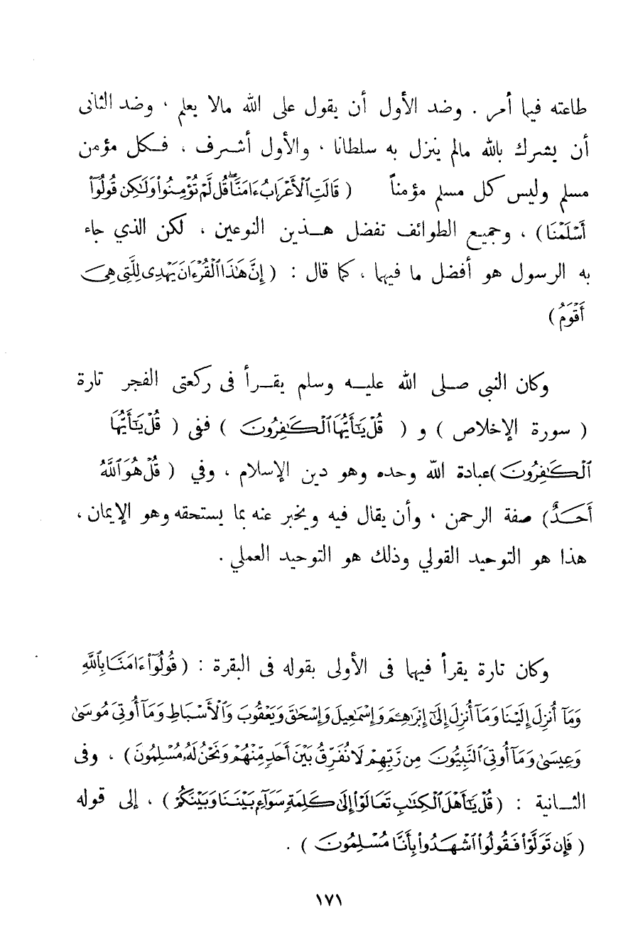 طَاعَتُهُ فِيمَا أَمَرَ. وَضِدَّ الْأَوَّلِ أَنْ يَقُولَ عَلَى اللَّهِ مَا لَا يَعْلَمْ وَضِدَّ الثَّانِي أَنْ يُشْرِكَ بِاَللَّهِ مَا لَمْ يُنَزِّلْ بِهِ سُلْطَانًا وَالْأَوَّلُ أَشْرَفُ فَكُلُّ مُؤْمِنٍ مُسْلِمٌ وَلَيْسَ كُلُّ مُسْلِمٍ مُؤْمِنًا {قَالَتِ الْأَعْرَابُ آمَنَّا قُلْ لَمْ تُؤْمِنُوا وَلَكِنْ قُولُوا أَسْلَمْنَا} وَجَمِيعُ الطَّوَائِفِ تُفَضِّلُ هَذَيْنِ النَّوْعَيْنِ لَكِنَّ الَّذِي جَاءَ بِهِ الرَّسُولُ هُوَ أَفْضَلُ مَا فِيهِمَا كَمَا قَالَ: {إنَّ هَذَا الْقُرْآنَ يَهْدِي لِلَّتِي هِيَ أَقْوَمُ} وَكَانَ النَّبِيُّ صَلَّى اللَّهُ عَلَيْهِ وَسَلَّمَ يَقْرَأُ فِي رَكْعَتَيْ الْفَجْرِ تَارَةً (سُورَةَ الْإِخْلَاصِ و (قُلْ يَا أَيُّهَا الْكَافِرُونَ فَفِي (قُلْ يَا أَيُّهَا الْكَافِرُونَ عِبَادَةُ اللَّهِ وَحْدَهُ وَهُوَ دِينُ الْإِسْلَامِ وَفِي (قُلْ هُوَ اللَّهُ أَحَدٌ صِفَةُ الرَّحْمَنِ وَأَنْ يُقَالَ فِيهِ وَيُخْبَرَ عَنْهُ بِمَا يَسْتَحِقُّهُ وَهُوَ الْإِيمَانُ هَذَا هُوَ التَّوْحِيدُ الْقَوْلِيُّ وَذَلِكَ هُوَ التَّوْحِيدُ الْعَمَلِيُّ. وَكَانَ تَارَةً يَقْرَأُ فِيهِمَا فِي الْأُولَى بِقَوْلِهِ فِي الْبَقَرَةِ: {قُولُوا آمَنَّا بِاللَّهِ وَمَا أُنْزِلَ إلَيْنَا وَمَا أُنْزِلَ إلَى إبْرَاهِيمَ وَإِسْمَاعِيلَ وَإِسْحَاقَ وَيَعْقُوبَ وَالْأَسْبَاطِ وَمَا أُوتِيَ مُوسَى وَعِيسَى وَمَا أُوتِيَ النَّبِيُّونَ مِنْ رَبِّهِمْ لَا نُفَرِّقُ بَيْنَ أَحَدٍ مِنْهُمْ وَنَحْنُ لَهُ مُسْلِمُونَ} وَفِي الثَّانِيَةِ: {قُلْ يَا أَهْلَ الْكِتَابِ تَعَالَوْا إلَى كَلِمَةٍ سَوَاءٍ بَيْنَنَا وَبَيْنَكُمْ} إلَى قَوْلِهِ {فَإِنْ تَوَلَّوْا فَقُولُوا اشْهَدُوا بِأَنَّا مُسْلِمُونَ} .