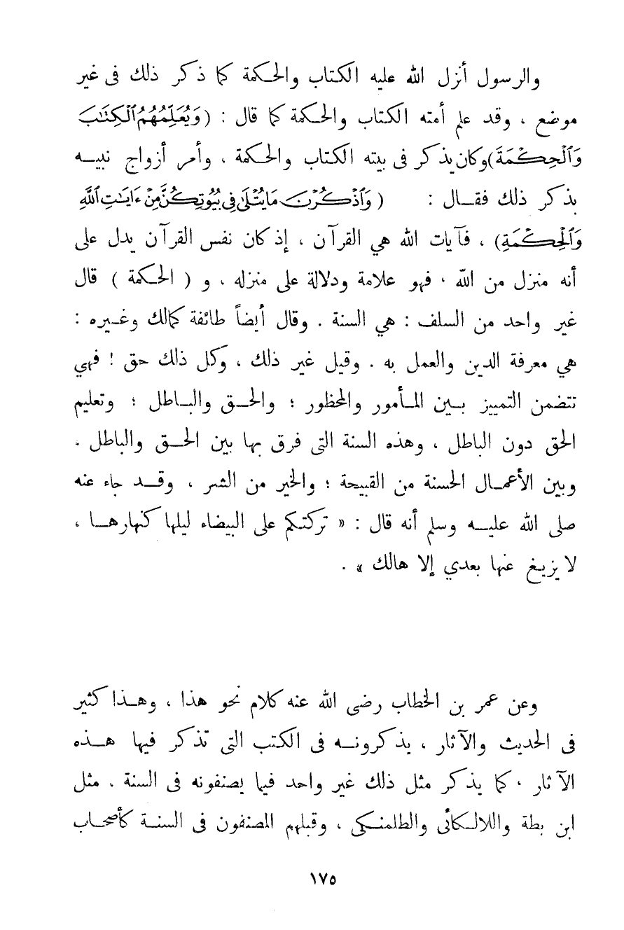 وَالرَّسُولِ فَاصِلًا لِلنِّزَاعِ لَمْ يُؤْمَرُوا بِالرَّدِّ إلَيْهِ. وَالرَّسُولُ أَنْزَلَ اللَّهُ عَلَيْهِ الْكِتَابَ وَالْحِكْمَةَ كَمَا ذَكَرَ ذَلِكَ فِي غَيْرِ مَوْضِعٍ وَقَدْ عَلَّمَ أُمَّتَهُ الْكِتَابَ وَالْحِكْمَةَ كَمَا قَالَ: {وَيُعَلِّمُهُمُ الْكِتَابَ وَالْحِكْمَةَ} وَكَانَ يَذْكُرُ فِي بَيْتِهِ الْكِتَابَ وَالْحِكْمَةَ وَأَمَرَ أَزْوَاجَ نَبِيِّهِ بِذِكْرِ ذَلِكَ فَقَالَ: {وَاذْكُرْنَ مَا يُتْلَى فِي بُيُوتِكُنَّ مِنْ آيَاتِ اللَّهِ وَالْحِكْمَةِ} فَآيَاتُ اللَّهِ هِيَ الْقُرْآنُ إذْ كَانَ نَفْسُ الْقُرْآنِ يَدُلُّ عَلَى أَنَّهُ مُنَزَّلٌ مِنْ اللَّهِ فَهُوَ عَلَامَةٌ وَدَلَالَةٌ عَلَى مَنْزِلِهِ و (الْحِكْمَةُ قَالَ غَيْرُ وَاحِدٍ مِنْ السَّلَفِ: هِيَ السُّنَّةُ. وَقَالَ أَيْضًا طَائِفَةٌ كَمَالِكٍ وَغَيْرِهِ: هِيَ مَعْرِفَةُ الدِّينِ وَالْعَمَلُ بِهِ. وَقِيلَ غَيْرُ ذَلِكَ وَكُلُّ ذَلِكَ حَقٌّ فَهِيَ تَتَضَمَّنُ التَّمْيِيزَ بَيْنَ الْمَأْمُورِ وَالْمَحْظُورِ؛ وَالْحَقِّ وَالْبَاطِلِ؛ وَتَعْلِيمِ الْحَقِّ دُونَ الْبَاطِلِ وَهَذِهِ السُّنَّةُ الَّتِي فَرَّقَ بِهَا بَيْنَ الْحَقِّ وَالْبَاطِلِ وَبَيْنَ الْأَعْمَالِ الْحَسَنَةِ مِنْ الْقَبِيحَةِ؛ وَالْخَيْرِ مِنْ الشَّرِّ وَقَدْ جَاءَ عَنْهُ صَلَّى اللَّهُ عَلَيْهِ وَسَلَّمَ أَنَّهُ قَالَ: {تَرَكْتُكُمْ عَلَى الْبَيْضَاءِ لَيْلُهَا كَنَهَارِهَا لَا يَزِيغُ عَنْهَا بَعْدِي إلَّا هَالِكٌ} . وَعَنْ عُمَرَ بْنِ الْخَطَّابِ رَضِيَ اللَّهُ عَنْهُ كَلَامٌ نَحْوُ هَذَا وَهَذَا كَثِيرٌ فِي الْحَدِيثِ وَالْآثَارِ يَذْكُرُونَهُ فِي الْكُتُبِ الَّتِي تُذْكَرُ فِيهَا هَذِهِ الْآثَارُ كَمَا يَذْكُرُ مِثْلَ ذَلِكَ غَيْرُ وَاحِدٍ فِيمَا يَصِفُونَهُ فِي السُّنَّةِ مِثْلَ ابْنِ بَطَّةَ واللالكائي والطلمنكي وَقَبْلَهُمْ الْمُصَنِّفُونَ فِي السُّنَّةِ كَأَصْحَابِ