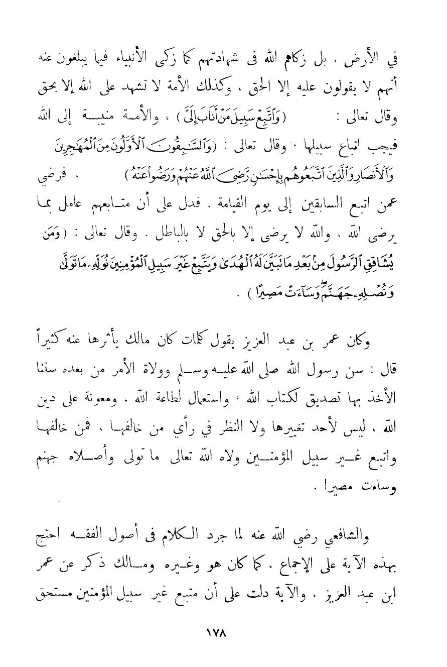 فِي الْأَرْضِ بَلْ زَكَّاهُمْ اللَّهُ فِي شَهَادَتِهِمْ كَمَا زَكَّى الْأَنْبِيَاءَ فِيمَا يُبَلِّغُونَ عَنْهُ أَنَّهُمْ لَا يَقُولُونَ عَلَيْهِ إلَّا الْحَقَّ وَكَذَلِكَ الْأُمَّةُ لَا تَشْهَدُ عَلَى اللَّهِ إلَّا بِحَقٍّ وَقَالَ تَعَالَى: {وَاتَّبِعْ سَبِيلَ مَنْ أَنَابَ إلَيَّ} وَالْأُمَّةُ مُنِيبَةٌ إلَى اللَّهِ فَيَجِبُ اتِّبَاعُ سَبِيلِهَا وَقَالَ تَعَالَى: {وَالسَّابِقُونَ الْأَوَّلُونَ مِنَ الْمُهَاجِرِينَ وَالْأَنْصَارِ وَالَّذِينَ اتَّبَعُوهُمْ بِإِحْسَانٍ رَضِيَ اللَّهُ عَنْهُمْ وَرَضُوا عَنْهُ} فَرَضِيَ عَمَّنْ اتَّبَعَ السَّابِقِينَ إلَى يَوْمِ الْقِيَامَةِ فَدَلَّ عَلَى أَنَّ مُتَابِعَهُمْ عَامِلٌ بِمَا يَرْضَى اللَّهُ وَاَللَّهُ لَا يَرْضَى إلَّا بِالْحَقِّ لَا بِالْبَاطِلِ وَقَالَ تَعَالَى: {وَمَنْ يُشَاقِقِ الرَّسُولَ مِنْ بَعْدِ مَا تَبَيَّنَ لَهُ الْهُدَى وَيَتَّبِعْ غَيْرَ سَبِيلِ الْمُؤْمِنِينَ نُوَلِّهِ مَا تَوَلَّى وَنُصْلِهِ جَهَنَّمَ وَسَاءَتْ مَصِيرًا} . وَكَانَ عُمَرُ بْنُ عَبْدِ الْعَزِيزِ يَقُولُ كَلِمَاتٍ كَانَ مَالِكٌ يَأْثُرُهَا عَنْهُ كَثِيرًا قَالَ: سَنَّ رَسُولُ اللَّهِ صَلَّى اللَّهُ عَلَيْهِ وَسَلَّمَ وَوُلَاةُ الْأَمْرِ مِنْ بَعْدِهِ سُنَنًا الْأَخْذُ بِهَا تَصْدِيقٌ لِكِتَابِ اللَّهِ وَاسْتِعْمَالٌ لِطَاعَةِ اللَّهِ وَمَعُونَةٌ عَلَى دِينِ اللَّهِ لَيْسَ لِأَحَدِ تَغْيِيرُهَا وَلَا النَّظَرُ فِي رَأْيِ مَنْ خَالَفَهَا فَمَنْ خَالَفَهَا وَاتَّبَعَ غَيْرَ سَبِيلِ الْمُؤْمِنِينَ وَلَّاهُ اللَّهُ تَعَالَى مَا تَوَلَّى وَأَصْلَاهُ جَهَنَّمَ وَسَاءَتْ مَصِيرًا. وَالشَّافِعِيُّ رَضِيَ اللَّهُ عَنْهُ لَمَّا جَرَّدَ الْكَلَامَ فِي أُصُولِ الْفِقْهِ احْتَجَّ بِهَذِهِ الْآيَةِ عَلَى الْإِجْمَاعِ كَمَا كَانَ هُوَ وَغَيْرُهُ وَمَالِكٌ ذَكَرَ عَنْ عُمَرَ ابْنِ عَبْدِ الْعَزِيزِ وَالْآيَةُ دَلَّتْ عَلَى أَنَّ مُتَّبِعَ غَيْرِ سَبِيلِ الْمُؤْمِنِينَ مُسْتَحِقٌّ