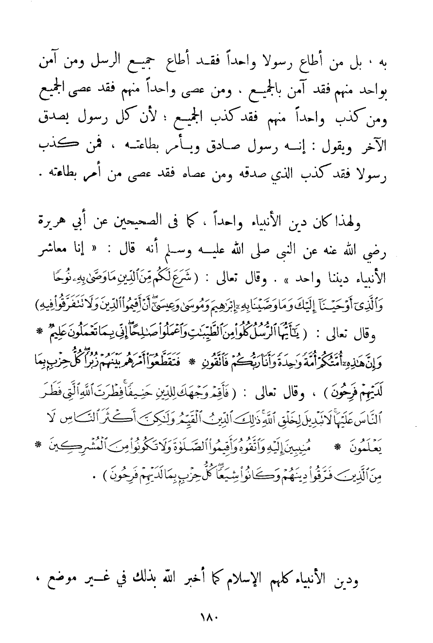 بِهِ بَلْ مَنْ أَطَاعَ رَسُولًا وَاحِدًا فَقَدْ أَطَاعَ جَمِيعَ الرُّسُلِ وَمَنْ آمَنَ بِوَاحِدٍ مِنْهُمْ فَقَدْ آمَنَ بِالْجَمِيعِ وَمَنْ عَصَى وَاحِدًا مِنْهُمْ فَقَدْ عَصَى الْجَمِيعَ وَمَنْ كَذَّبَ وَاحِدًا مِنْهُمْ فَقَدْ كَذَّبَ الْجَمِيعَ؛ لِأَنَّ كُلَّ رَسُولٍ يُصَدِّقُ الْآخَرَ وَيَقُولُ: إنَّهُ رَسُولٌ صَادِقٌ وَيَأْمُرُ بِطَاعَتِهِ فَمَنْ كَذَّبَ رَسُولًا فَقَدْ كَذَّبَ الَّذِي صَدَّقَهُ وَمَنْ عَصَاهُ فَقَدْ عَصَى مَنْ أَمَرَ بِطَاعَتِهِ. وَلِهَذَا كَانَ دِينُ الْأَنْبِيَاءِ وَاحِدًا كَمَا فِي الصَّحِيحَيْنِ عَنْ أَبِي هُرَيْرَةَ رَضِيَ اللَّهُ عَنْهُ عَنْ النَّبِيِّ صَلَّى اللَّهُ عَلَيْهِ وَسَلَّمَ أَنَّهُ قَالَ: {إنَّا مُعَاشِرُ الْأَنْبِيَاءِ دِينُنَا وَاحِدٌ} . وَقَالَ تَعَالَى: {شَرَعَ لَكُمْ مِنَ الدِّينِ مَا وَصَّى بِهِ نُوحًا وَالَّذِي أَوْحَيْنَا إلَيْكَ وَمَا وَصَّيْنَا بِهِ إبْرَاهِيمَ وَمُوسَى وَعِيسَى أَنْ أَقِيمُوا الدِّينَ وَلَا تَتَفَرَّقُوا فِيهِ} وَقَالَ تَعَالَى: {يَا أَيُّهَا الرُّسُلُ كُلُوا مِنَ الطَّيِّبَاتِ وَاعْمَلُوا صَالِحًا إنِّي بِمَا تَعْمَلُونَ عَلِيمٌ} {وَإِنَّ هَذِهِ أُمَّتُكُمْ أُمَّةً وَاحِدَةً وَأَنَا رَبُّكُمْ فَاتَّقُونِ} {فَتَقَطَّعُوا أَمْرَهُمْ بَيْنَهُمْ زُبُرًا كُلُّ حِزْبٍ بِمَا لَدَيْهِمْ فَرِحُونَ} وَقَالَ تَعَالَى: {فَأَقِمْ وَجْهَكَ لِلدِّينِ حَنِيفًا فِطْرَةَ اللَّهِ الَّتِي فَطَرَ النَّاسَ عَلَيْهَا لَا تَبْدِيلَ لِخَلْقِ اللَّهِ ذَلِكَ الدِّينُ الْقَيِّمُ وَلَكِنَّ أَكْثَرَ النَّاسِ لَا يَعْلَمُونَ} {مُنِيبِينَ إلَيْهِ وَاتَّقُوهُ وَأَقِيمُوا الصَّلَاةَ وَلَا تَكُونُوا مِنَ الْمُشْرِكِينَ} {مِنَ الَّذِينَ فَرَّقُوا دِينَهُمْ وَكَانُوا شِيَعًا كُلُّ حِزْبٍ بِمَا لَدَيْهِمْ فَرِحُونَ} . وَدِينُ الْأَنْبِيَاءِ كُلِّهِمْ الْإِسْلَامُ كَمَا أَخْبَرَ اللَّهُ بِذَلِكَ فِي غَيْرِ مَوْضِعٍ.