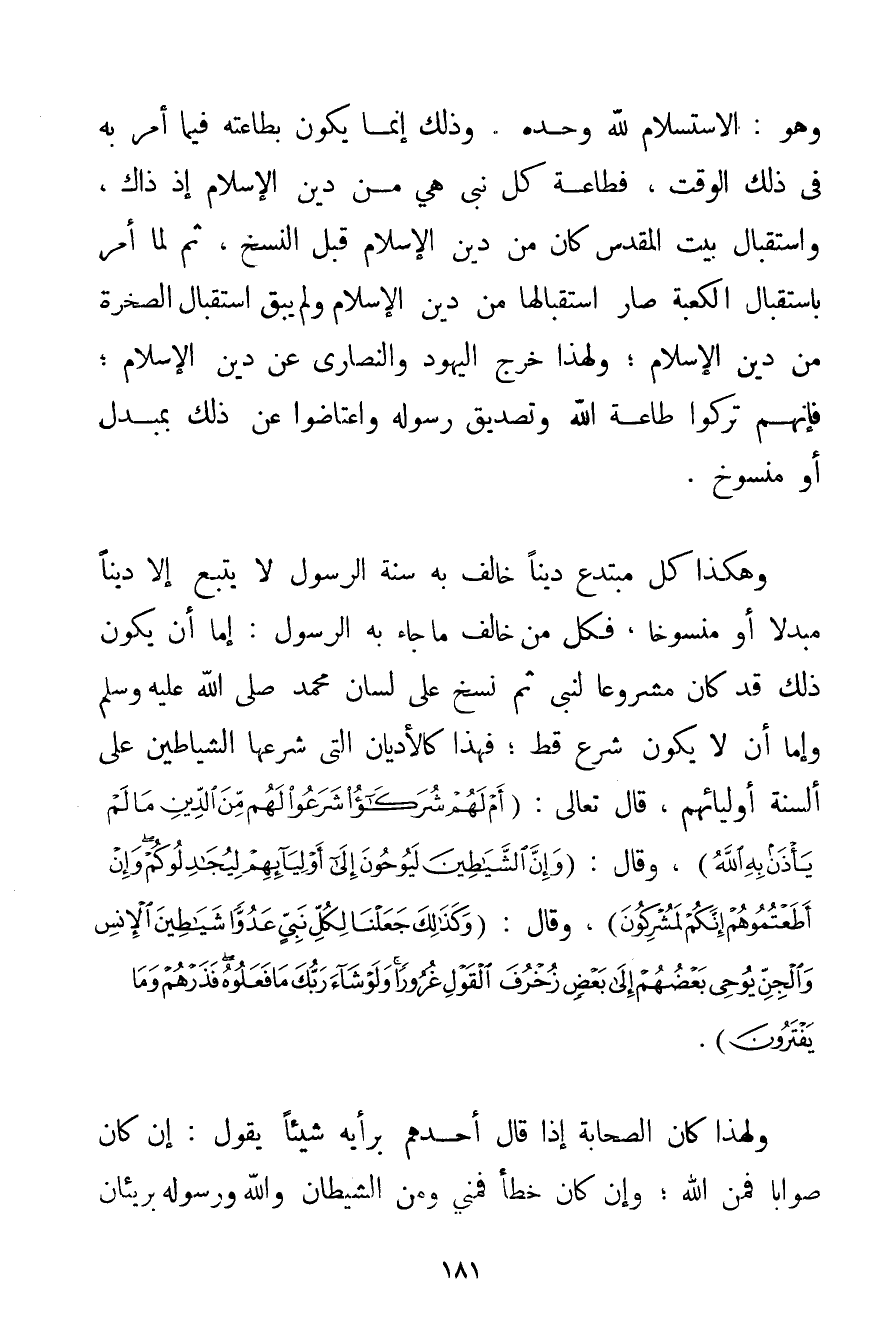 وَهُوَ: الِاسْتِسْلَامُ لِلَّهِ وَحْدَهُ. وَذَلِكَ إنَّمَا يَكُونُ بِطَاعَتِهِ فِيمَا أَمَرَ بِهِ فِي ذَلِكَ الْوَقْتِ فَطَاعَةُ كُلِّ نَبِيٍّ هِيَ مِنْ دِينِ الْإِسْلَامِ إذْ ذَاكَ وَاسْتِقْبَالُ بَيْتِ الْمَقْدِسِ كَانَ مِنْ دِينِ الْإِسْلَامِ قَبْلَ النَّسْخِ ثُمَّ لَمَّا أَمَرَ بِاسْتِقْبَالِ الْكَعْبَةِ صَارَ اسْتِقْبَالُهَا مِنْ دِينِ الْإِسْلَامِ وَلَمْ يَبْقَ اسْتِقْبَالُ الصَّخْرَةَ مِنْ دِينِ الْإِسْلَامِ؛ وَلِهَذَا خَرَجَ الْيَهُودُ وَالنَّصَارَى عَنْ دِينِ الْإِسْلَامِ؛ فَإِنَّهُمْ تَرَكُوا طَاعَةَ اللَّهِ وَتَصْدِيقَ رَسُولِهِ واعتاضوا عَنْ ذَلِكَ بِمُبَدَّلٍ أَوْ مَنْسُوخٍ. وَهَكَذَا كُلُّ مُبْتَدِعٍ دِينًا خَالَفَ بِهِ سُنَّةَ الرَّسُولِ لَا يَتَّبِعُ إلَّا دِينًا مُبَدَّلًا أَوْ مَنْسُوخًا فَكُلُّ مَنْ خَالَفَ مَا جَاءَ بِهِ الرَّسُولُ: إمَّا أَنْ يَكُونَ ذَلِكَ قَدْ كَانَ مَشْرُوعًا لِنَبِيٍّ ثُمَّ نُسِخَ عَلَى لِسَانِ مُحَمَّدٍ صَلَّى اللَّهُ عَلَيْهِ وَسَلَّمَ وَإِمَّا أَنْ لَا يَكُونَ شُرِعَ قَطُّ؛ فَهَذَا كَالْأَدْيَانِ الَّتِي شَرَعَهَا الشَّيَاطِينُ عَلَى أَلْسِنَةِ أَوْلِيَائِهِمْ قَالَ تَعَالَى: {أَمْ لَهُمْ شُرَكَاءُ شَرَعُوا لَهُمْ مِنَ الدِّينِ مَا لَمْ يَأْذَنْ بِهِ اللَّهُ} وَقَالَ:. {وَإِنَّ الشَّيَاطِينَ لَيُوحُونَ إلَى أَوْلِيَائِهِمْ لِيُجَادِلُوكُمْ وَإِنْ أَطَعْتُمُوهُمْ إنَّكُمْ لَمُشْرِكُونَ} وَقَالَ: {وَكَذَلِكَ جَعَلْنَا لِكُلِّ نَبِيٍّ عَدُوًّا شَيَاطِينَ الْإِنْسِ وَالْجِنِّ يُوحِي بَعْضُهُمْ إلَى بَعْضٍ زُخْرُفَ الْقَوْلِ غُرُورًا وَلَوْ شَاءَ رَبُّكَ مَا فَعَلُوهُ فَذَرْهُمْ وَمَا يَفْتَرُونَ} . وَلِهَذَا كَانَ الصَّحَابَةُ إذَا قَالَ أَحَدُهُمْ بِرَأْيِهِ شَيْئًا يَقُولُ: إنْ كَانَ صَوَابًا فَمِنْ اللَّهِ؛ وَإِنْ كَانَ خَطَأً فَمِنِّي وَمِنْ الشَّيْطَانِ وَاَللَّهُ وَرَسُولُهُ بَرِيئَانِ