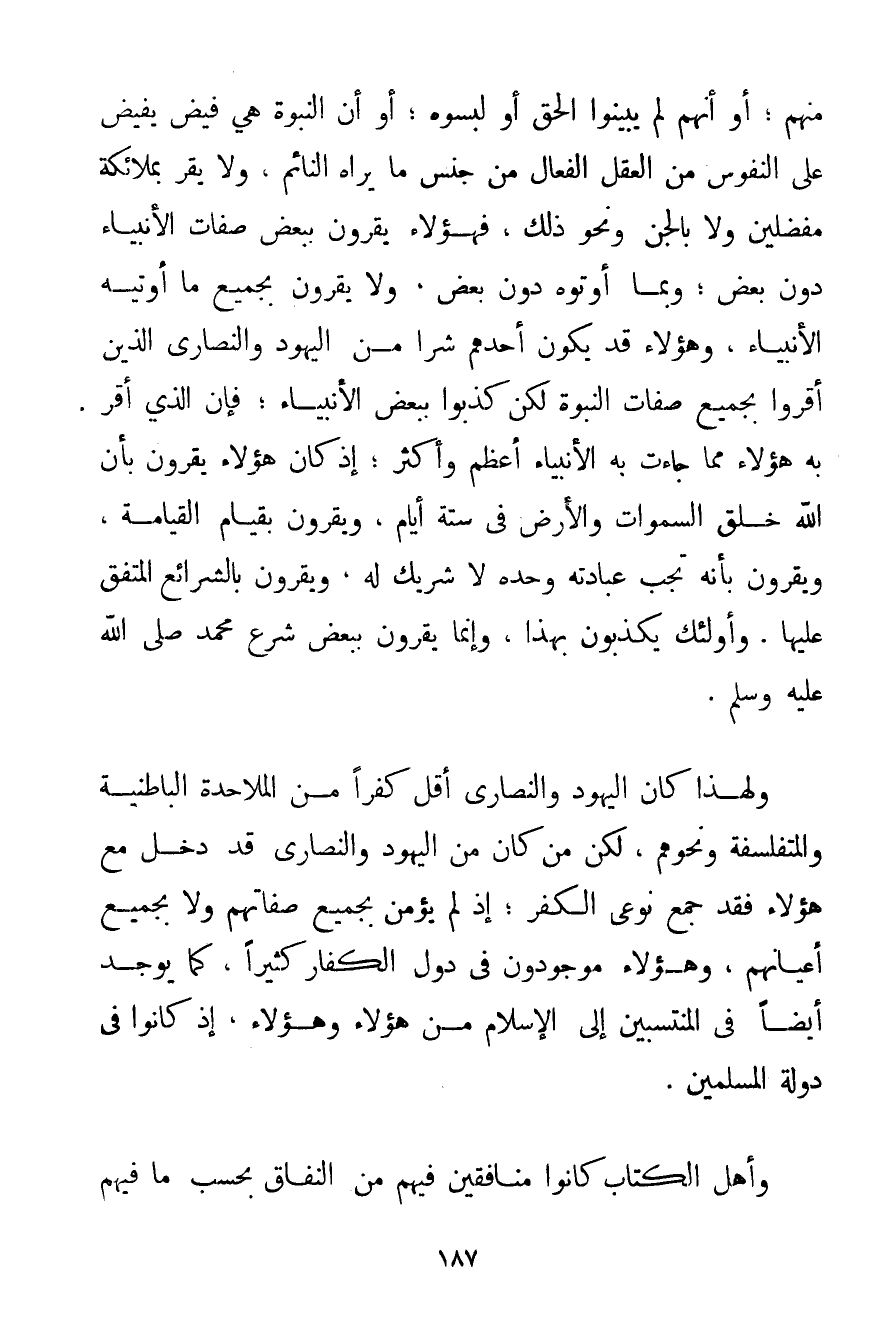 مِنْهُمْ؛ أَوْ أَنَّهُمْ لَمْ يُبَيِّنُوا الْحَقَّ أَوْ لَبَّسُوهُ؛ أَوْ إنَّ النُّبُوَّةَ هِيَ فَيْضٌ يَفِيضُ عَلَى النُّفُوسِ مِنْ الْعَقْلِ الْفَعَّالِ مِنْ جِنْسِ مَا يَرَاهُ النَّائِمُ وَلَا يُقِرُّ بِمَلَائِكَةٍ مُفَضَّلِينَ وَلَا بِالْجِنِّ وَنَحْوِ ذَلِكَ فَهَؤُلَاءِ يُقِرُّونَ بِبَعْضِ صِفَاتِ الْأَنْبِيَاءِ دُونَ بَعْضٍ؛ وَبِمَا أُوتُوهُ دُونَ بَعْضٍ وَلَا يُقِرُّونَ بِجَمِيعِ مَا أُوتِيَهُ الْأَنْبِيَاءُ وَهَؤُلَاءِ قَدْ يَكُونُ أَحَدُهُمْ شَرًّا مِنْ الْيَهُودِ وَالنَّصَارَى الَّذِينَ أَقَرُّوا بِجَمِيعِ صِفَاتِ النُّبُوَّةِ لَكِنْ كَذَّبُوا بِبَعْضِ الْأَنْبِيَاءِ؛ فَإِنَّ الَّذِي أَقَرَّ بِهِ هَؤُلَاءِ مِمَّا جَاءَتْ بِهِ الْأَنْبِيَاءُ أَعْظَمُ وَأَكْثَرُ؛ إذْ كَانَ هَؤُلَاءِ يُقِرُّونَ بِأَنَّ اللَّهَ خَلَقَ السَّمَوَاتِ وَالْأَرْضَ فِي سِتَّةِ أَيَّامٍ وَيُقِرُّونَ بِقِيَامِ الْقِيَامَةِ وَيُقِرُّونَ بِأَنَّهُ تَجِبُ عِبَادَتُهُ وَحْدَهُ لَا شَرِيكَ لَهُ وَيُقِرُّونَ بِالشَّرَائِعِ الْمُتَّفَقِ عَلَيْهَا. وَأُولَئِكَ يُكَذِّبُونَ بِهَذَا وَإِنَّمَا يُقِرُّونَ بِبَعْضِ شَرْعِ مُحَمَّدٍ صَلَّى اللَّهُ عَلَيْهِ وَسَلَّمَ. وَلِهَذَا كَانَ الْيَهُودُ وَالنَّصَارَى أَقَلَّ كُفْرًا مِنْ الْمَلَاحِدَةِ الْبَاطِنِيَّةِ والمتفلسفة وَنَحْوِهِمْ لَكِنْ مَنْ كَانَ مِنْ الْيَهُودِ وَالنَّصَارَى قَدْ دَخَلَ مَعَ هَؤُلَاءِ فَقَدْ جَمَعَ نَوْعَيْ الْكُفْرِ؛ إذْ لَمْ يُؤْمِنْ بِجَمِيعِ صِفَاتِهِمْ وَلَا بِجَمِيعِ أَعْيَانِهِمْ وَهَؤُلَاءِ مَوْجُودُونَ فِي دُوَلِ الْكُفَّارِ كَثِيرًا كَمَا يُوجَدُ أَيْضًا فِي الْمُنْتَسِبِينَ إلَى الْإِسْلَامِ مِنْ هَؤُلَاءِ وَهَؤُلَاءِ إذْ كَانُوا فِي دَوْلَةِ الْمُسْلِمِينَ. وَأَهْلُ الْكِتَابِ كَانُوا مُنَافِقِينَ فِيهِمْ مِنْ النِّفَاقِ بِحَسَبِ مَا فِيهِمْ