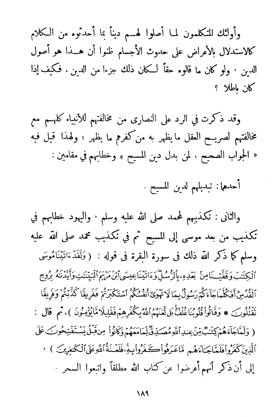 وَأُولَئِكَ الْمُتَكَلِّمُونَ لَمَّا أَصَّلُوا لَهُمْ دِينًا بِمَا أَحْدَثُوهُ مِنْ الْكَلَامِ كَالِاسْتِدْلَالِ بِالْأَعْرَاضِ عَلَى حُدُوثِ الْأَجْسَامِ ظَنُّوا أَنَّ هَذَا هُوَ أُصُولُ الدِّينِ وَلَوْ كَانَ مَا قَالُوهُ حَقًّا لَكَانَ ذَلِكَ جُزْءًا مِنْ الدِّينِ فَكَيْفَ إذَا كَانَ بَاطِلًا؟ وَقَدْ ذَكَرْت فِي الرَّدِّ عَلَى النَّصَارَى مِنْ مُخَالَفَتِهِمْ لِلْأَنْبِيَاءِ كُلِّهِمْ مَعَ مُخَالَفَتِهِمْ لِصَرِيحِ الْعَقْلِ مَا يَظْهَرُ بِهِ مِنْ كُفْرِهِمْ مَا يَظْهَرُ؛ وَلِهَذَا قِيلَ فِيهِ " الْجَوَابُ الصَّحِيحُ لِمَنْ بَدَّلَ دِينَ الْمَسِيحِ " وَخِطَابُهُمْ فِي مَقَامَيْنِ: أَحَدُهُمَا: تَبْدِيلُهُمْ لِدِينِ الْمَسِيحِ. وَالثَّانِي: تَكْذِيبُهُمْ لِمُحَمَّدِ صَلَّى اللَّهُ عَلَيْهِ وَسَلَّمَ وَالْيَهُودُ خِطَابُهُمْ فِي تَكْذِيبِ مَنْ بَعْدَ مُوسَى إلَى الْمَسِيحِ ثُمَّ فِي تَكْذِيبِ مُحَمَّدٍ صَلَّى اللَّهُ عَلَيْهِ وَسَلَّمَ كَمَا ذَكَرَ اللَّهُ ذَلِكَ فِي سُورَةِ الْبَقَرَةِ فِي قَوْلِهِ: {وَلَقَدْ آتَيْنَا مُوسَى الْكِتَابَ وَقَفَّيْنَا مِنْ بَعْدِهِ بِالرُّسُلِ وَآتَيْنَا عِيسَى ابْنَ مَرْيَمَ الْبَيِّنَاتِ وَأَيَّدْنَاهُ بِرُوحِ الْقُدُسِ أَفَكُلَّمَا جَاءَكُمْ رَسُولٌ بِمَا لَا تَهْوَى أَنْفُسُكُمُ اسْتَكْبَرْتُمْ فَفَرِيقًا كَذَّبْتُمْ وَفَرِيقًا تَقْتُلُونَ} {وَقَالُوا قُلُوبُنَا غُلْفٌ بَلْ لَعَنَهُمُ اللَّهُ بِكُفْرِهِمْ فَقَلِيلًا مَا يُؤْمِنُونَ} ثُمَّ قَالَ: {وَلَمَّا جَاءَهُمْ كِتَابٌ مِنْ عِنْدِ اللَّهِ مُصَدِّقٌ لِمَا مَعَهُمْ وَكَانُوا مِنْ قَبْلُ يَسْتَفْتِحُونَ عَلَى الَّذِينَ كَفَرُوا فَلَمَّا جَاءَهُمْ مَا عَرَفُوا كَفَرُوا بِهِ فَلَعْنَةُ اللَّهِ عَلَى الْكَافِرِينَ} إلَى أَنْ ذَكَرَ أَنَّهُمْ أَعْرَضُوا