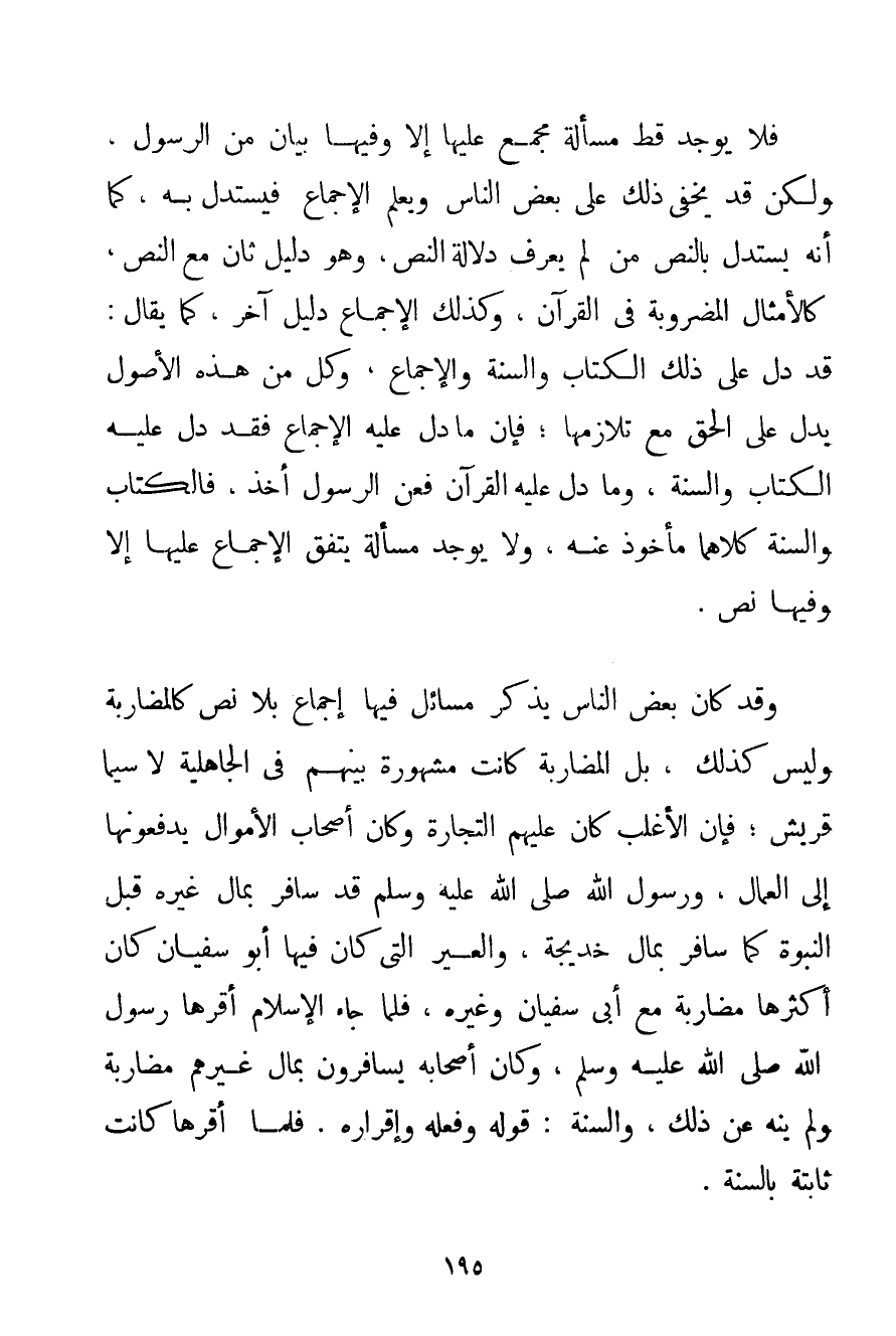 فَلَا يُوجَدُ قَطُّ مَسْأَلَةٌ مُجْمَعٌ عَلَيْهَا إلَّا وَفِيهَا بَيَانٌ مِنْ الرَّسُولِ وَلَكِنْ قَدْ يَخْفَى ذَلِكَ عَلَى بَعْضِ النَّاسِ وَيَعْلَمُ الْإِجْمَاعَ. فَيَسْتَدِلُّ بِهِ كَمَا أَنَّهُ يَسْتَدِلُّ بِالنَّصِّ مَنْ لَمْ يَعْرِفْ دَلَالَةَ النَّصِّ وَهُوَ دَلِيلٌ ثَانٍ مَعَ النَّصِّ كَالْأَمْثَالِ الْمَضْرُوبَةِ فِي الْقُرْآنِ وَكَذَلِكَ الْإِجْمَاعُ دَلِيلٌ آخَرُ كَمَا يُقَالُ: قَدْ دَلَّ عَلَى ذَلِكَ الْكِتَابُ وَالسُّنَّةُ وَالْإِجْمَاعُ وَكُلٍّ مِنْ هَذِهِ الْأُصُولِ يَدُلُّ عَلَى الْحَقِّ مَعَ تَلَازُمِهَا؛ فَإِنَّ مَا دَلَّ عَلَيْهِ الْإِجْمَاعُ فَقَدْ دَلَّ عَلَيْهِ الْكِتَابُ وَالسُّنَّةُ وَمَا دَلَّ عَلَيْهِ الْقُرْآنُ فَعَنْ الرَّسُولِ أُخِذَ فَالْكِتَابُ وَالسُّنَّةُ كِلَاهُمَا مَأْخُوذٌ عَنْهُ وَلَا يُوجَدُ مَسْأَلَةٌ يَتَّفِقُ الْإِجْمَاعُ عَلَيْهَا إلَّا وَفِيهَا نَصٌّ. وَقَدْ كَانَ بَعْضُ النَّاسُ يَذْكُرُ مَسَائِلَ فِيهَا إجْمَاعٌ بِلَا نَصٍّ كَالْمُضَارَبَةِ وَلَيْسَ كَذَلِكَ بَلْ الْمُضَارَبَةُ كَانَتْ مَشْهُورَةً بَيْنَهُمْ فِي الْجَاهِلِيَّةِ لَا سِيَّمَا قُرَيْشٌ؛ فَإِنَّ الْأَغْلَبَ كَانَ عَلَيْهِمْ التِّجَارَةُ وَكَانَ أَصْحَابُ الْأَمْوَالِ يَدْفَعُونَهَا إلَى الْعُمَّالِ وَرَسُولُ اللَّهِ صَلَّى اللَّهُ عَلَيْهِ وَسَلَّمَ قَدْ سَافَرَ بِمَالِ غَيْرِهِ قَبْلَ النُّبُوَّةِ كَمَا سَافَرَ بِمَالِ خَدِيجَةَ وَالْعِيرُ الَّتِي كَانَ فِيهَا أَبُو سُفْيَانَ كَانَ أَكْثَرُهَا مُضَارَبَةً مَعَ أَبِي سُفْيَانَ وَغَيْرِهِ فَلَمَّا جَاءَ الْإِسْلَامُ أَقَرَّهَا رَسُولُ اللَّهِ صَلَّى اللَّهُ عَلَيْهِ وَسَلَّمَ وَكَانَ أَصْحَابُهُ يُسَافِرُونَ بِمَالِ غَيْرِهِمْ مُضَارَبَةً وَلَمْ يَنْهَ عَنْ ذَلِكَ وَالسُّنَّةُ: قَوْلُهُ وَفِعْلُهُ وَإِقْرَارُهُ. فَلَمَّا أَقَرَّهَا كَانَتْ ثَابِتَةً بِالسُّنَّةِ.