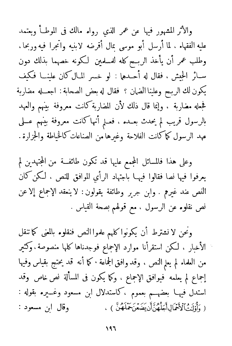 وَالْأَثَرُ الْمَشْهُورُ فِيهَا عَنْ عُمَرَ الَّذِي رَوَاهُ مَالِكٌ فِي الْمُوَطَّأِ وَيَعْتَمِدُ عَلَيْهِ الْفُقَهَاءُ لَمَّا أَرْسَلَ أَبُو مُوسَى بِمَالٍ أَقْرَضَهُ لِابْنَيْهِ وَاتَّجَرَا فِيهِ وَرَبِحَا وَطَلَبَ عُمَرُ أَنْ يَأْخُذَ الرِّبْحَ كُلَّهُ لِلْمُسْلِمِينَ لِكَوْنِهِ خَصَّهُمَا بِذَلِكَ دُونَ سَائِرِ الْجَيْشِ فَقَالَ لَهُ أَحَدُهُمَا: لَوْ خَسِرَ الْمَالَ كَانَ عَلَيْنَا فَكَيْفَ يَكُونُ لَك الرِّبْحُ وَعَلَيْنَا الضَّمَانُ؟ فَقَالَ لَهُ بَعْضُ الصَّحَابَةِ: اجْعَلْهُ مُضَارِبًا فَجَعَلَهُ مُضَارَبَةً وَإِنَّمَا قَالَ ذَلِكَ لِأَنَّ الْمُضَارَبَةَ كَانَتْ مَعْرُوفَةً بَيْنَهُمْ وَالْعَهْدَ بِالرَّسُولِ قَرِيبٌ لَمْ يَحْدُثْ بَعْدَهُ فَعَلِمَ أَنَّهَا كَانَتْ مَعْرُوفَةً بَيْنَهُمْ عَلَى عَهْدِ الرَّسُولِ كَمَا كَانَتْ الْفِلَاحَةُ وَغَيْرُهَا مِنْ الصِّنَاعَاتِ كَالْخِيَاطَةِ وَالْجِزَارَةِ. وَعَلَى هَذَا فَالْمَسَائِلُ الْمُجْمَعُ عَلَيْهَا قَدْ تَكُونُ طَائِفَةٌ مِنْ الْمُجْتَهِدِينَ لَمْ يَعْرِفُوا فِيهَا نَصًّا فَقَالُوا فِيهَا بِاجْتِهَادِ الرَّأْيِ الْمُوَافِقِ لِلنَّصِّ لَكِنْ كَانَ النَّصُّ عِنْدَ غَيْرِهِمْ. وَابْنُ جَرِيرٍ وَطَائِفَةٌ يَقُولُونَ: لَا يَنْعَقِدُ الْإِجْمَاعُ إلَّا عَنْ نَصٍّ نَقَلُوهُ عَنْ الرَّسُولِ مَعَ قَوْلِهِمْ بِصِحَّةِ الْقِيَاسِ. وَنَحْنُ لَا نَشْتَرِطُ أَنْ يَكُونُوا كُلُّهُمْ عَلِمُوا النَّصَّ فَنَقَلُوهُ بِالْمَعْنَى كَمَا تُنْقَلُ الْأَخْبَارُ لَكِنْ اسْتَقْرَأْنَا مَوَارِدَ الْإِجْمَاعِ فَوَجَدْنَاهَا كُلَّهَا مَنْصُوصَةً وَكَثِيرٌ مِنْ الْعُلَمَاءِ لَمْ يَعْلَمْ النَّصَّ وَقَدْ وَافَقَ الْجَمَاعَةُ كَمَا أَنَّهُ قَدْ يَحْتَجُّ بِقِيَاسٍ وَفِيهَا إجْمَاعٌ لَمْ يَعْلَمْهُ فَيُوَافِقُ الْإِجْمَاعَ وَكَمَا يَكُونُ فِي الْمَسْأَلَةِ نَصٌّ خَاصٌّ وَقَدْ اسْتَدَلَّ فِيهَا بَعْضُهُمْ بِعُمُومِ كَاسْتِدْلَالِ ابْنِ مَسْعُودٍ وَغَيْرِهِ بِقَوْلِهِ: {وَأُولَاتُ الْأَحْمَالِ أَجَلُهُنَّ أَنْ يَضَعْنَ حَمْلَهُنَّ} وَقَالَ ابْنُ مَسْعُودٍ: