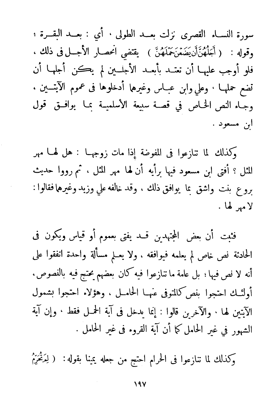 سُورَةُ النِّسَاءِ الْقُصْرَى نَزَلَتْ بَعْد الطُّولَى أَيْ: بَعْدَ الْبَقَرَةِ؛ وَقَوْلُهُ: {أَجَلُهُنَّ أَنْ يَضَعْنَ حَمْلَهُنَّ} يَقْتَضِي انْحِصَارَ الْأَجَلِ فِي ذَلِكَ فَلَوْ أَوْجَبَ عَلَيْهَا أَنْ تَعُدَّ بِأَبْعَدَ الْأَجَلَيْنِ لَمْ يَكُنْ أَجْلُهَا أَنْ تَضَعَ حَمْلَهَا وَعَلِيٌّ وَابْنُ عَبَّاسٍ وَغَيْرُهُمَا أَدْخَلُوهَا فِي عُمُومِ الْآيَتَيْنِ وَجَاءَ النَّصُّ الْخَاصُّ فِي قِصَّةِ سبيعة الأسلمية بِمَا يُوَافِقُ قَوْلَ ابْنِ مَسْعُودٍ. وَكَذَلِكَ لَمَّا تَنَازَعُوا فِي الْمُفَوَّضَةِ إذَا مَاتَ زَوْجُهَا: هَلْ لَهَا مَهْرُ الْمِثْلِ؟ أَفْتَى ابْنُ مَسْعُودٍ فِيهَا بِرَأْيِهِ أَنَّ لَهَا مَهْرَ الْمِثْلِ ثُمَّ رَوَوْا حَدِيثَ بروع بِنْتِ وَاشِقٍ بِمَا يُوَافِقُ ذَلِكَ وَقَدْ خَالَفَهُ عَلِيٌّ وَزَيْدٌ وَغَيْرُهُمَا فَقَالُوا: لَا مَهْرَ لَهَا. فَثَبَتَ أَنَّ بَعْضَ الْمُجْتَهِدِينَ قَدْ يُفْتِي بِعُمُومٍ أَوْ قِيَاسٍ وَيَكُونُ فِي الْحَادِثَةِ نَصٌّ خَاصٌّ لَمْ يَعْلَمْهُ فَيُوَافِقُهُ وَلَا يَعْلَمُ مَسْأَلَةً وَاحِدَةً اتَّفَقُوا عَلَى إنَّهُ لَا نَصَّ فِيهَا؛ بَلْ عَامَّةُ مَا تَنَازَعُوا فِيهِ كَانَ بَعْضُهُمْ يَحْتَجُّ فِيهِ بِالنُّصُوصِ أُولَئِكَ احْتَجُّوا بِنَصٍّ كَالْمُتَوَفَّى عَنْهَا الْحَامِلُ وَهَؤُلَاءِ احْتَجُّوا بِشُمُولِ الْآيَتَيْنِ لَهَا وَالْآخَرِينَ قَالُوا: إنَّمَا يَدْخُلُ فِي آيَةِ الْحَمْلِ فَقَطْ وَأَنَّ آيَةَ الشُّهُورِ فِي غَيْرِ الْحَامِلِ كَمَا أَنَّ آيَةَ الْقُرُوءِ فِي غَيْرِ الْحَامِلِ. وَكَذَلِكَ لَمَّا تَنَازَعُوا فِي الْحَرَامِ احْتَجَّ مَنْ جَعَلَهُ يَمِينًا بِقَوْلِهِ: {لِمَ تُحَرِّمُ