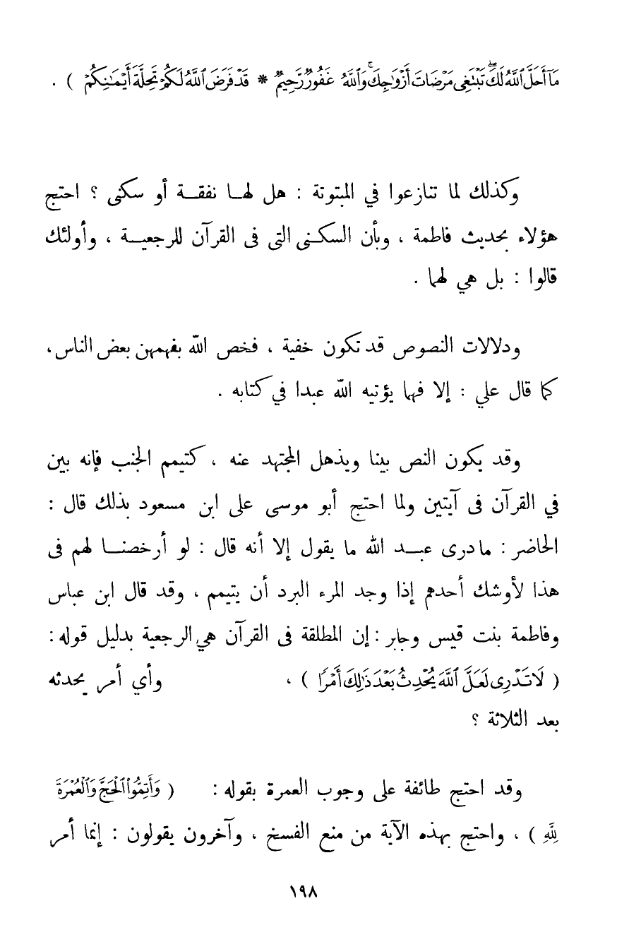 مَا أَحَلَّ اللَّهُ لَكَ تَبْتَغِي مَرْضَاةَ أَزْوَاجِكَ وَاللَّهُ غَفُورٌ رَحِيمٌ} {قَدْ فَرَضَ اللَّهُ لَكُمْ تَحِلَّةَ أَيْمَانِكُمْ} . وَكَذَلِكَ لَمَّا تَنَازَعُوا فِي الْمَبْتُوتَةِ: هَلْ لَهَا نَفَقَةٌ أَوْ سُكْنَى؟ احْتَجَّ هَؤُلَاءِ بِحَدِيثِ فَاطِمَةَ وَبِأَنَّ السُّكْنَى الَّتِي فِي الْقُرْآنِ لِلرَّجْعِيَّةِ وَأُولَئِكَ قَالُوا: بَلْ هِيَ لَهُمَا. وَدَلَالَاتُ النُّصُوصِ قَدْ تَكُونُ خَفِيَّةً فَخَصَّ اللَّهُ بِفَهْمِهِنَّ بَعْضَ النَّاسِ كَمَا قَالَ عَلِيٌّ: إلَّا فَهْمًا يُؤْتِيه اللَّهُ عَبْدًا فِي كِتَابِهِ. وَقَدْ يَكُونُ النَّصُّ بَيِّنًا وَيُذْهِلُ الْمُجْتَهِدُ عَنْهُ كَتَيَمُّمِ الْجُنُبِ فَإِنَّهُ بَيَّنَ فِي الْقُرْآنِ فِي آيَتَيْنِ وَلَمَّا احْتَجَّ أَبُو مُوسَى عَلَى ابْنِ مَسْعُودٍ بِذَلِكَ قَالَ: الْحَاضِرُ: مَا دَرَى عَبْدُ اللَّهِ مَا يَقُولُ إلَّا أَنَّهُ قَالَ: لَوْ أَرْخَصَنَا لَهُمْ فِي هَذَا لَأَوْشَكَ أَحَدُهُمْ إذَا وَجَدَ الْمَرْءُ الْبَرْدَ أَنْ يَتَيَمَّمَ وَقَدْ قَالَ ابْنُ عَبَّاسٍ وَفَاطِمَةُ بِنْتُ قَيْسٍ وَجَابِرٌ: إنَّ الْمُطَلَّقَةَ فِي الْقُرْآنِ هِيَ الرَّجْعِيَّةُ بِدَلِيلِ قَوْلِهِ: {لَا تَدْرِي لَعَلَّ اللَّهَ يُحْدِثُ بَعْدَ ذَلِكَ أَمْرًا} وَأَيُّ أَمْرٍ يُحْدِثُهُ بَعْدَ الثَّلَاثَةِ؟ وَقَدْ احْتَجَّ طَائِفَةٌ عَلَى وُجُوبِ الْعُمْرَةِ بِقَوْلِهِ: {وَأَتِمُّوا الْحَجَّ وَالْعُمْرَةَ لِلَّهِ} وَاحْتَجَّ بِهَذِهِ الْآيَةِ مِنْ مَنْعِ الْفَسْخِ وَآخَرُونَ يَقُولُونَ: إنَّمَا أُمِرَ