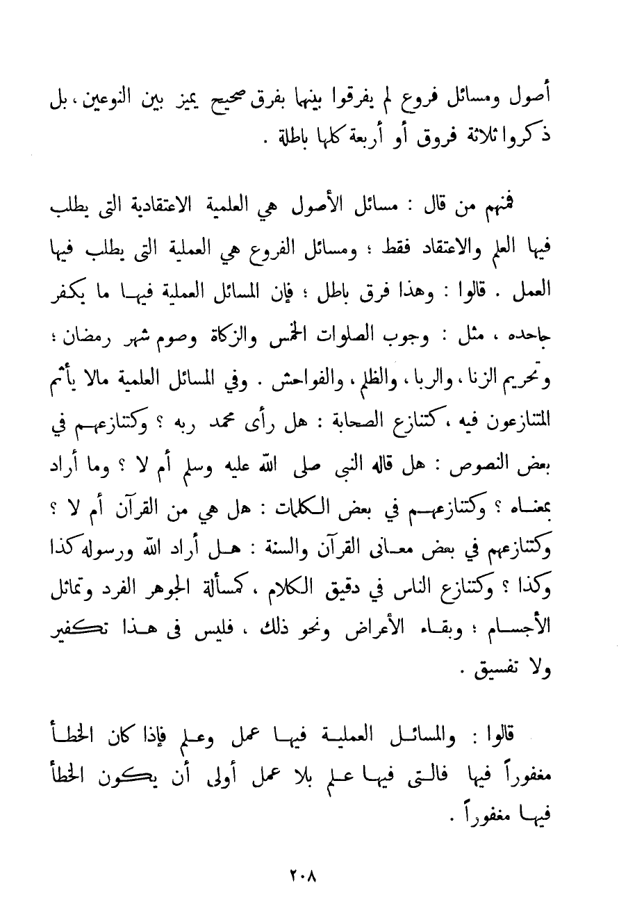 أُصُولٍ وَمَسَائِلَ فُرُوعٍ لَمْ يُفَرِّقُوا بَيْنَهُمَا بِفَرْقٍ صَحِيحٍ يُمَيِّزُ بَيْنَ النَّوْعَيْنِ بَلْ ذَكَرُوا ثَلَاثَةَ فُرُوقٍ أَوْ أَرْبَعَةً كُلُّهَا بَاطِلَةٌ. فَمِنْهُمْ مَنْ قَالَ: مَسَائِلُ الْأُصُولِ هِيَ الْعِلْمِيَّةُ الِاعْتِقَادِيَّةُ الَّتِي يُطْلَبُ فِيهَا الْعِلْمُ وَالِاعْتِقَادُ فَقَطْ؛ وَمَسَائِلُ الْفُرُوعِ هِيَ الْعَمَلِيَّةُ الَّتِي يُطْلَبُ فِيهَا الْعَمَلُ. قَالُوا: وَهَذَا فَرْقٌ بَاطِلٌ؛ فَإِنَّ الْمَسَائِلَ الْعَمَلِيَّةَ فِيهَا مَا يُكَفِّرُ جَاحِدَهُ مِثْلَ: وُجُوبِ الصَّلَوَاتِ الْخَمْسِ وَالزَّكَاةِ وَصَوْمِ شَهْرِ رَمَضَانَ؛ وَتَحْرِيمِ الزِّنَا وَالرِّبَا وَالظُّلْمِ وَالْفَوَاحِشِ. وَفِي الْمَسَائِلِ الْعِلْمِيَّةِ مَا لَا يَأْثَمُ الْمُتَنَازِعُونَ فِيهِ كَتَنَازُعِ الصَّحَابَةِ: هَلْ رَأَى مُحَمَّدٌ رَبَّهُ؟ وَكَتَنَازُعِهِمْ فِي بَعْضِ النُّصُوصِ: هَلْ قَالَهُ النَّبِيُّ صَلَّى اللَّهُ عَلَيْهِ وَسَلَّمَ أَمْ لَا؟ وَمَا أَرَادَ بِمَعْنَاهُ؟ وَكَتَنَازُعِهِمْ فِي بَعْضِ الْكَلِمَاتِ: هَلْ هِيَ مِنْ الْقُرْآنِ أَمْ لَا؟ وَكَتَنَازُعِهِمْ فِي بَعْضِ مَعَانِي الْقُرْآنِ وَالسُّنَّةِ: هَلْ أَرَادَ اللَّهُ وَرَسُولُهُ كَذَا وَكَذَا؟ وَكَتَنَازُعِ النَّاسِ فِي دَقِيقِ الْكَلَامِ كَمَسْأَلَةِ الْجَوْهَرِ الْفَرْدِ وَتَمَاثُلِ الْأَجْسَامِ؛ وَبَقَاءِ الْأَعْرَاضِ وَنَحْوِ ذَلِكَ فَلَيْسَ فِي هَذَا تَكْفِيرٌ وَلَا تَفْسِيقٌ. قَالُوا: وَالْمَسَائِلُ الْعَمَلِيَّةُ فِيهَا عَمَلٌ وَعِلْمٌ فَإِذَا كَانَ الْخَطَأُ مَغْفُورًا فِيهَا فَاَلَّتِي فِيهَا عِلْمٌ بِلَا عَمَلٍ أَوْلَى أَنْ يَكُونَ الْخَطَأُ فِيهَا مَغْفُورًا.