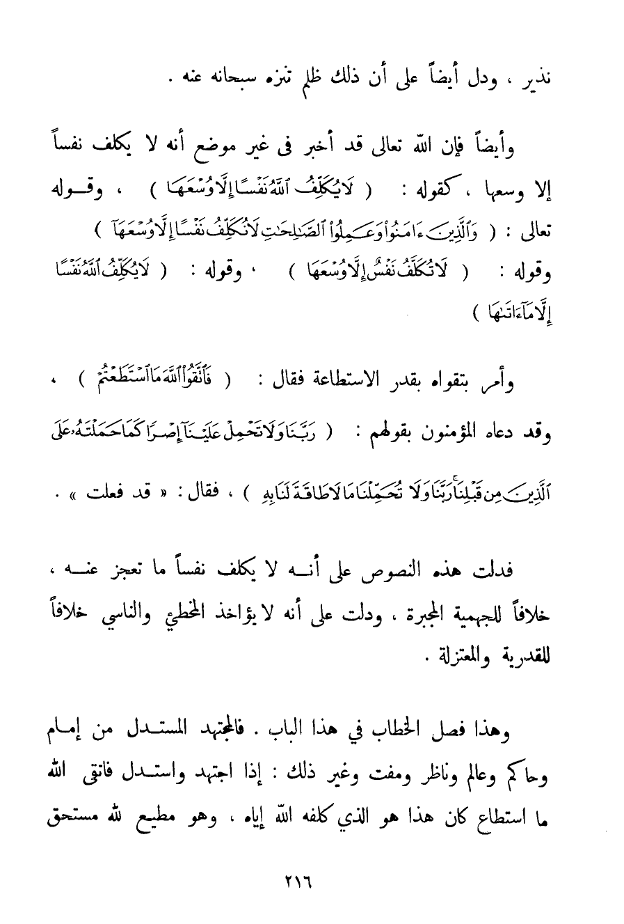 نَذِيرٌ وَدَلَّ أَيْضًا عَلَى أَنَّ ذَلِكَ ظُلْمٌ تَنَزَّهَ سُبْحَانَهُ عَنْهُ. وَأَيْضًا فَإِنَّ اللَّهَ تَعَالَى قَدْ أَخْبَرَ فِي غَيْرِ مَوْضِعٍ أَنَّهُ لَا يُكَلِّفُ نَفْسًا إلَّا وُسْعَهَا كَقَوْلِهِ: {لَا يُكَلِّفُ اللَّهُ نَفْسًا إلَّا وُسْعَهَا} وقَوْله تَعَالَى {وَالَّذِينَ آمَنُوا وَعَمِلُوا الصَّالِحَاتِ لَا نُكَلِّفُ نَفْسًا إلَّا وُسْعَهَا} وَقَوْلِهِ: {لَا تُكَلَّفُ نَفْسٌ إلَّا وُسْعَهَا} وَقَوْلِهِ: {لَا يُكَلِّفُ اللَّهُ نَفْسًا إلَّا مَا آتَاهَا} وَأَمَرَ بِتَقْوَاهُ بِقَدْرِ الِاسْتِطَاعَةِ فَقَالَ: {فَاتَّقُوا اللَّهَ مَا اسْتَطَعْتُمْ} وَقَدْ دَعَاهُ الْمُؤْمِنُونَ بِقَوْلِهِمْ: {رَبَّنَا وَلَا تَحْمِلْ عَلَيْنَا إصْرًا كَمَا حَمَلْتَهُ عَلَى الَّذِينَ مِنْ قَبْلِنَا رَبَّنَا وَلَا تُحَمِّلْنَا مَا لَا طَاقَةَ لَنَا بِهِ} فَقَالَ: " قَدْ فَعَلْت ". فَدَلَّتْ هَذِهِ النُّصُوصُ عَلَى أَنَّهُ لَا يُكَلِّفُ نَفْسًا مَا تَعْجِزُ عَنْهُ خِلَافًا للجهمية الْمُجْبِرَةِ وَدَلَّتْ عَلَى أَنَّهُ لَا يُؤَاخِذُ الْمُخْطِئَ وَالنَّاسِيَ خِلَافًا لِلْقَدَرِيَّةِ وَالْمُعْتَزِلَةِ. وَهَذَا فَصْلُ الْخِطَابِ فِي هَذَا الْبَابِ. فَالْمُجْتَهِدُ الْمُسْتَدِلُّ مِنْ إمَامٍ وَحَاكِمٍ وَعَالِمٍ وَنَاظِرٍ وَمُفْتٍ وَغَيْرِ ذَلِكَ: إذَا اجْتَهَدَ وَاسْتَدَلَّ فَاتَّقَى اللَّهَ مَا اسْتَطَاعَ كَانَ هَذَا هُوَ الَّذِي كَلَّفَهُ اللَّهُ إيَّاهُ وَهُوَ مُطِيعٌ لِلَّهِ مُسْتَحِقٌّ