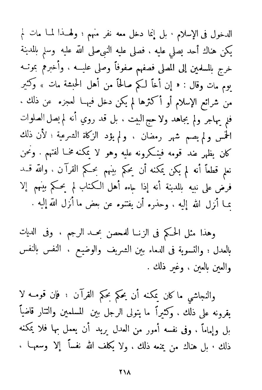 الدُّخُولِ فِي الْإِسْلَامِ بَلْ إنَّمَا دَخَلَ مَعَهُ نَفَرٌ مِنْهُمْ؛ وَلِهَذَا {لَمَّا مَاتَ لَمْ يَكُنْ هُنَاكَ أَحَدٌ يُصَلِّي عَلَيْهِ فَصَلَّى عَلَيْهِ النَّبِيُّ صَلَّى اللَّهُ عَلَيْهِ وَسَلَّمَ بِالْمَدِينَةِ خَرَجَ بِالْمُسْلِمِينَ إلَى الْمُصَلَّى فَصَفَّهُمْ صُفُوفًا وَصَلَّى عَلَيْهِ وَأَخْبَرَهُمْ بِمَوْتِهِ يَوْمَ مَاتَ وَقَالَ: إنَّ أَخًا لَكُمْ صَالِحًا مِنْ أَهْلِ الْحَبَشَةِ مَاتَ} وَكَثِيرٌ مِنْ شَرَائِعِ الْإِسْلَامِ أَوْ أَكْثَرِهَا لَمْ يَكُنْ دَخَلَ فِيهَا لِعَجْزِهِ عَنْ ذَلِكَ فَلَمْ يُهَاجِرْ وَلَمْ يُجَاهِدْ وَلَا حَجَّ الْبَيْتَ بَلْ قَدْ رُوِيَ أَنَّهُ لَمْ يُصَلِّ الصَّلَوَاتِ الْخَمْسَ وَلَا يَصُومُ شَهْرَ رَمَضَانَ وَلَا يُؤَدِّ الزَّكَاةَ الشَّرْعِيَّةَ؛ لِأَنَّ ذَلِكَ كَانَ يَظْهَرُ عِنْدَ قَوْمِهِ فَيُنْكِرُونَهُ عَلَيْهِ وَهُوَ لَا يُمْكِنُهُ مُخَالَفَتَهُمْ. وَنَحْنُ نَعْلَمُ قَطْعًا أَنَّهُ لَمْ يَكُنْ يُمْكِنْهُ أَنْ يَحْكُمَ بَيْنَهُمْ بِحُكْمِ الْقُرْآنِ وَاَللَّهُ قَدْ فَرَضَ عَلَى نَبِيِّهِ بِالْمَدِينَةِ أَنَّهُ إذَا جَاءَهُ أَهْلُ الْكِتَابِ لَمْ يَحْكُمْ بَيْنَهُمْ إلَّا بِمَا أَنْزَلَ اللَّهُ إلَيْهِ وَحَذَّرَهُ أَنْ يَفْتِنُوهُ عَنْ بَعْضِ مَا أَنْزَلَ اللَّهُ إلَيْهِ. وَهَذَا مِثْلُ الْحُكْمِ فِي الزِّنَا لِلْمُحْصَنِ بِحَدِّ الرَّجْمِ وَفِي الدِّيَاتِ بِالْعَدْلِ؛ وَالتَّسْوِيَةِ فِي الدِّمَاءِ بَيْنَ الشَّرِيفِ وَالْوَضِيعِ النَّفْسِ بِالنَّفْسِ وَالْعَيْنِ بِالْعَيْنِ وَغَيْرِ ذَلِكَ. وَالنَّجَاشِيُّ مَا كَانَ يُمْكِنُهُ أَنْ يَحْكُمَ بِحُكْمِ الْقُرْآنِ؛ فَإِنَّ قَوْمَهُ لَا يُقِرُّونَهُ عَلَى ذَلِكَ وَكَثِيرًا مَا يَتَوَلَّى الرَّجُلُ بَيْنَ الْمُسْلِمِينَ وَالتَّتَارِ قَاضِيًا بَلْ وَإِمَامًا وَفِي نَفْسِهِ أُمُورٌ مِنْ الْعَدْلِ يُرِيدُ أَنْ يَعْمَلَ بِهَا فَلَا يُمْكِنُهُ ذَلِكَ بَلْ هُنَاكَ مَنْ يَمْنَعُهُ ذَلِكَ وَلَا يُكَلِّفُ اللَّهُ نَفْسًا إلَّا وُسْعَهَا