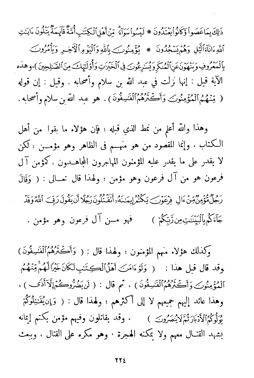 {لَيْسُوا سَوَاءً مِنْ أَهْلِ الْكِتَابِ أُمَّةٌ قَائِمَةٌ يَتْلُونَ آيَاتِ اللَّهِ آنَاءَ اللَّيْلِ وَهُمْ يَسْجُدُونَ} {يُؤْمِنُونَ بِاللَّهِ وَالْيَوْمِ الْآخِرِ وَيَأْمُرُونَ بِالْمَعْرُوفِ وَيَنْهَوْنَ عَنِ الْمُنْكَرِ وَيُسَارِعُونَ فِي الْخَيْرَاتِ وَأُولَئِكَ مِنَ الصَّالِحِينَ} وَهَذِهِ الْآيَةُ قِيلَ: إنَّهَا نَزَلَتْ فِي عَبْدِ اللَّهِ بْنِ سَلَامٍ وَأَصْحَابِهِ. وَقِيلَ: إنَّ قَوْلَهُ {مِنْهُمُ الْمُؤْمِنُونَ وَأَكْثَرُهُمُ الْفَاسِقُونَ} . هُوَ عَبْدُ اللَّهِ بْنُ سَلَامٍ وَأَصْحَابُهُ. وَهَذَا وَاَللَّهُ أَعْلَمُ مِنْ نَمَطِ الَّذِي قَبْلَهُ؛ فَإِنَّ هَؤُلَاءِ مَا بَقُوا مِنْ أَهْلِ الْكِتَابِ وَإِنَّمَا الْمَقْصُودُ مَنْ هُوَ مِنْهُمْ فِي الظَّاهِرِ وَهُوَ مُؤْمِنٌ؛ لَكِنْ لَا يَقْدِرُ عَلَى مَا يَقْدِرُ عَلَيْهِ الْمُؤْمِنُونَ الْمُهَاجِرُونَ الْمُجَاهِدُونَ كَمُؤْمِنِ آلِ فِرْعَوْنَ هُوَ مِنْ آلِ فِرْعَوْنَ وَهُوَ مُؤْمِنٌ؛ وَلِهَذَا قَالَ تَعَالَى: {وَقَالَ رَجُلٌ مُؤْمِنٌ مِنْ آلِ فِرْعَوْنَ يَكْتُمُ إيمَانَهُ أَتَقْتُلُونَ رَجُلًا أَنْ يَقُولَ رَبِّيَ اللَّهُ وَقَدْ جَاءَكُمْ بِالْبَيِّنَاتِ مِنْ رَبِّكُمْ} فَهُوَ مِنْ آلِ فِرْعَوْنَ وَهُوَ مُؤْمِنٌ. وَكَذَلِكَ هَؤُلَاءِ مِنْهُمْ الْمُؤْمِنُونَ. وَلِهَذَا قَالَ: {وَأَكْثَرُهُمُ الْفَاسِقُونَ} وَقَدْ قَالَ قَبْلَ هَذَا {وَلَوْ آمَنَ أَهْلُ الْكِتَابِ لَكَانَ خَيْرًا لَهُمْ مِنْهُمُ الْمُؤْمِنُونَ وَأَكْثَرُهُمُ الْفَاسِقُونَ} ثُمَّ قَالَ: {لَنْ يَضُرُّوكُمْ إلَّا أَذًى} وَهَذَا عَائِدٌ إلَيْهِمْ جَمِيعِهِمْ لَا إلَى أَكْثَرِهِمْ. وَلِهَذَا قَالَ: {وَإِنْ يُقَاتِلُوكُمْ يُوَلُّوكُمُ الْأَدْبَارَ ثُمَّ لَا يُنْصَرُونَ} وَقَدْ يُقَاتِلُونَ وَفِيهِمْ مُؤْمِنٌ يَكْتُمُ إيمَانَهُ يَشْهَدُ الْقِتَالَ مَعَهُمْ وَلَا يُمْكِنُهُ الْهِجْرَةُ وَهُوَ مُكْرَهٌ عَلَى الْقِتَالِ وَيُبْعَثُ