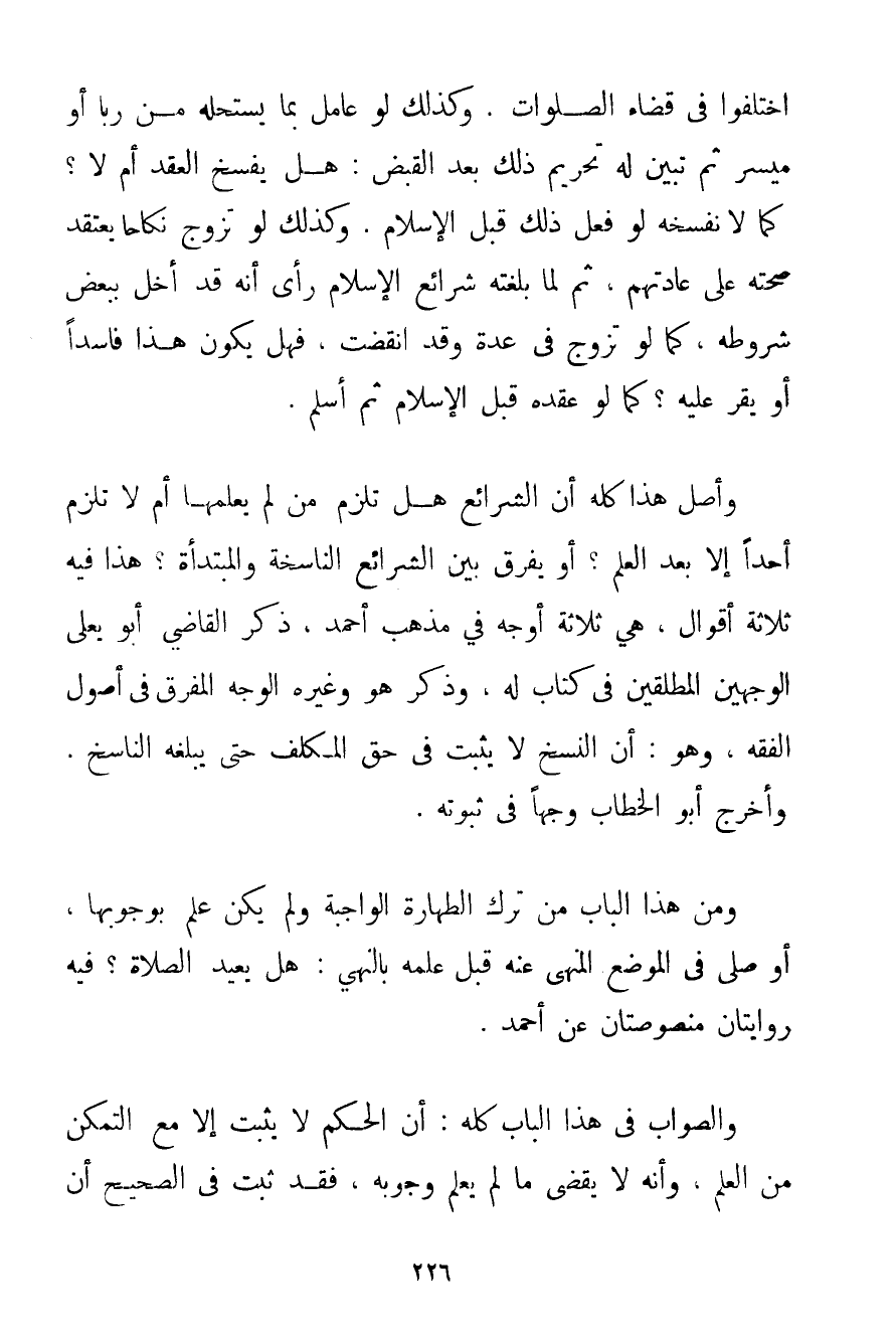 اخْتَلَفُوا فِي قَضَاءِ الصَّلَوَاتِ. وَكَذَلِكَ لَوْ عَامَلَ بِمَا يَسْتَحِلُّهُ مِنْ رِبًا أَوْ مَيْسِرٍ ثُمَّ تَبَيَّنَ لَهُ تَحْرِيمُ ذَلِكَ بَعْدَ الْقَبْضِ: هَلْ يَفْسَخُ الْعَقْدَ أَمْ لَا؟ كَمَا لَا نَفْسَخُهُ لَوْ فَعَلَ ذَلِكَ قَبْلَ الْإِسْلَامِ. وَكَذَلِكَ لَوْ تَزَوَّجَ نِكَاحًا يَعْتَقِدُ صِحَّتَهُ عَلَى عَادَتِهِمْ ثُمَّ لَمَّا بَلَغَتْهُ شَرَائِعُ الْإِسْلَامِ رَأَى أَنَّهُ قَدْ أَخَلَّ بِبَعْضِ شُرُوطِهِ كَمَا لَوْ تَزَوَّجَ فِي عِدَّةٍ وَقَدْ انْقَضَتْ. فَهَلْ يَكُونُ هَذَا فَاسِدًا أَوْ يُقِرُّ عَلَيْهِ؟ كَمَا لَوْ عَقَدَهُ قَبْلَ الْإِسْلَامِ ثُمَّ أَسْلَمَ. وَأَصْلُ هَذَا كُلِّهِ أَنَّ الشَّرَائِعَ هَلْ تَلْزَمُ مَنْ لَمْ يَعْلَمْهَا أَمْ لَا تَلْزَمُ أَحَدًا إلَّا بَعْدَ الْعِلْمِ؟ أَوْ يُفَرِّقُ بَيْنَ الشَّرَائِعِ النَّاسِخَةِ وَالْمُبْتَدَأَةِ؟ هَذَا فِيهِ ثَلَاثَةُ أَقْوَالٍ هِيَ ثَلَاثَةُ أَوْجُهٍ فِي مَذْهَبِ أَحْمَد ذَكَرَ الْقَاضِي أَبُو يَعْلَى الْوَجْهَيْنِ الْمُطْلَقَيْنِ فِي كِتَابٍ لَهُ وَذَكَرَ هُوَ وَغَيْرُهُ الْوَجْهَ الْمُفَرِّقَ فِي أُصُولِ الْفِقْهِ وَهُوَ: أَنَّ النَّسْخَ لَا يَثْبُتُ فِي حَقِّ الْمُكَلَّفِ حَتَّى يَبْلُغَهُ النَّاسِخُ. وَأَخْرَجَ أَبُو الْخَطَّابِ وَجْهًا فِي ثُبُوتِهِ. وَمِنْ هَذَا الْبَابِ مَنْ تَرَكَ الطَّهَارَةَ الْوَاجِبَةَ وَلَمْ يَكُنْ عَلِمَ بِوُجُوبِهَا أَوْ صَلَّى فِي الْمَوْضِعِ الْمَنْهِيِّ عَنْهُ قَبْلَ عِلْمِهِ بِالنَّهْيِ: هَلْ يُعِيدُ الصَّلَاةَ؟ فِيهِ رِوَايَتَانِ مَنْصُوصَتَانِ عَنْ أَحْمَد. وَالصَّوَابُ فِي هَذَا الْبَابِ كُلِّهِ: أَنَّ الْحُكْمَ لَا يَثْبُتُ إلَّا مَعَ التَّمَكُّنِ مِنْ الْعِلْمِ وَأَنَّهُ لَا يَقْضِي مَا لَمْ يَعْلَمْ وُجُوبَهُ فَقَدْ ثَبَتَ فِي الصَّحِيحِ أَنَّ