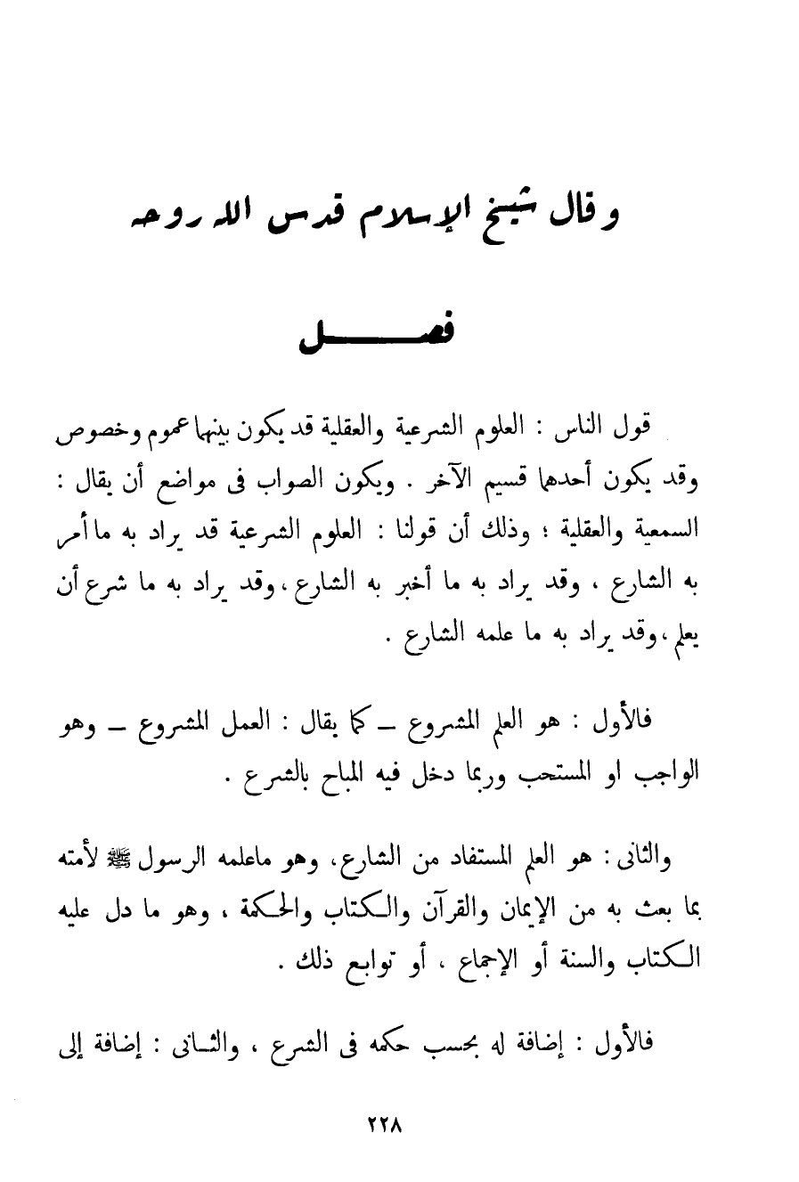 قَوْلُ النَّاسِ: الْعُلُومُ الشَّرْعِيَّةُ وَالْعَقْلِيَّةُ قَدْ يَكُونُ بَيْنَهُمَا عُمُومٌ وَخُصُوصٌ وَقَدْ يَكُونُ أَحَدُهُمَا قَسِيمَ الْآخَرِ. وَيَكُونُ الصَّوَابُ فِي مَوَاضِعَ أَنْ يُقَالَ: السَّمْعِيَّةُ وَالْعَقْلِيَّةُ؛ وَذَلِكَ أَنَّ قَوْلَنَا: الْعُلُومُ الشَّرْعِيَّةُ قَدْ يُرَادُ بِهِ مَا أَمَرَ بِهِ الشَّارِعُ وَقَدْ يُرَادُ بِهِ مَا أَخْبَرَ بِهِ الشَّارِعُ وَقَدْ يُرَادُ بِهِ مَا شَرَّعَ أَنْ يُعْلَمَ وَقَدْ يُرَادُ بِهِ مَا عَلَّمَهُ الشَّارِعُ. فَالْأَوَّلُ: هُوَ الْعِلْمُ الْمَشْرُوعُ - كَمَا يُقَالُ: الْعَمَلُ الْمَشْرُوعُ - وَهُوَ الْوَاجِبُ أَوْ الْمُسْتَحَبُّ وَرُبَّمَا دَخَلَ فِيهِ الْمُبَاحُ بِالشَّرْعِ. وَالثَّانِي: هُوَ الْعِلْمُ الْمُسْتَفَادُ مِنْ الشَّارِعِ وَهُوَ مَا عَلَّمَهُ الرَّسُولُ لِأُمَّتِهِ بِمَا بُعِثَ بِهِ مِنْ الْإِيمَانِ وَالْقُرْآنِ وَالْكِتَابِ وَالْحِكْمَةِ وَهُوَ مَا دَلَّ عَلَيْهِ الْكِتَابُ وَالسُّنَّةُ أَوْ الْإِجْمَاعُ أَوْ تَوَابِعُ ذَلِكَ. فَالْأَوَّلُ: إضَافَةٌ لَهُ بِحَسَبِ حُكْمِهِ فِي الشَّرْعِ وَالثَّانِي: إضَافَةٌ إلَى
